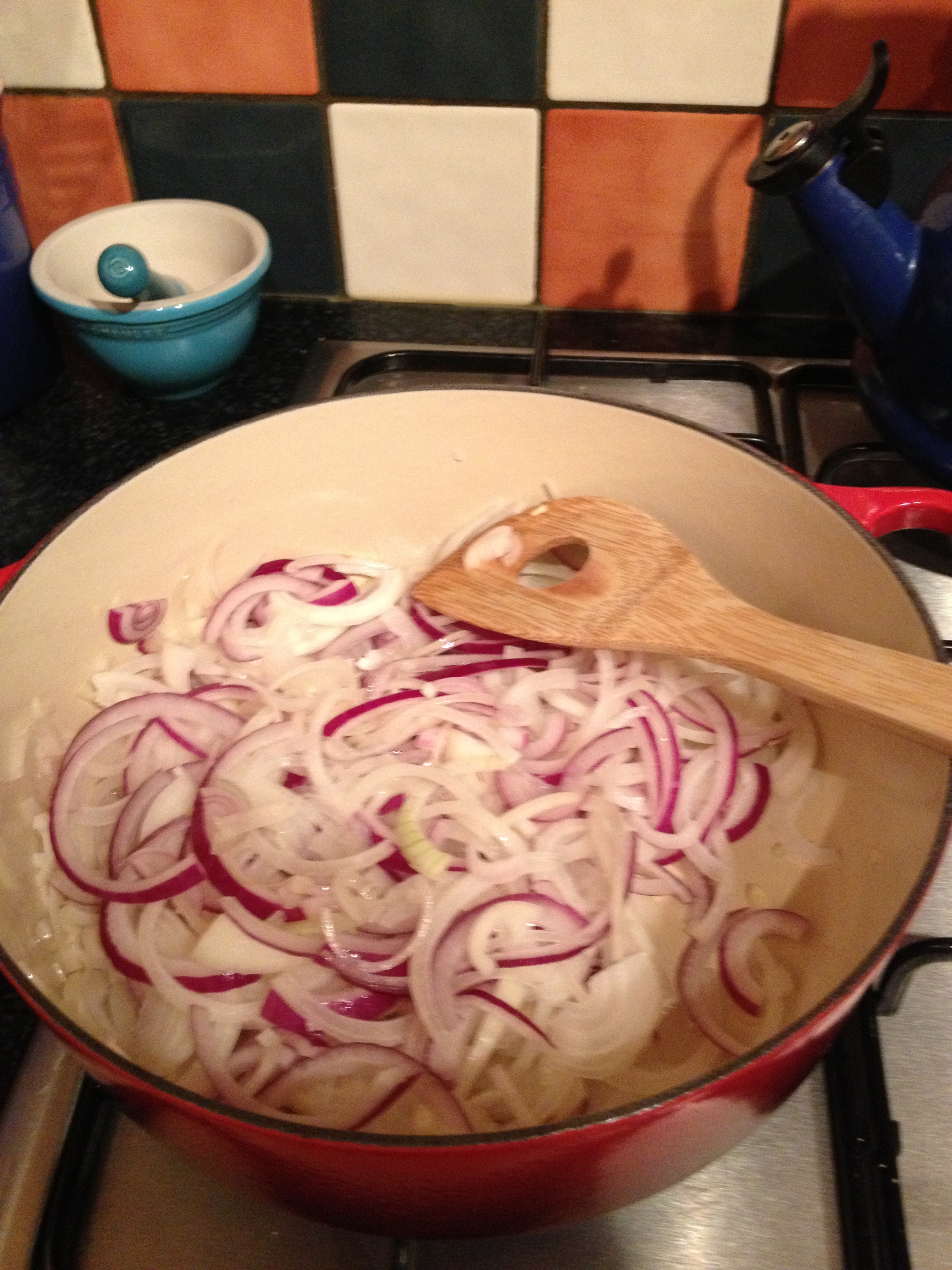 Starting with a pile of onions leftover from our Thanksgiving dinner (done the Sunday before, when everyone actually had off work, since the third Thursday in November is definitely not a holiday over here), we ended up with something satisfying and magical.