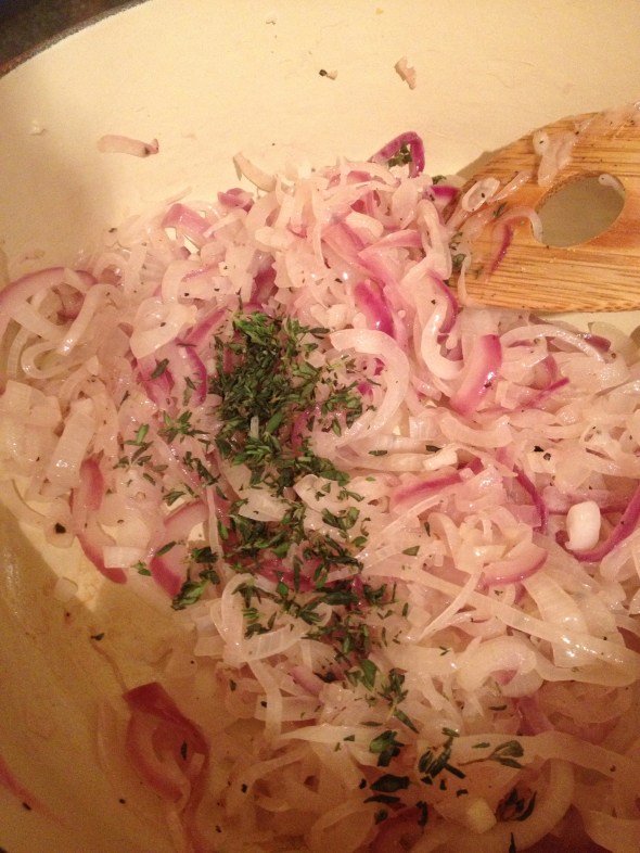 Once the onions are softened, after cooking for about 10 minutes, add the thyme and cracked pepper to allow the flavors to meld with the onion.
