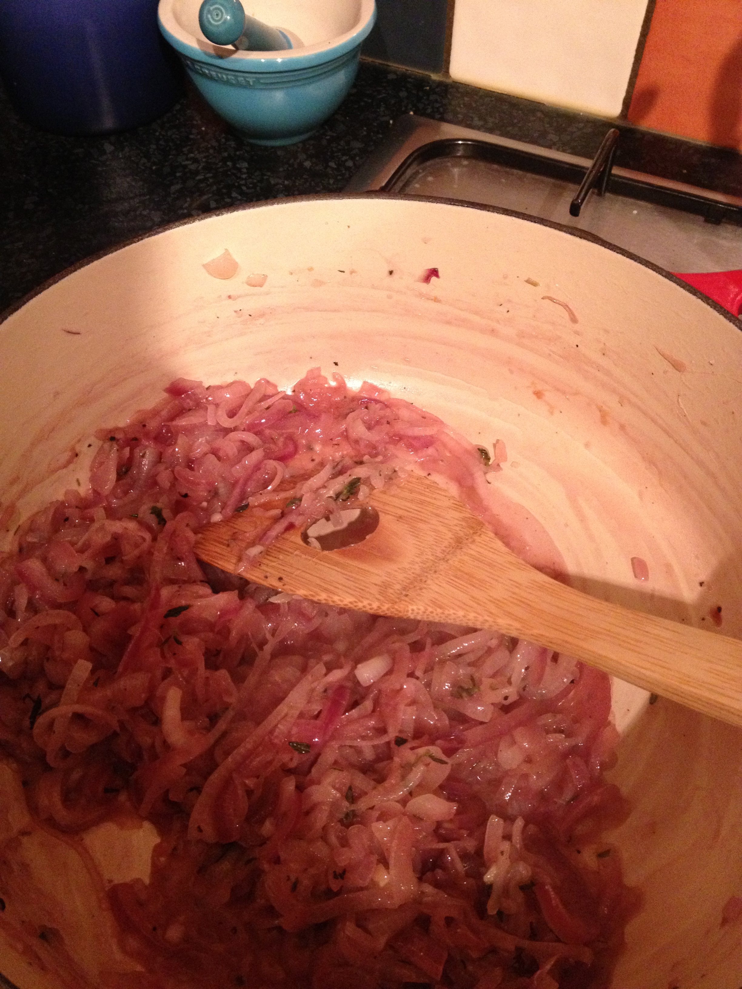 The onions will become gooey and translucent with brown bits sticking to the bottom. This is when it’s time to deglaze, first with sherry then with red wine.