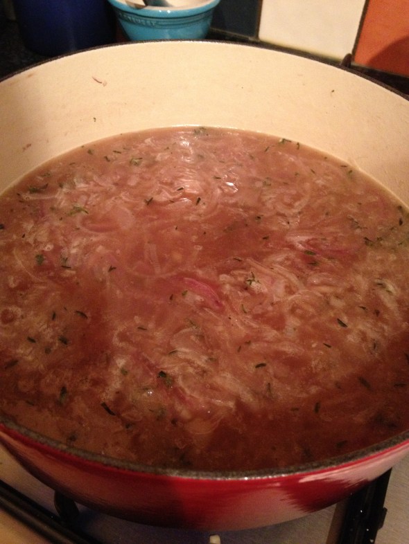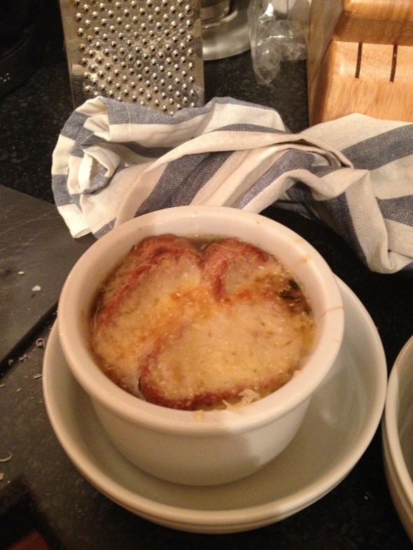 When the temperature dropped Saturday afternoon and the rain started coming down, the last thing my husband and I wanted to do was venture out to restock the fridge. Channeling my dad, I set out to make a masterpiece from junk. A few hours later, we had piping hot bowls of French Onion Soup. Now my soup recipe itself doesn’t take all that long. The issue was we didn’t have bread. We did have an amazing French Comté cheese (the French powerhouse equivalent to Gruyere) that I had brought back on the Eurostar, so making bread seemed a bit more worth it. Packet of yeast, pinch of salt, pinch of sugar, one part water to three parts flour and presto — bread. But I’ll save that recipe for another day. For now you can just use a crusty, if not stale, baguette.