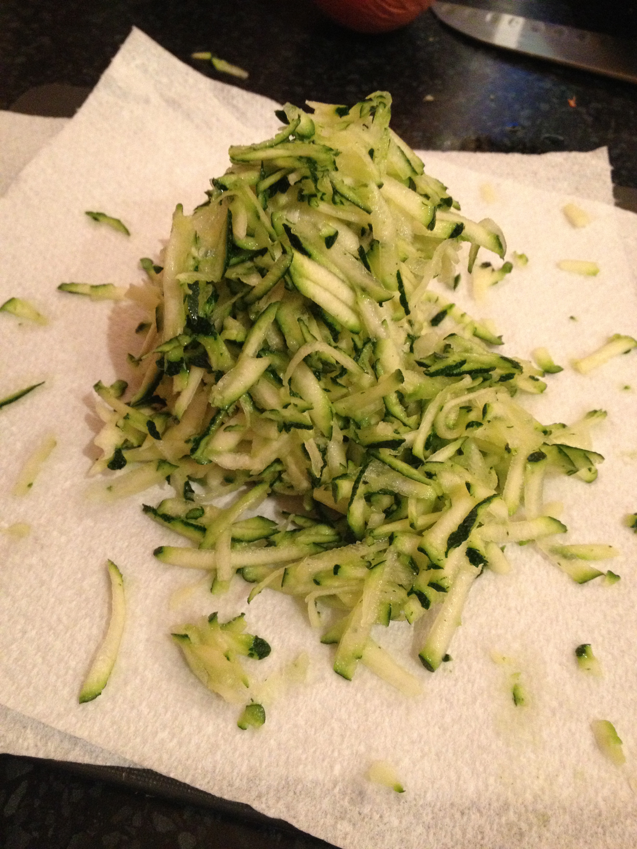 Grate the zucchini, using a box grater. Squeeze out the excess liquid by place the zucchini in either a clean dishcloth or paper towels and ringing over the sink. Reserve.