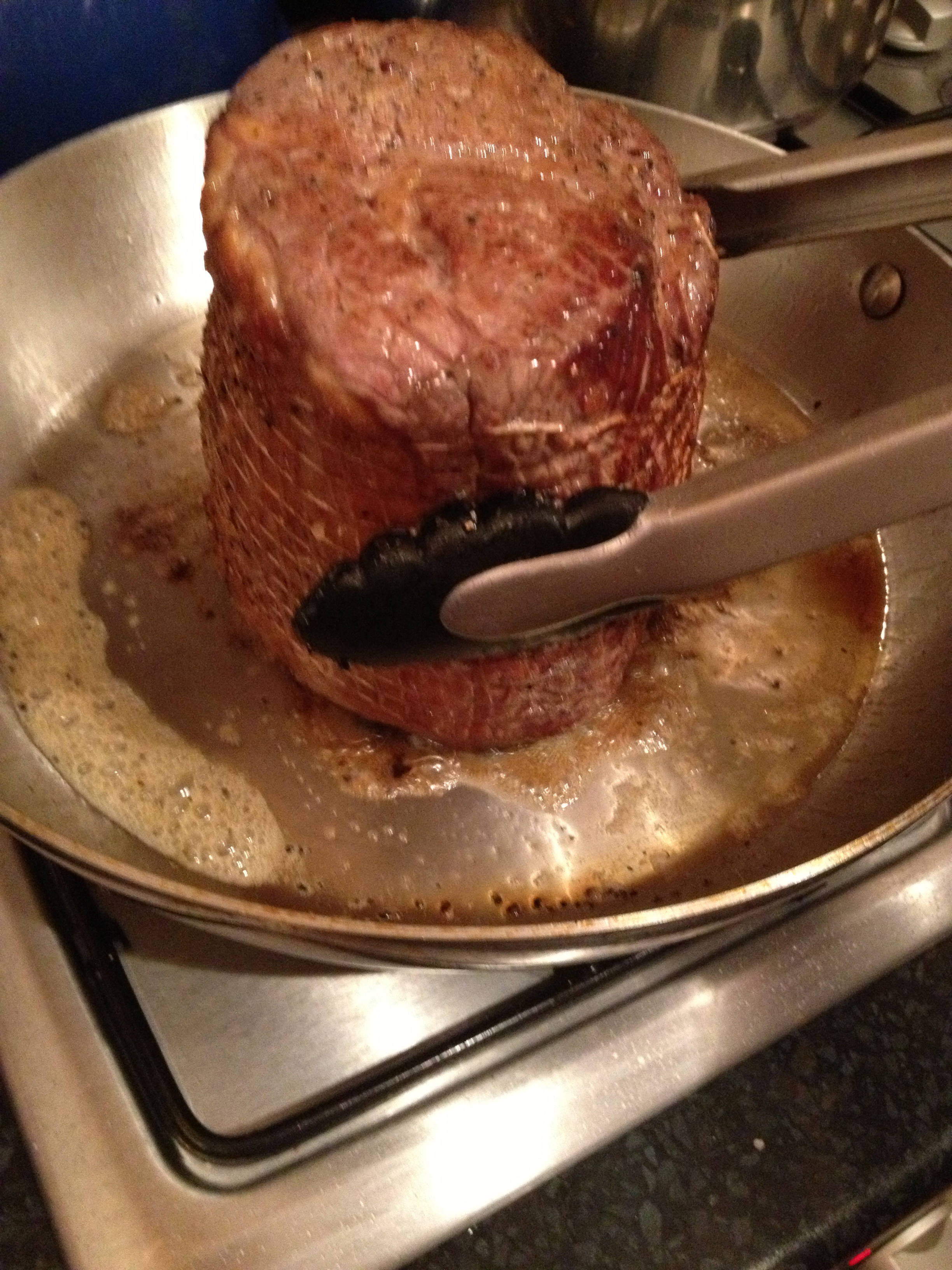 Once the beef has reached your desired temperature (I usually take it out at 145˚F for medium-rare to medium), allow it to rest. Drain off any excess fat, while keeping the juices, and make a pan sauce.