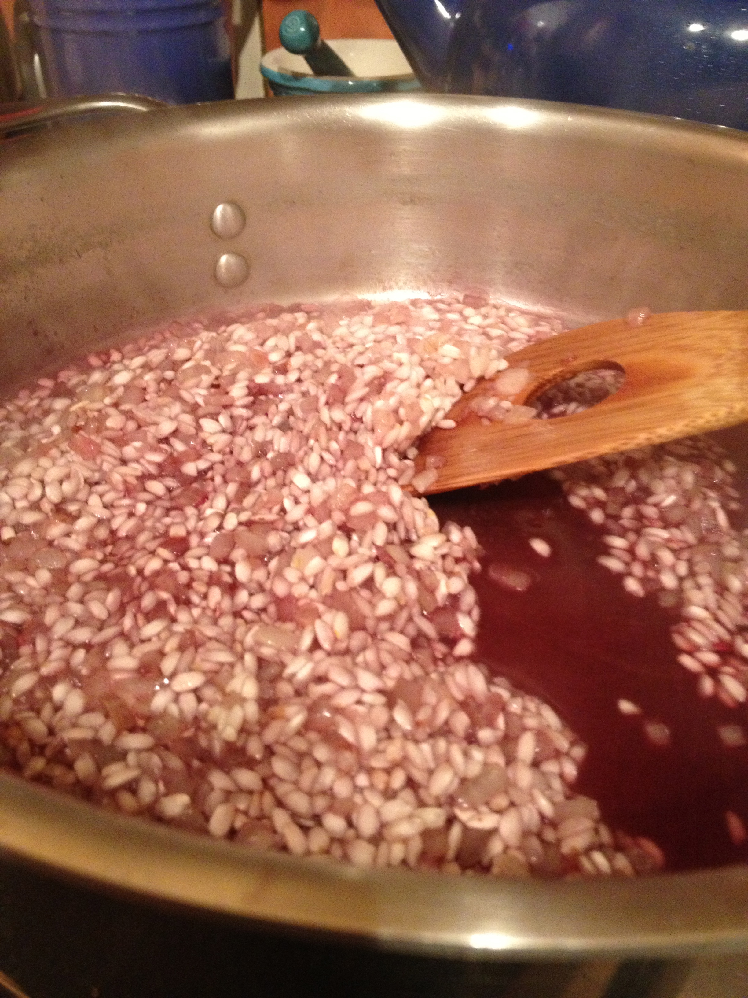 While the beef roasts, prepare the risotto. The red wine (instead of white) adds both a nice purple hue to the rice and a deep dry fruit undertone that pairs with a hearty beef.