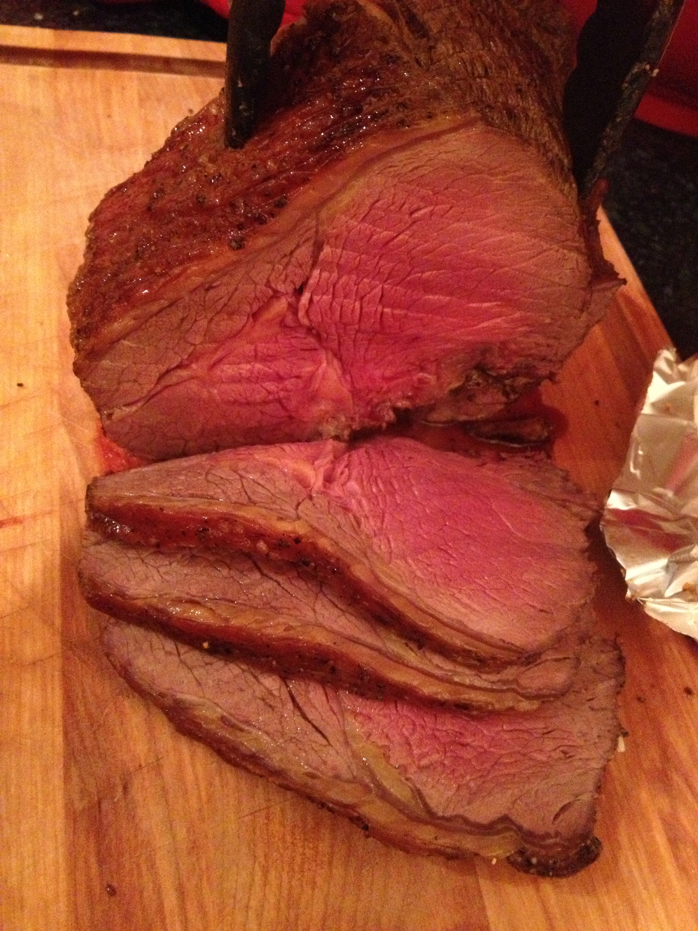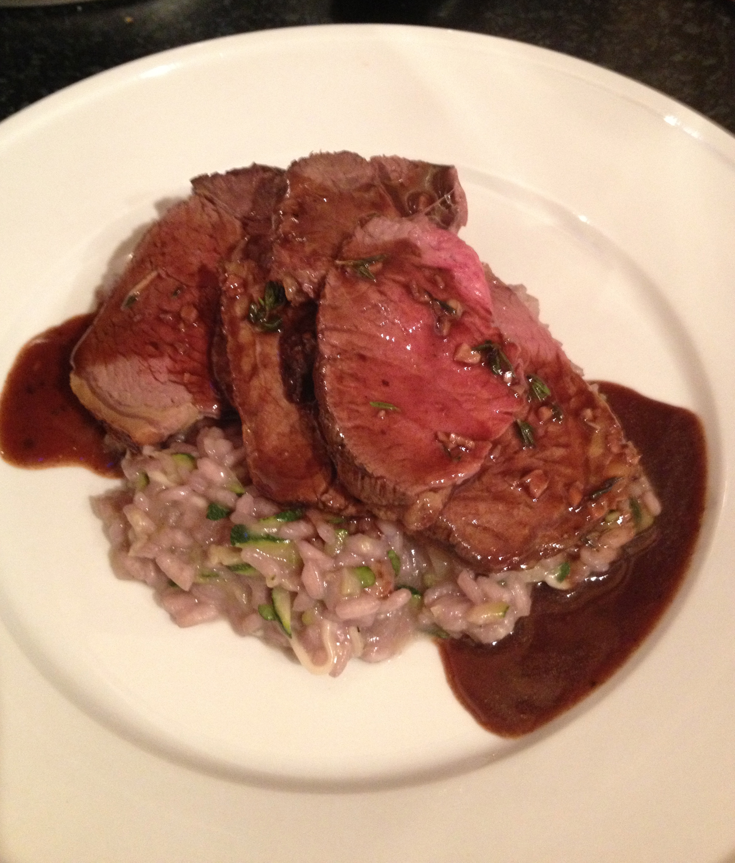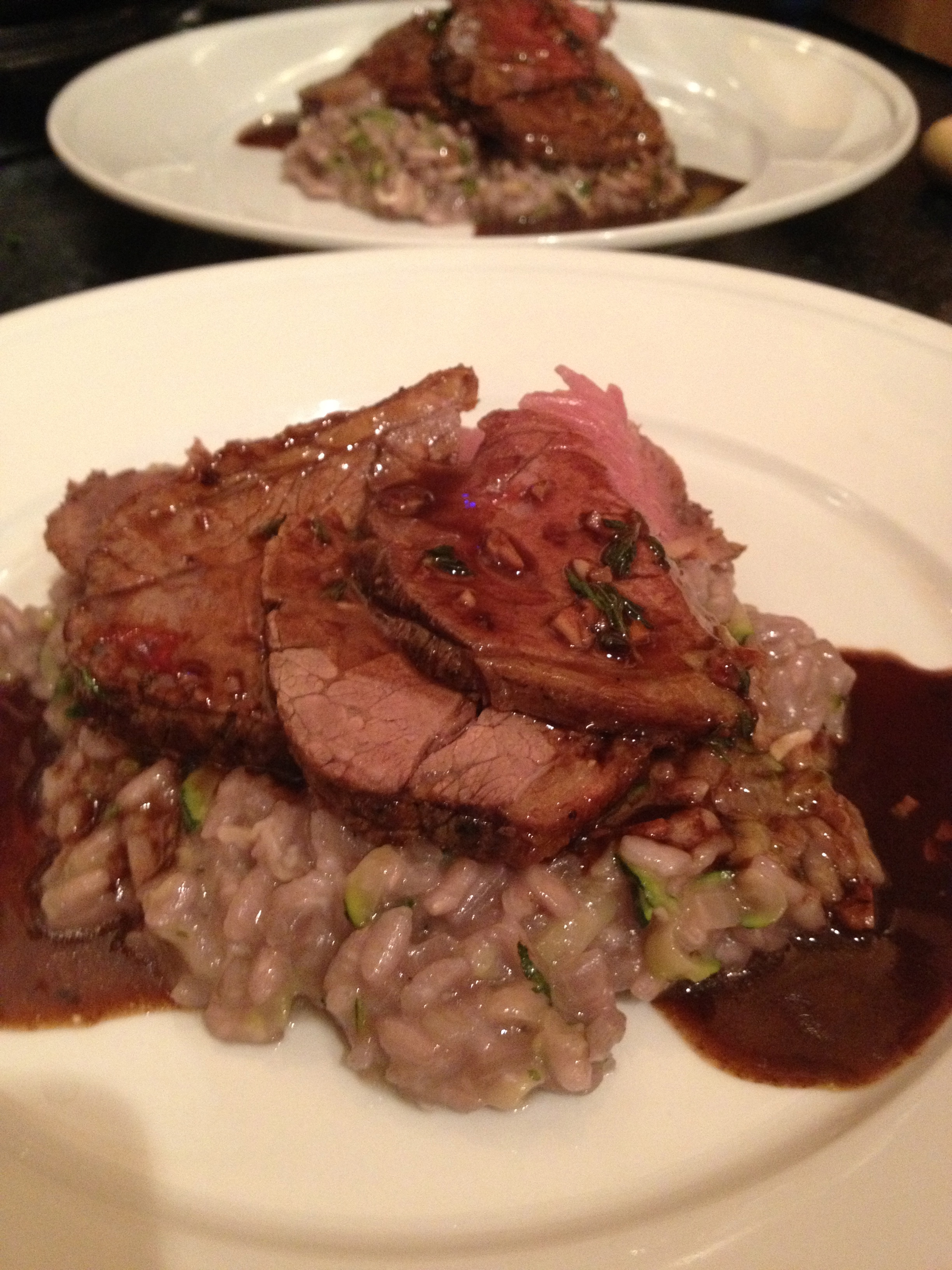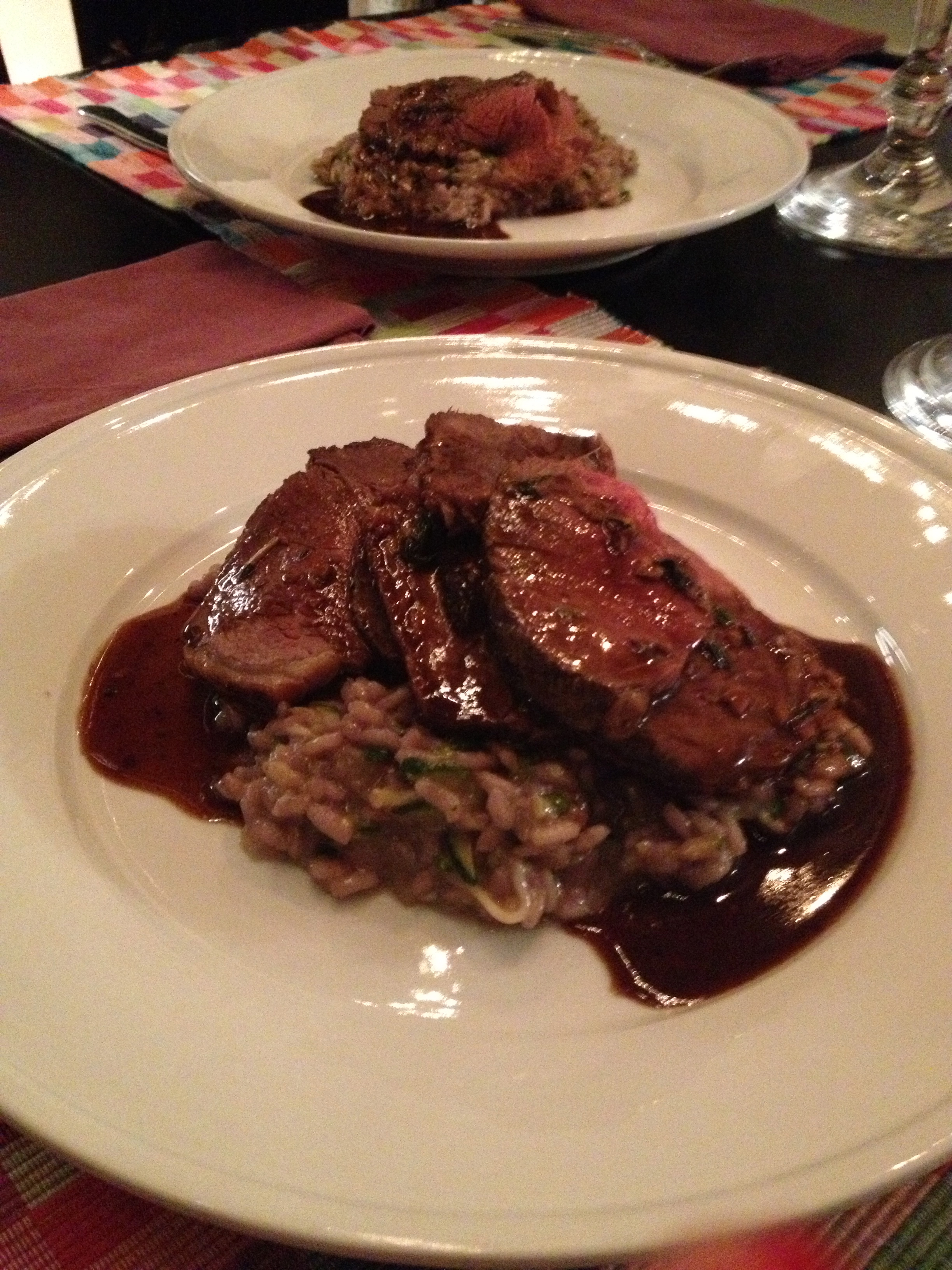 So here it is: Roast Beef with a Red Wine Pan Sauce over Zucchini and Gruyere Risotto. I obviously got the brain working at some point to come up with this one.