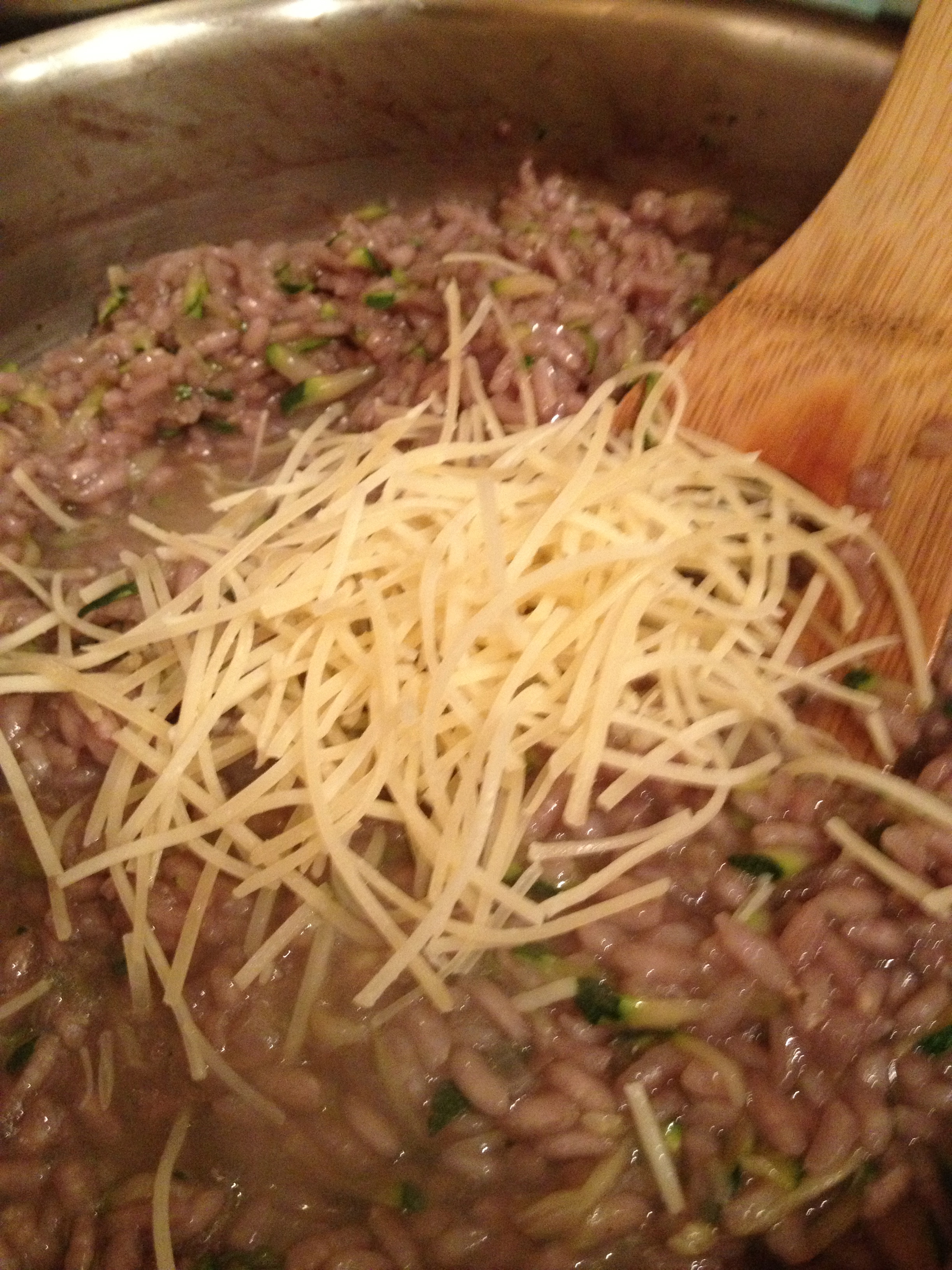 Stir the zucchini into the rice and continue adding the broth. Once you have only 1/3 cup of broth left, add the grated gruyere cheese. Mix with the remaining broth and cook for 2 more minutes until it begins to absorb.
