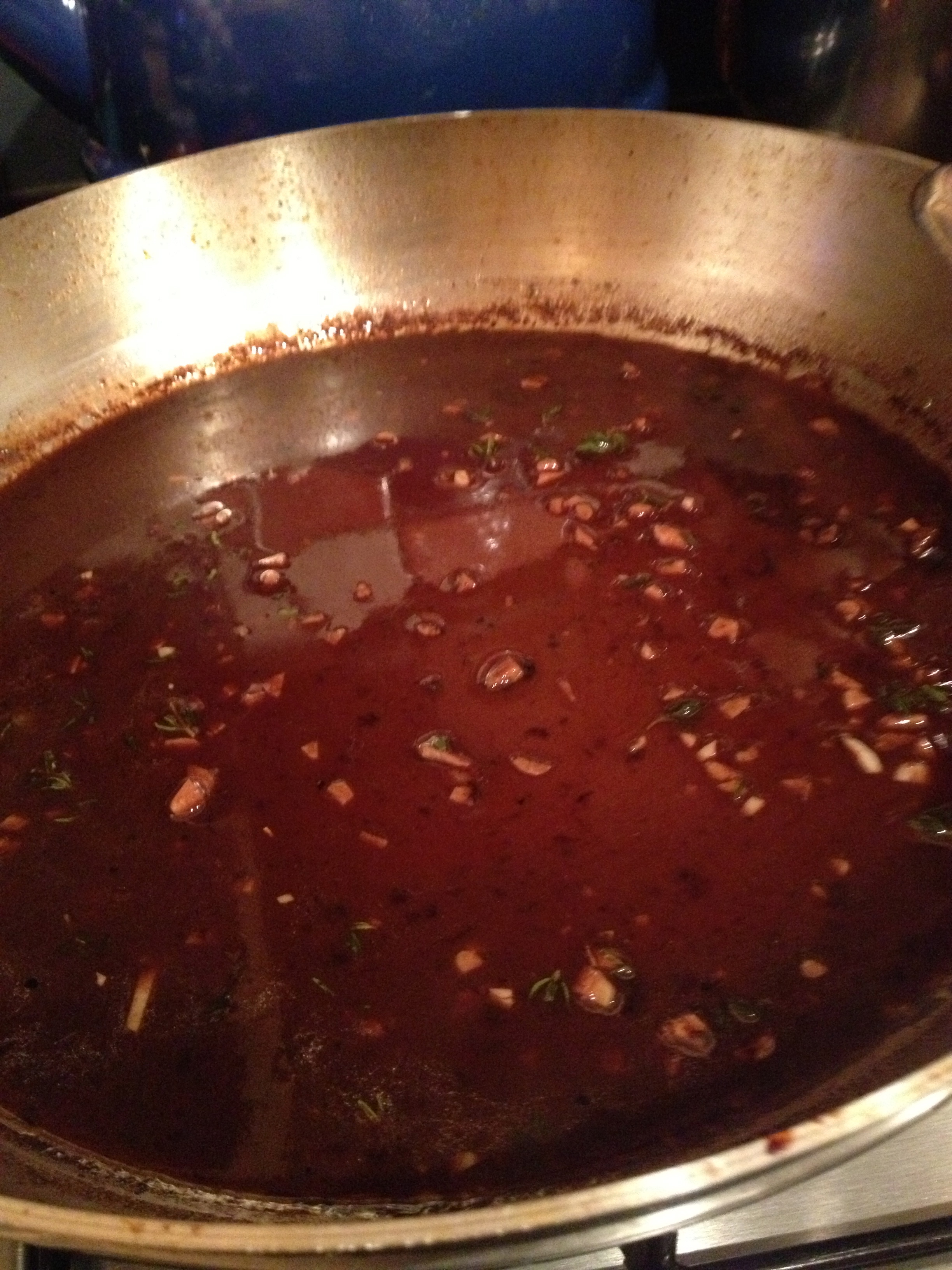 Over medium heat, deglaze the pan with red wine. Add the garlic and thyme to sauté for 3 minutes. Add the beef broth and simmer until the sauce reduces by half.