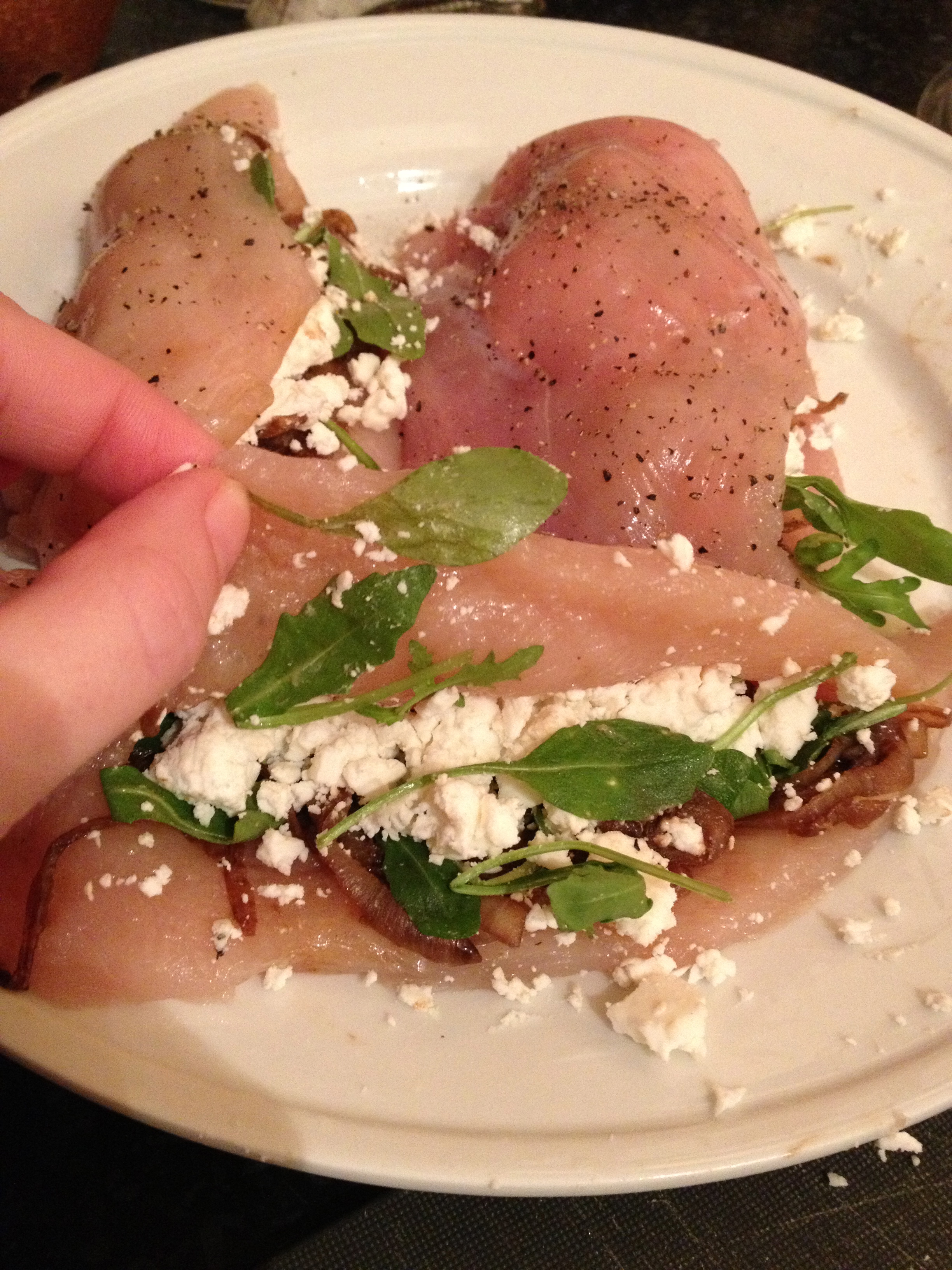 Be sure to pound the chicken so that it is of an even thickness, then carefully cut a pocket into each breast. Fill with the onions, goat cheese, and arugula.