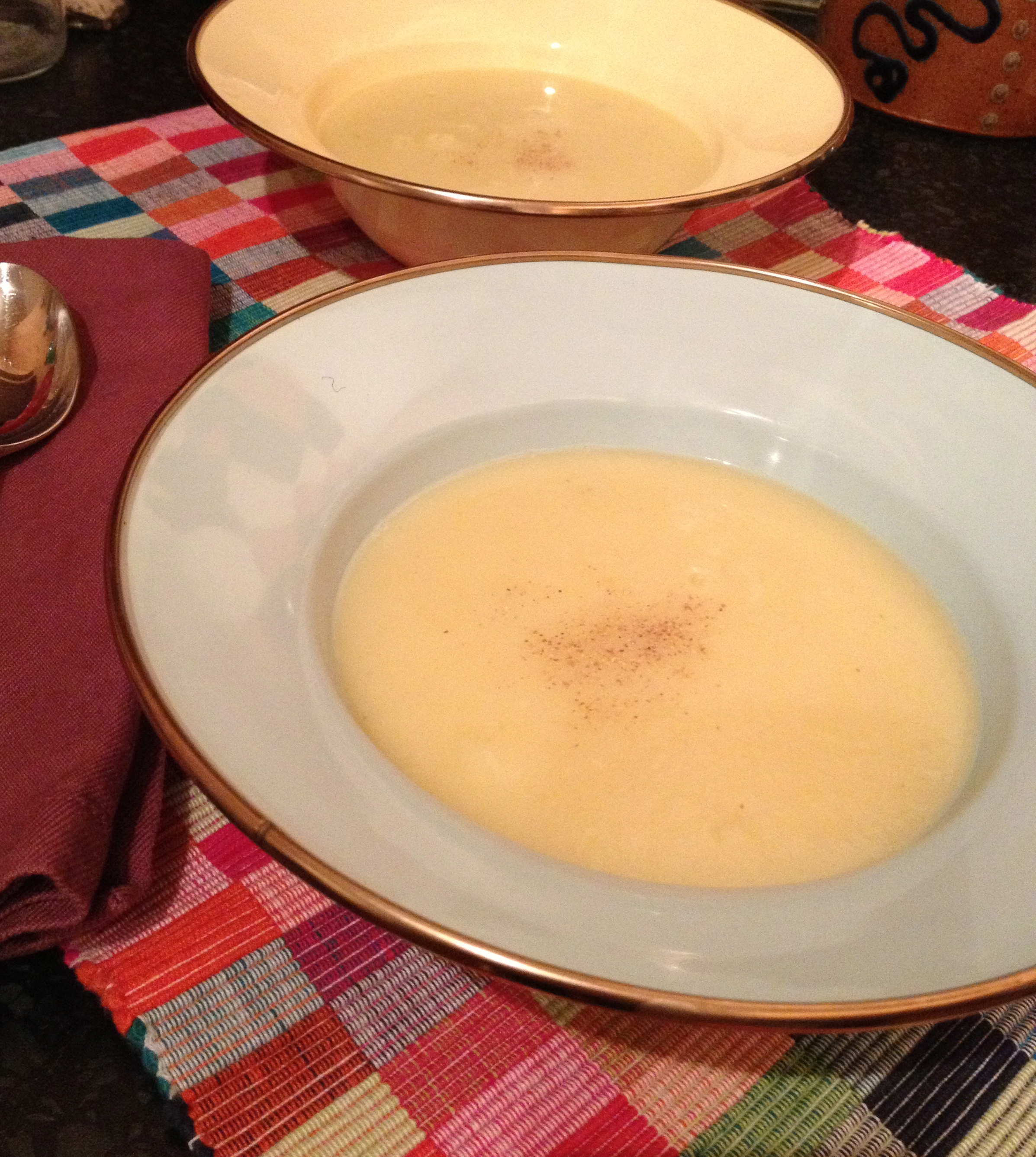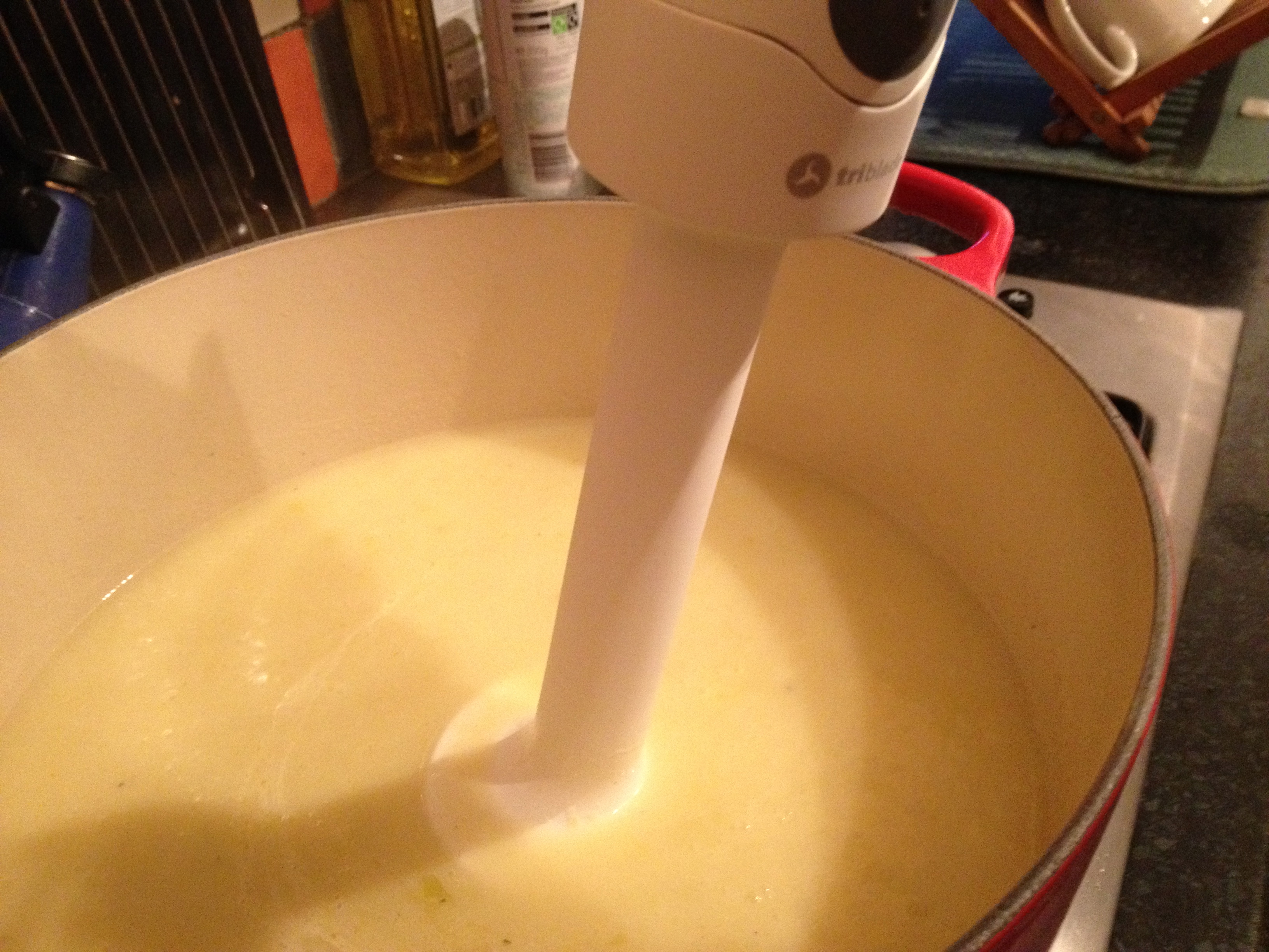 Using a hand blender (or pouring the soup in batches into a blender), puree the soup until there are no lumps and it is very smooth and creamy.