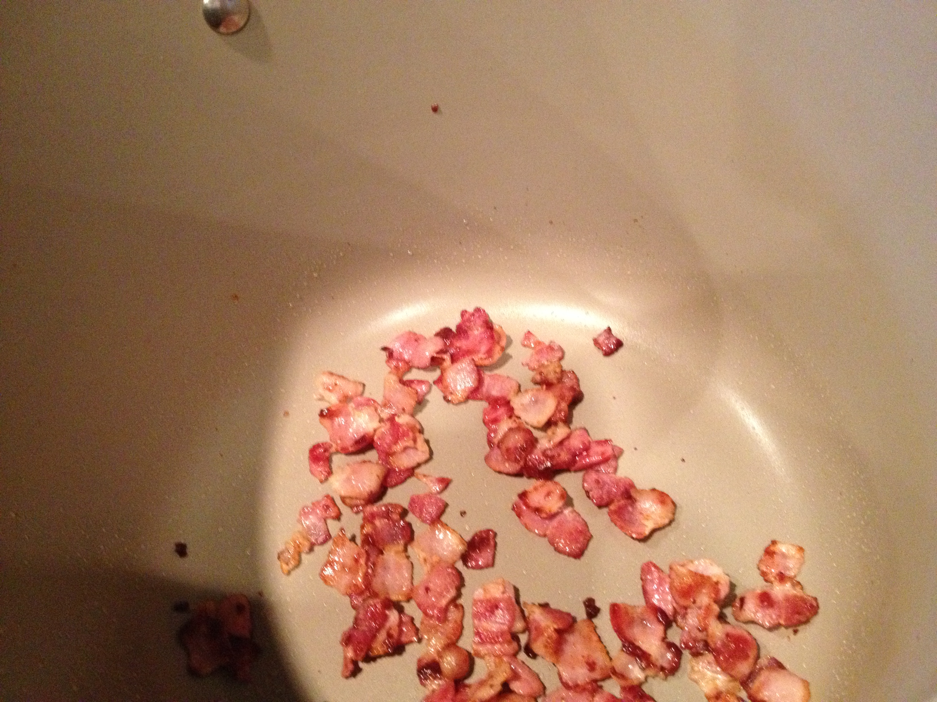 I start by crisping bacon in the base of a soup pot. Reserve the bacon for a yummy crumbly topping (or if you plan to freeze the soup, just stir it back in at the end).