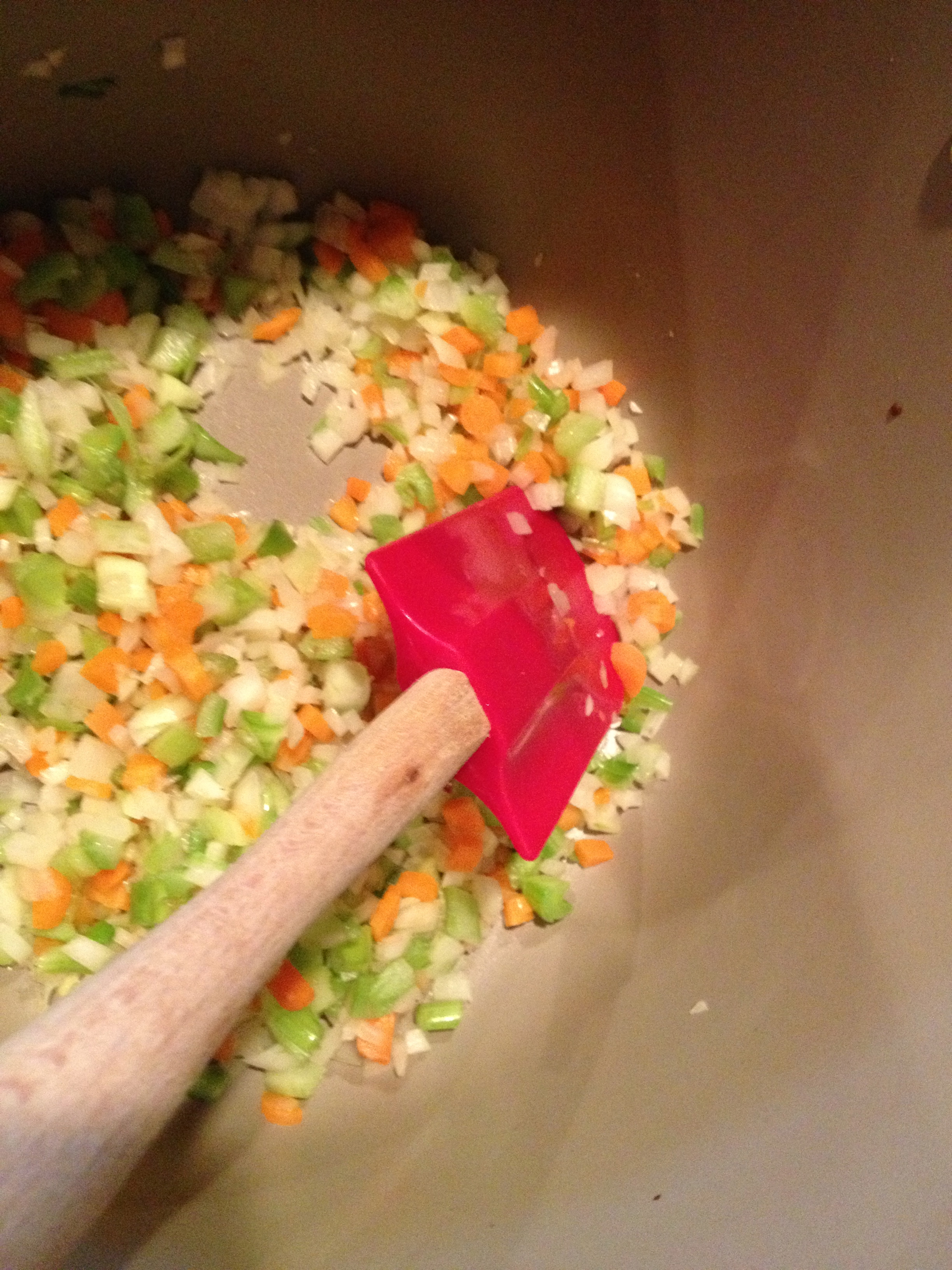 In a small amount of the bacon drippings, sauté onion, carrot, and celery until it has softened.