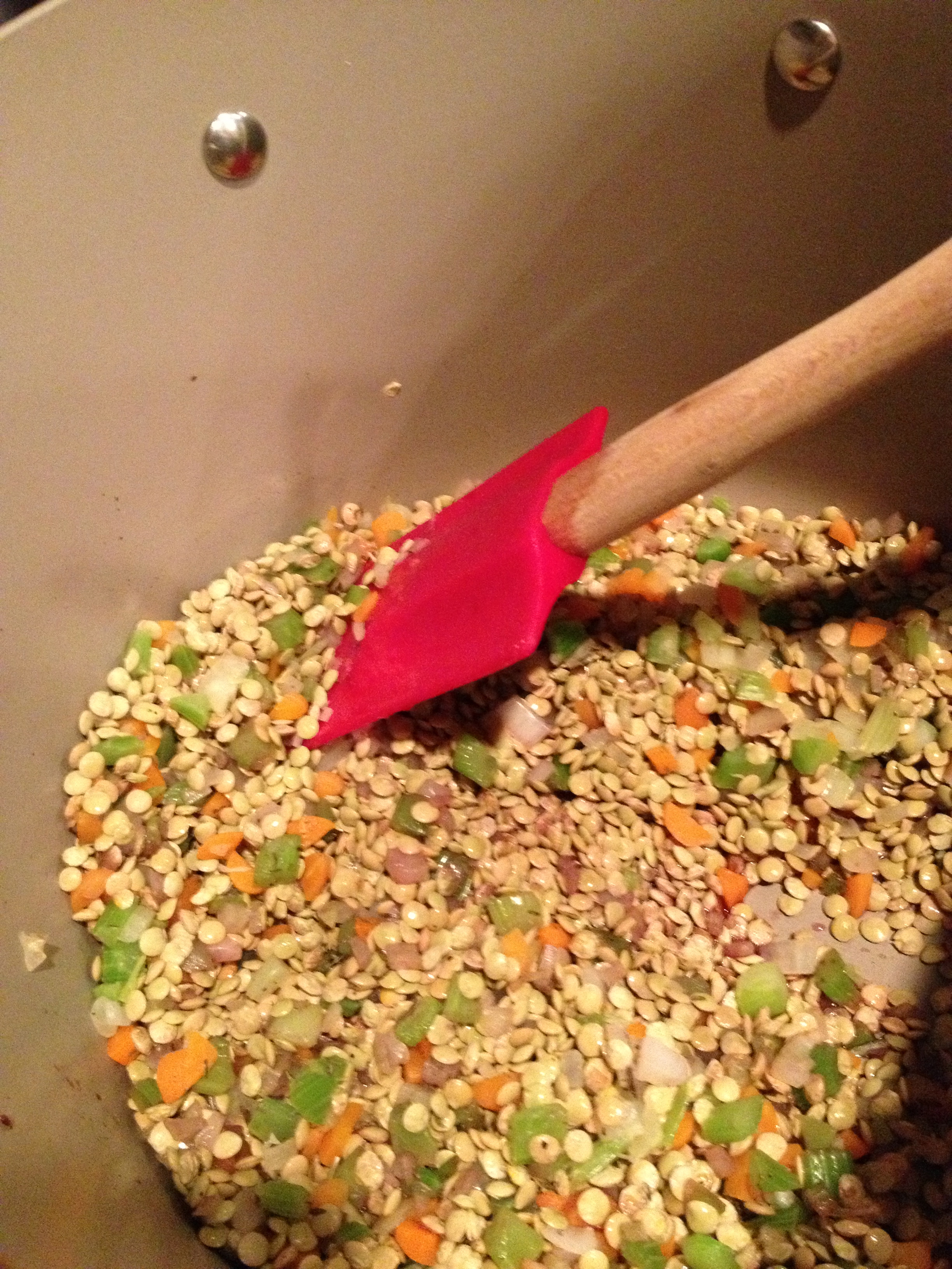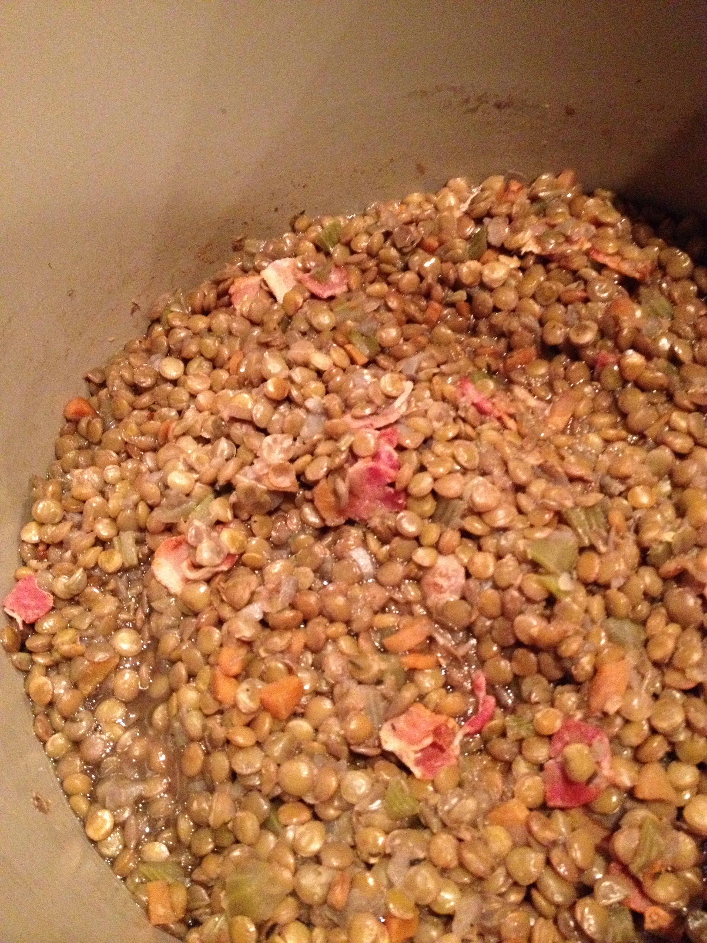 Drain off all but ½ Tbs of bacon grease. Return soup pot to the stove over medium heat. Add onions, carrot, and celery to the pot. Sauté for 5 minutes. Then mix in the lentils, thyme, and pepper.