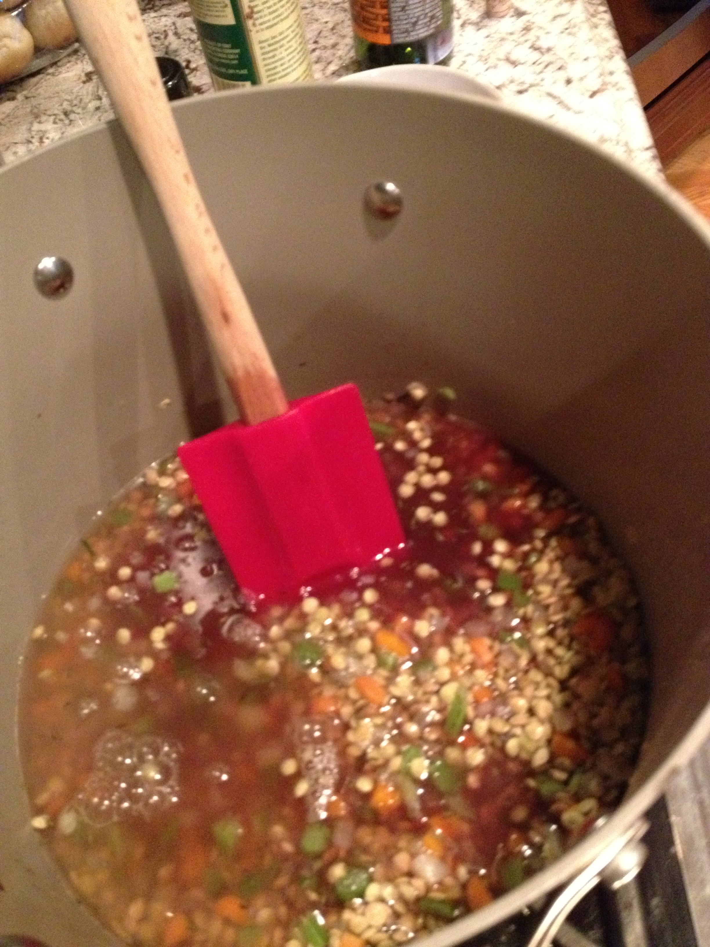 Add the lentils, thyme, and pepper. Hold off on seasoning with salt, as the bacon and broth may be enough for your taste. Then add some red wine, because what soup isn’t better with a boozy base?