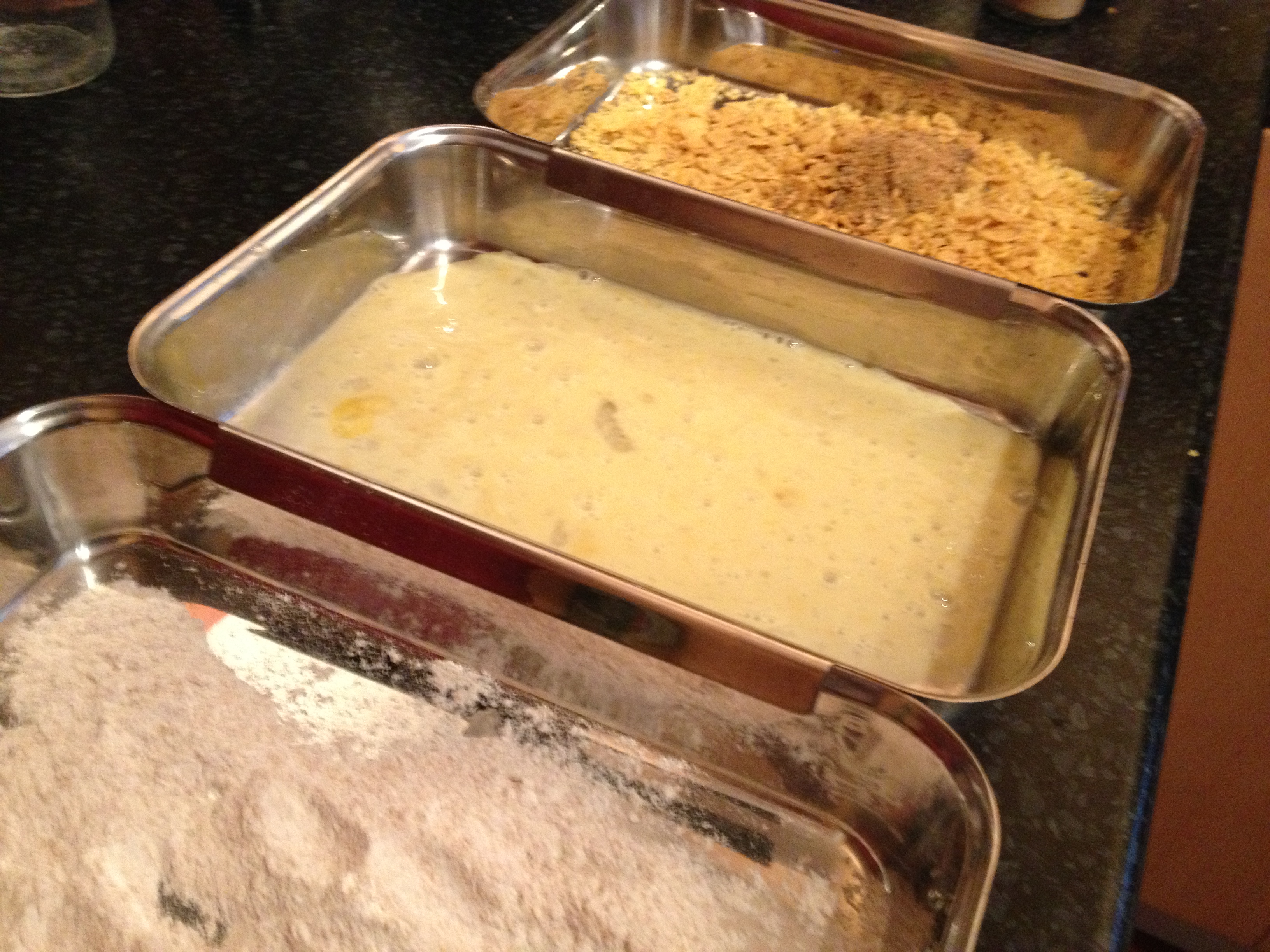 Start by setting up your breading station. My breading dishes are from Williams-Sonoma, but you can certainly use three large shallow bowls.