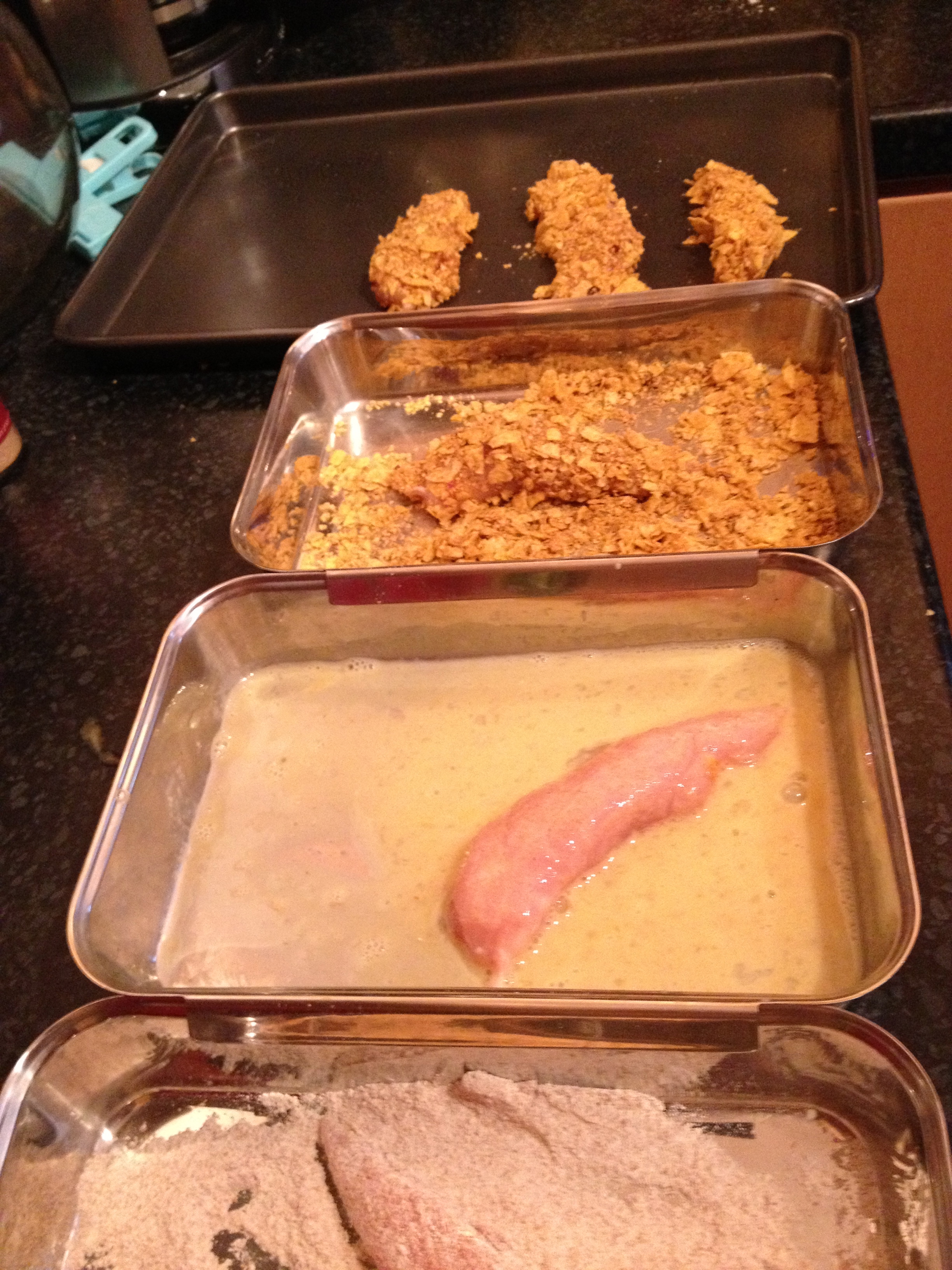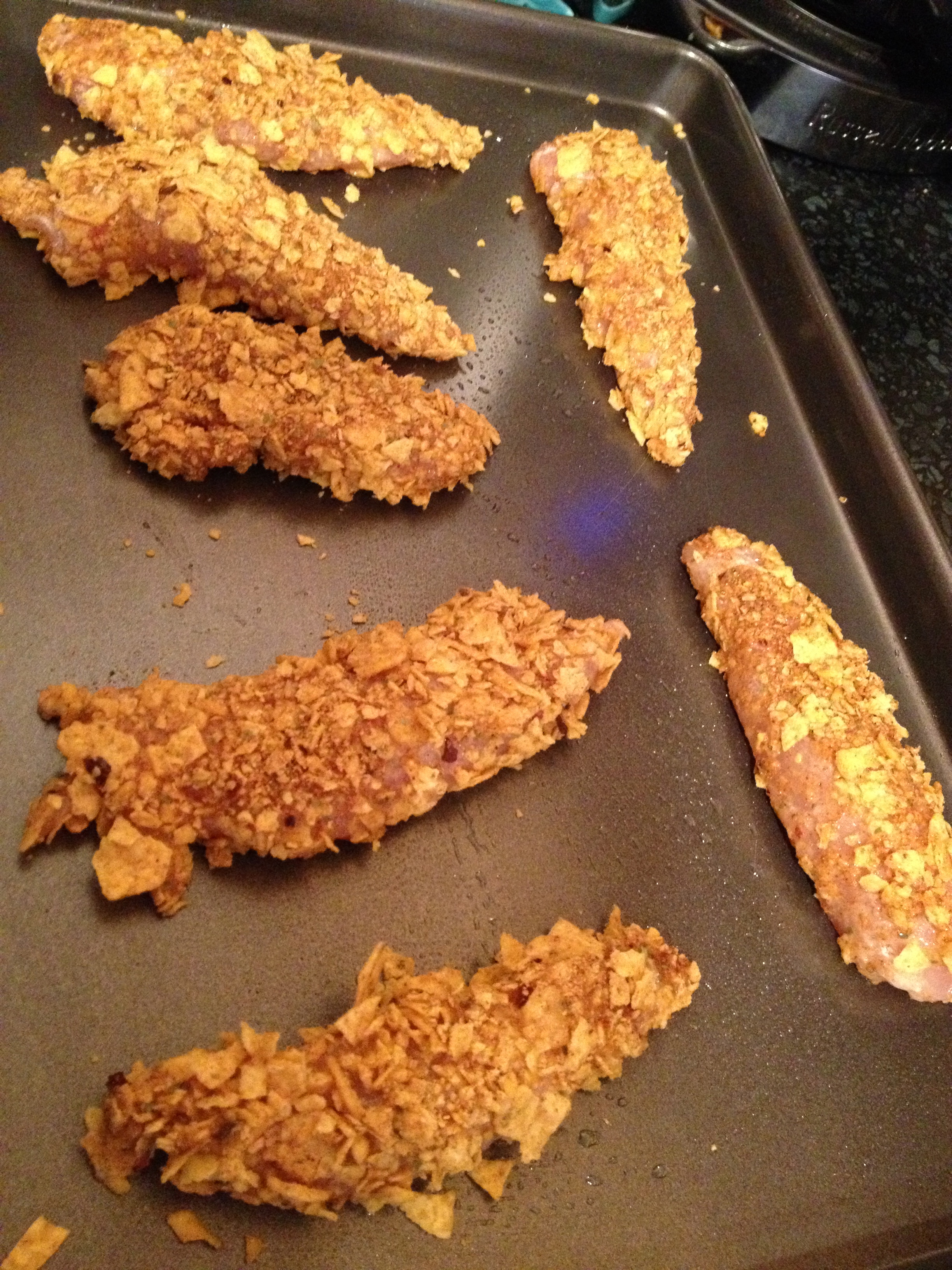 Dredge each chicken finger in the flour and shake off the excess. Dip into the egg and then the tortillas. Place on a greased baking sheet.