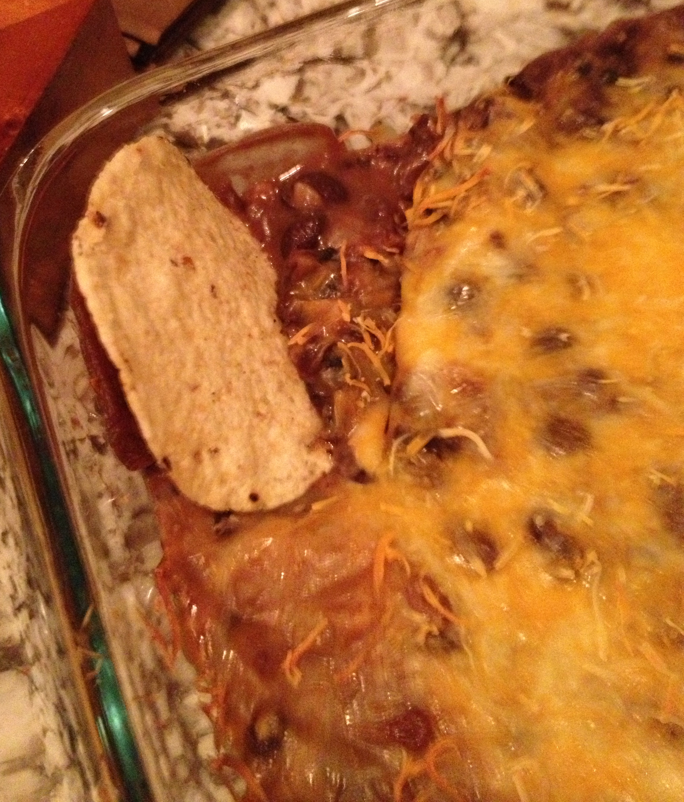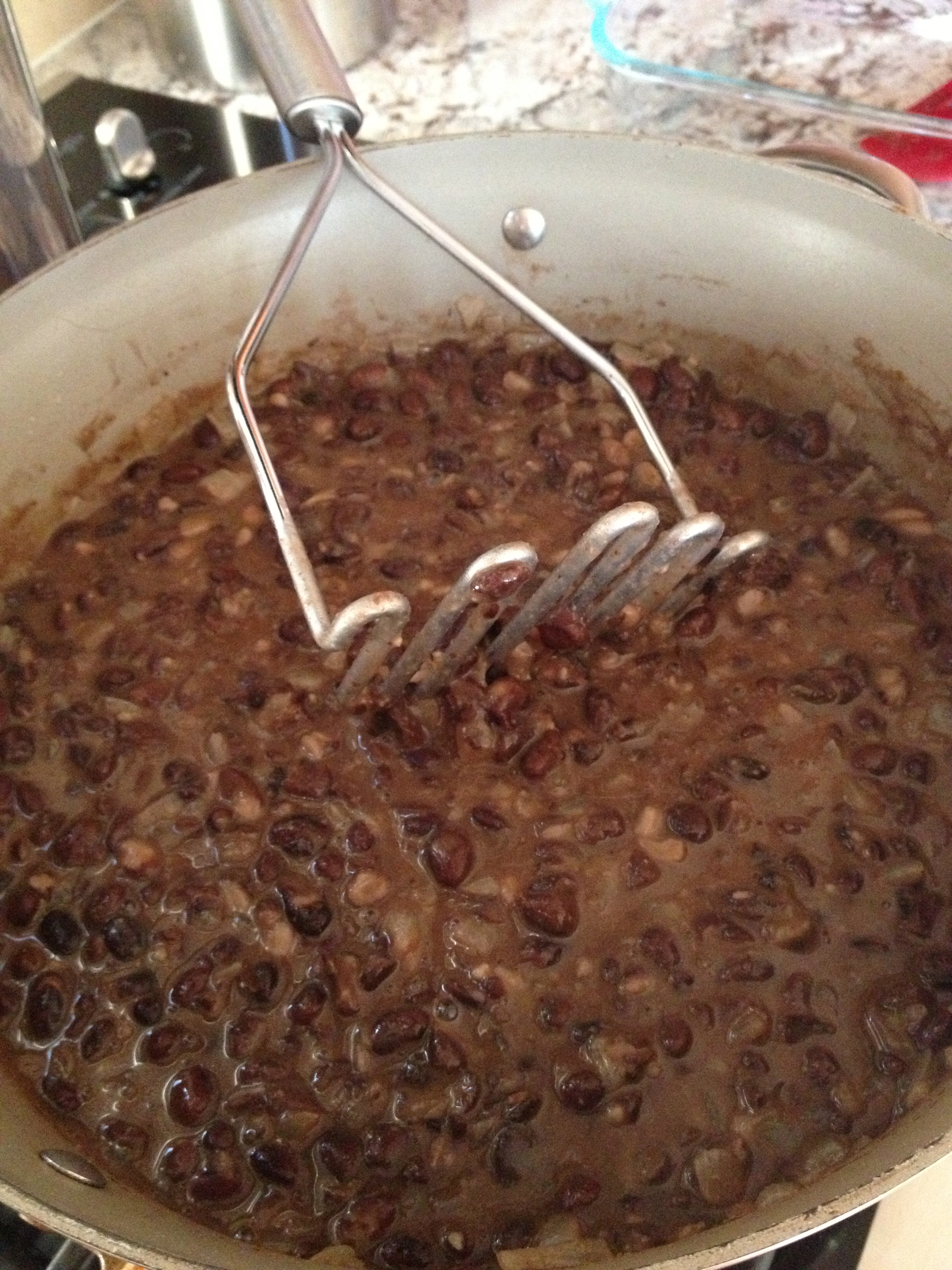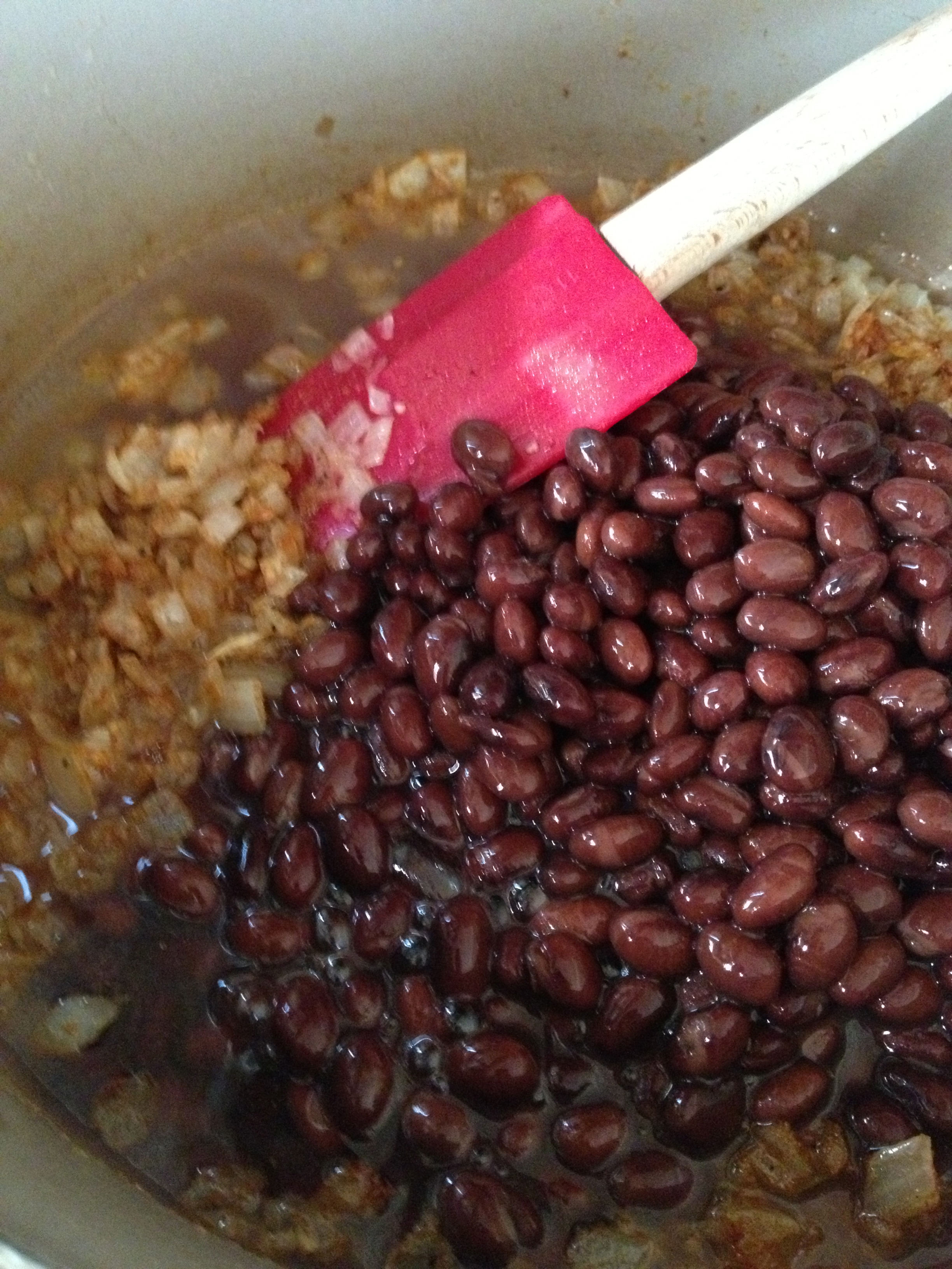 Pour in the cans of black beans, including the liquid. Mix with the onions, turn heat up to medium and simmer for 5 minutes. Using a potato masher, mash the bean mixture, until mostly smooth. There will still be some chunky beans.
