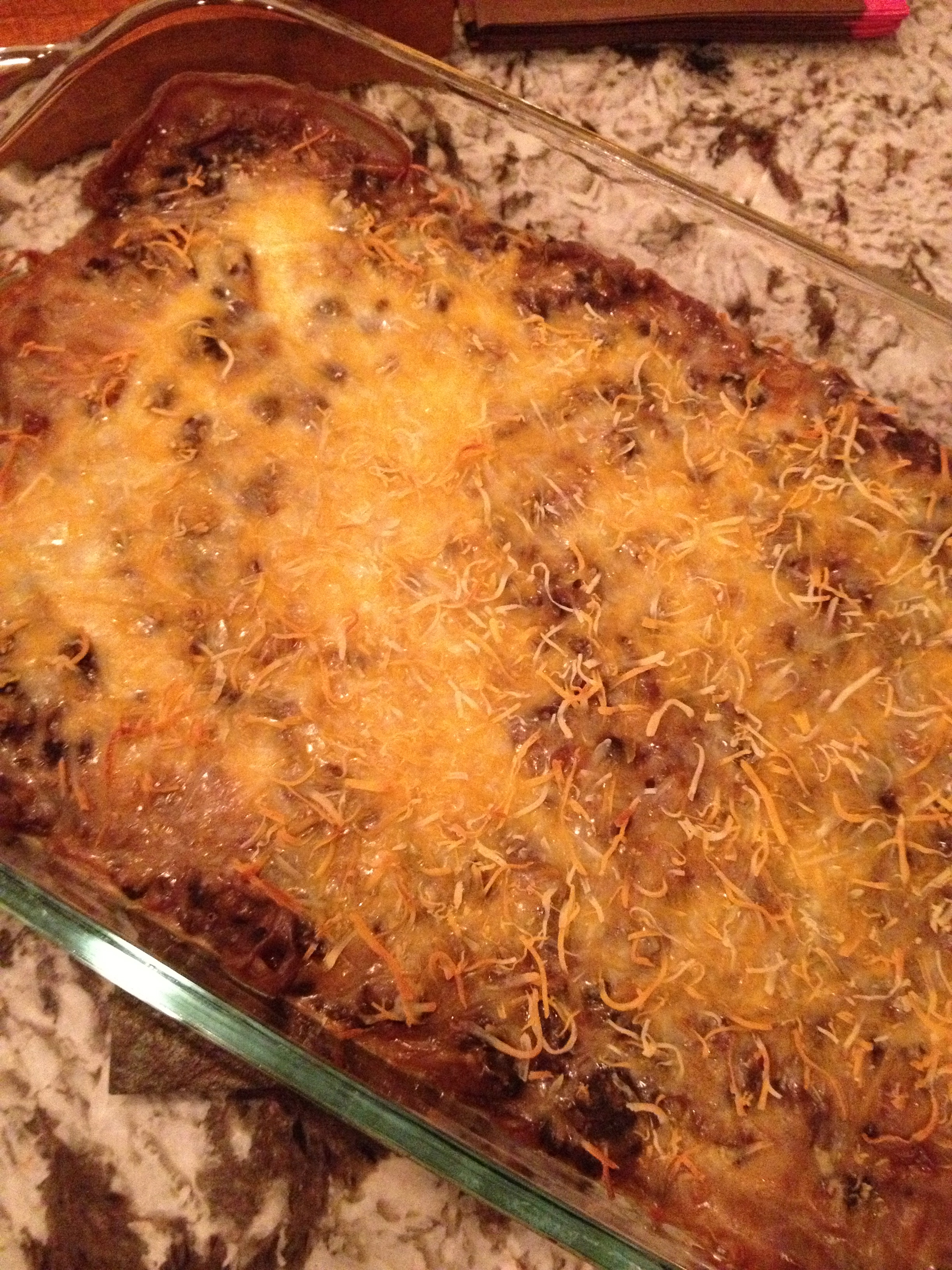 Pour into a baking dish, cover with yummy delicious cheese, and bake for 15 minutes.