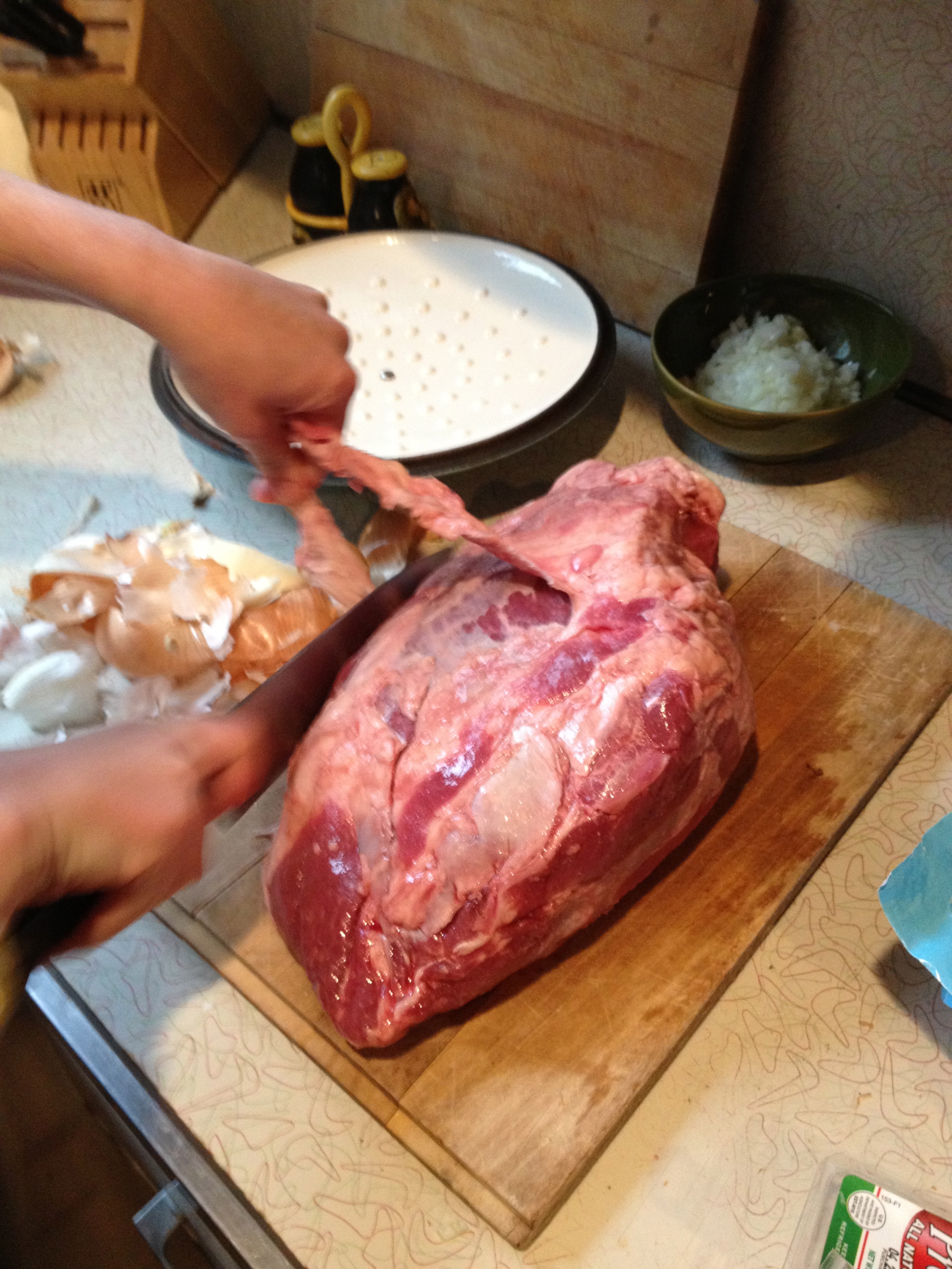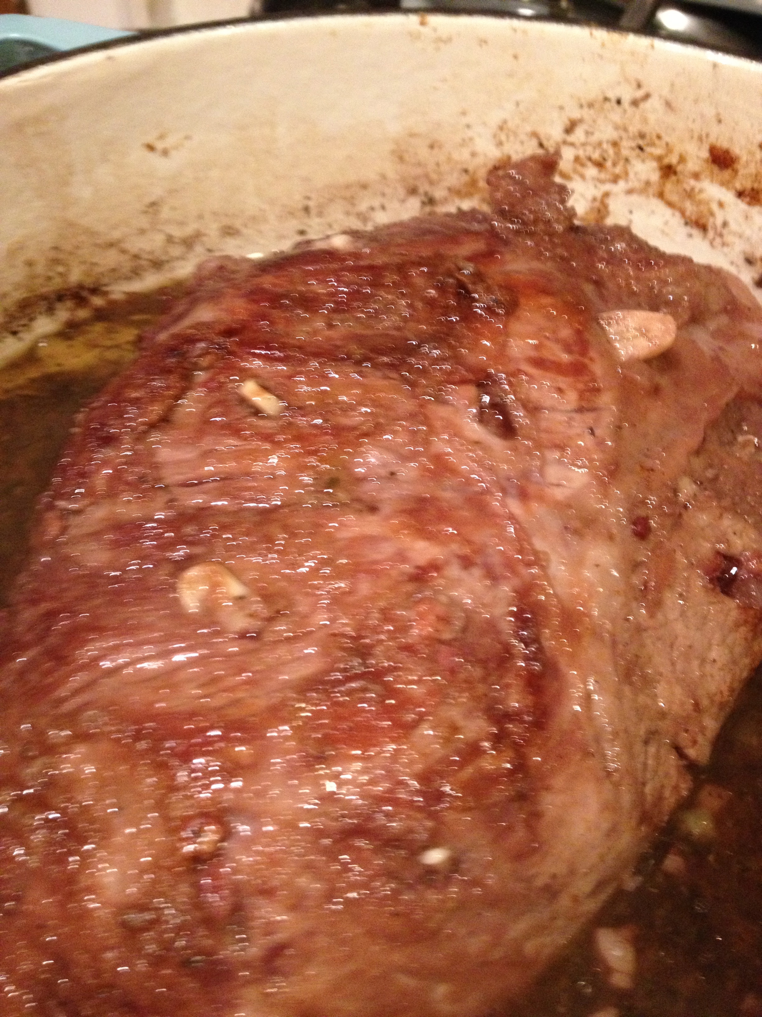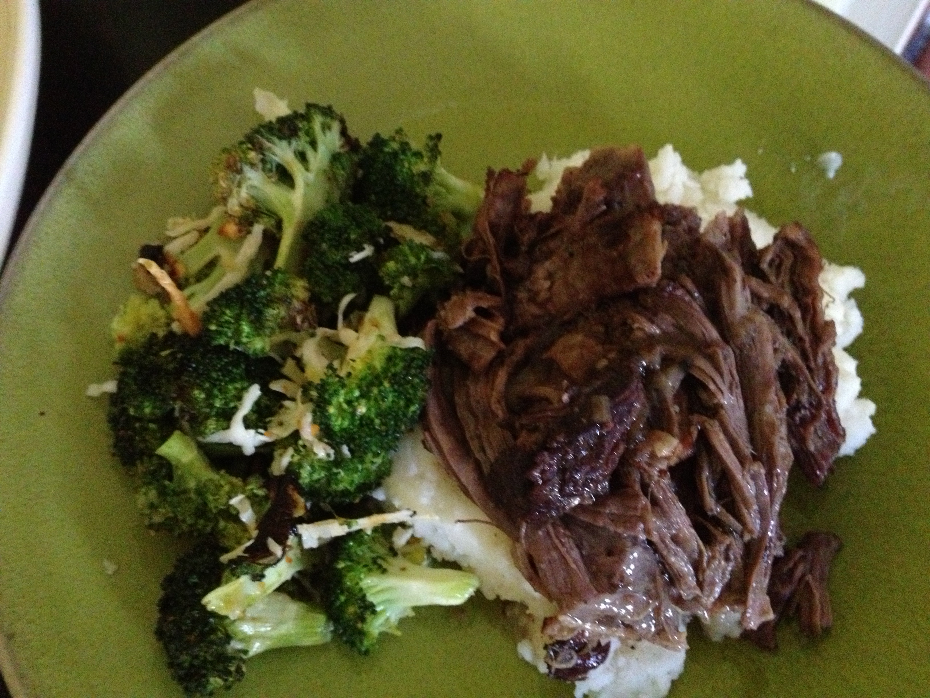 Although I was tempted to just grab one last slice of NY pizza, I knew we should have a square meal before an overnight flight with yucky airplane food. So I took matters into my own hands and managed to cook a spread for 18 people with ease. All it took was a bit of forethought. I kept the menu simple: braised beef, mashed potatoes, and roasted broccoli. I’ve provided the recipe for 8 people but to feed a crowd, double all the ingredients, use a 6-7 pound beef shoulder, and add about 45 minutes to the cooking time.