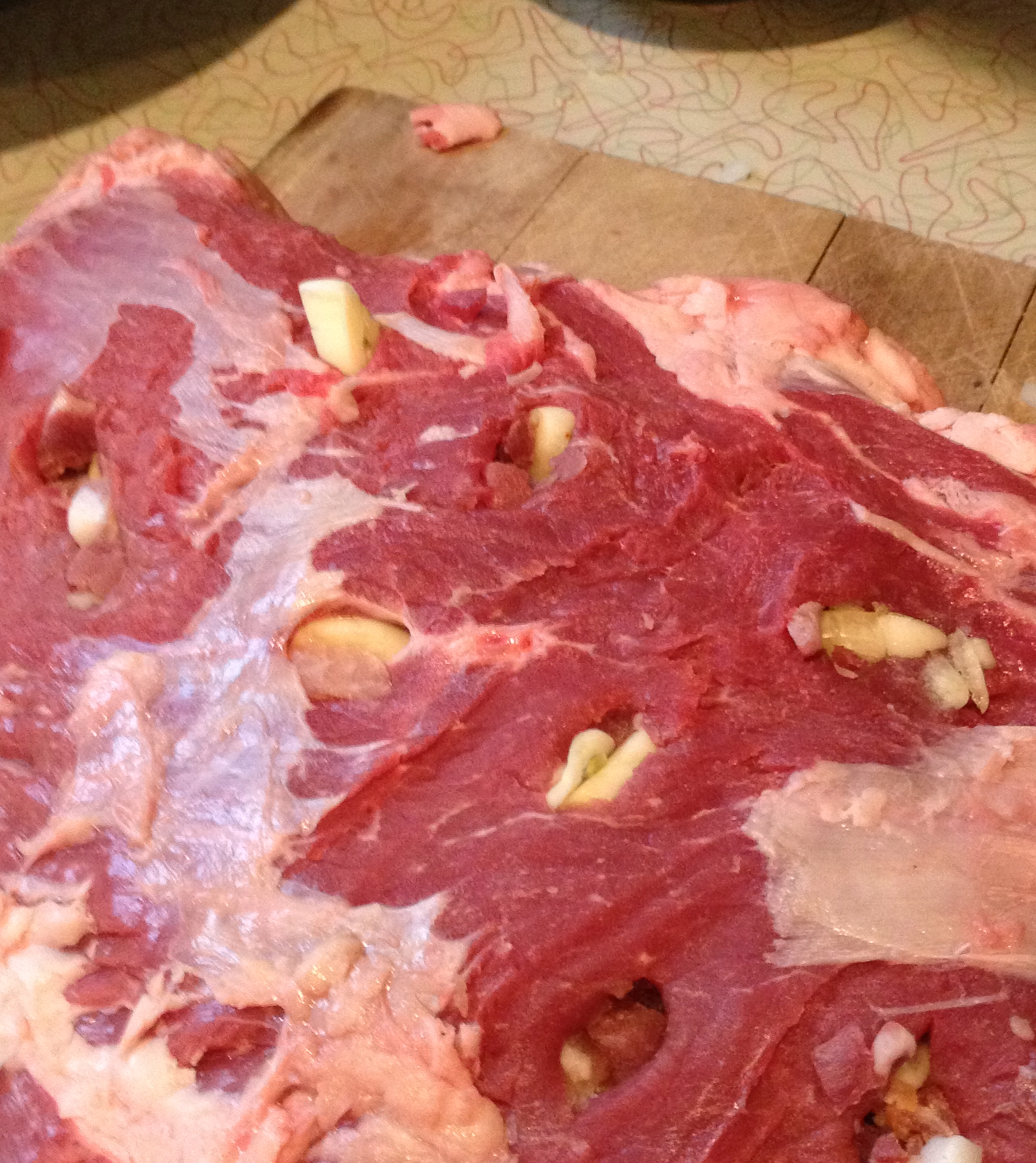 Cut slits into the beef and stuff with slices of garlic and pancetta.