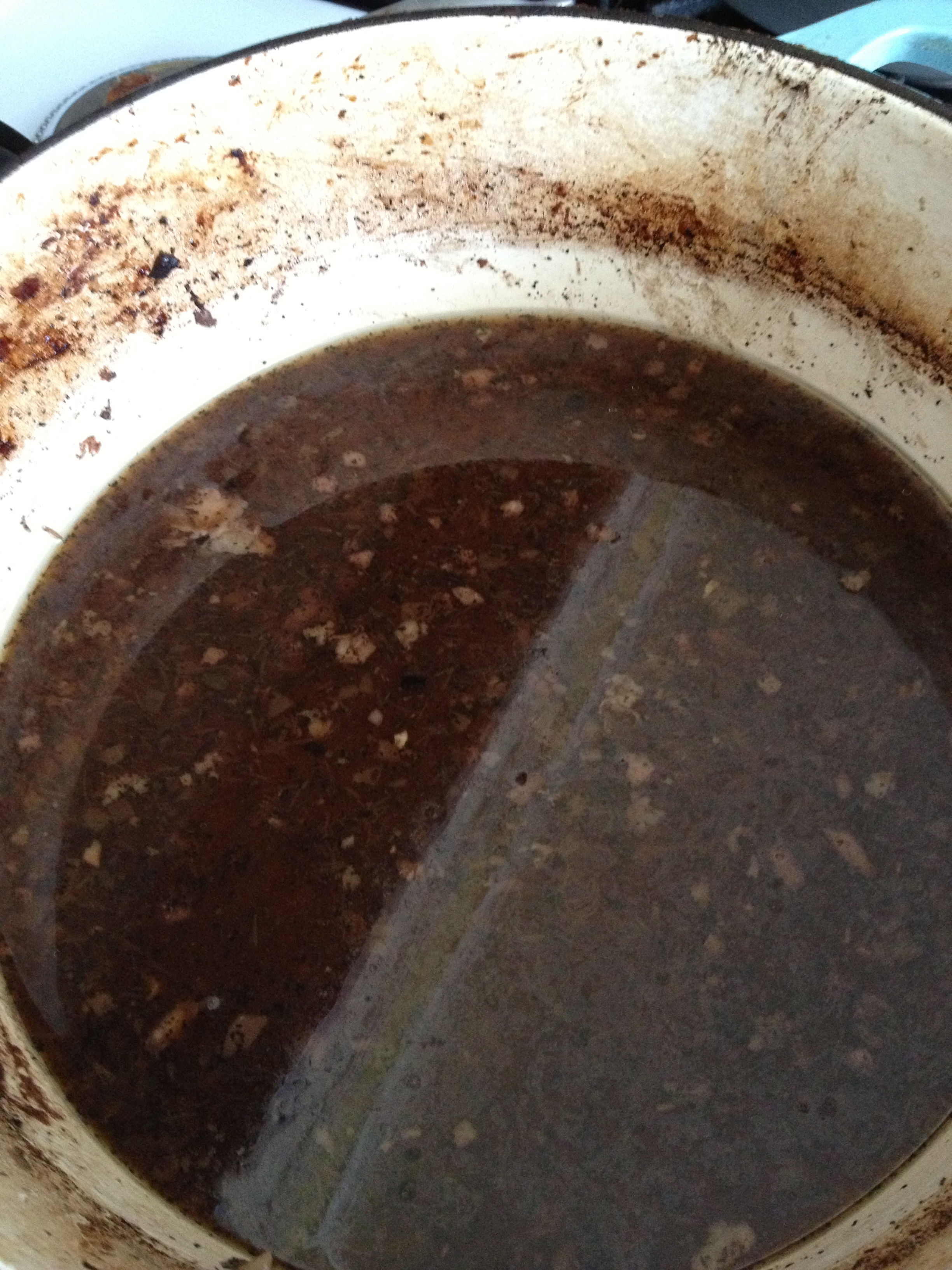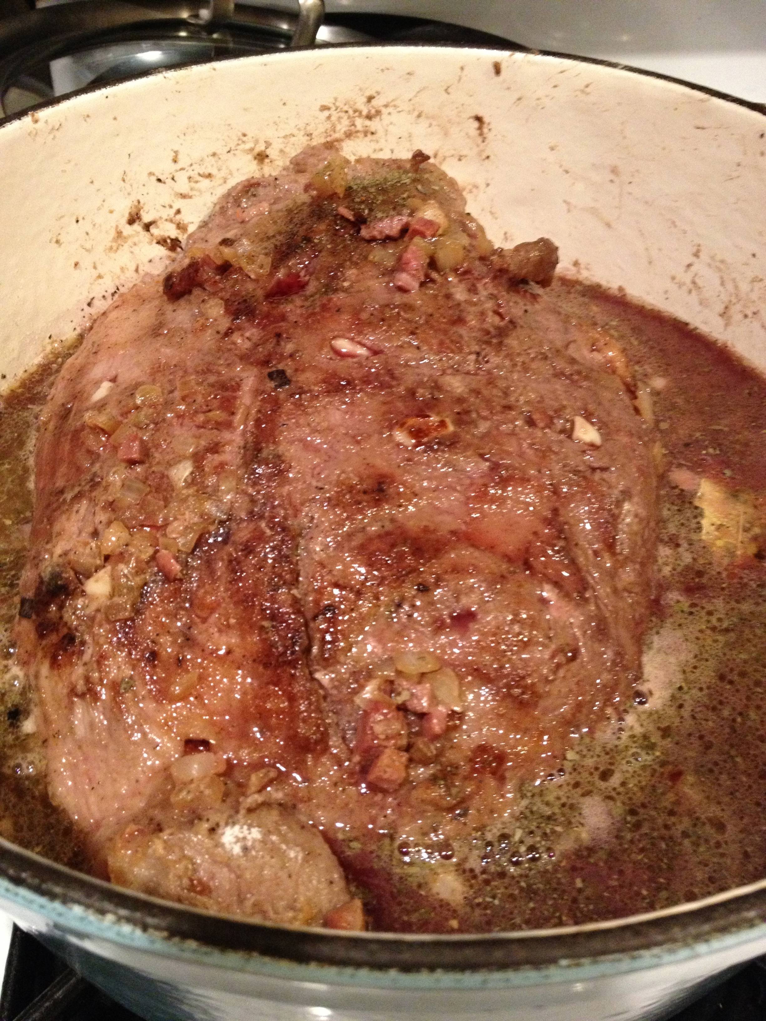 Add back the onions and pancetta, along with the basil and bay leaf. Pour in the wine and broth. Once simmering, put the beef in the oven and cook over a low heat for about 2 1/2 hours, rotating twice.