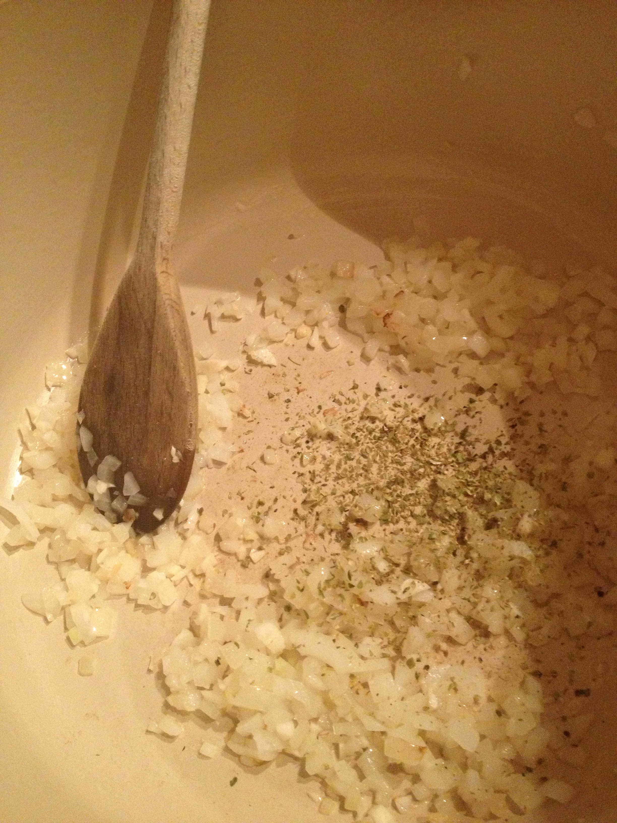 Start by sautéing onion with oregano and salt and pepper. I cooked the onion for both the meatballs and soup together to save myself from cleaning another dish.