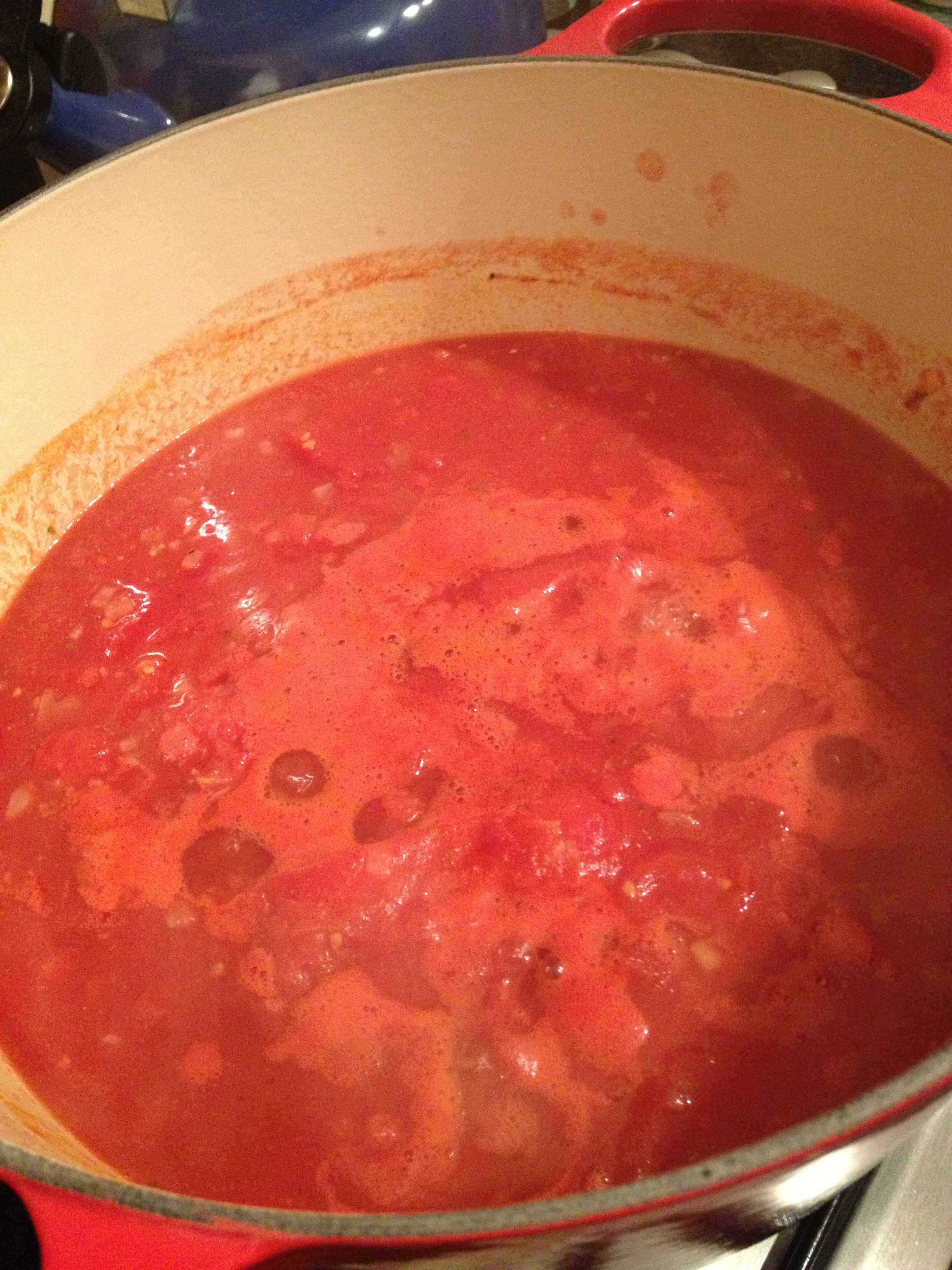 While the meatballs bake, make the tomato soup by adding two cans of whole plum tomatoes, crushing them with your hands as they go in. Along with some chicken broth, simmer away for about 15 minutes.