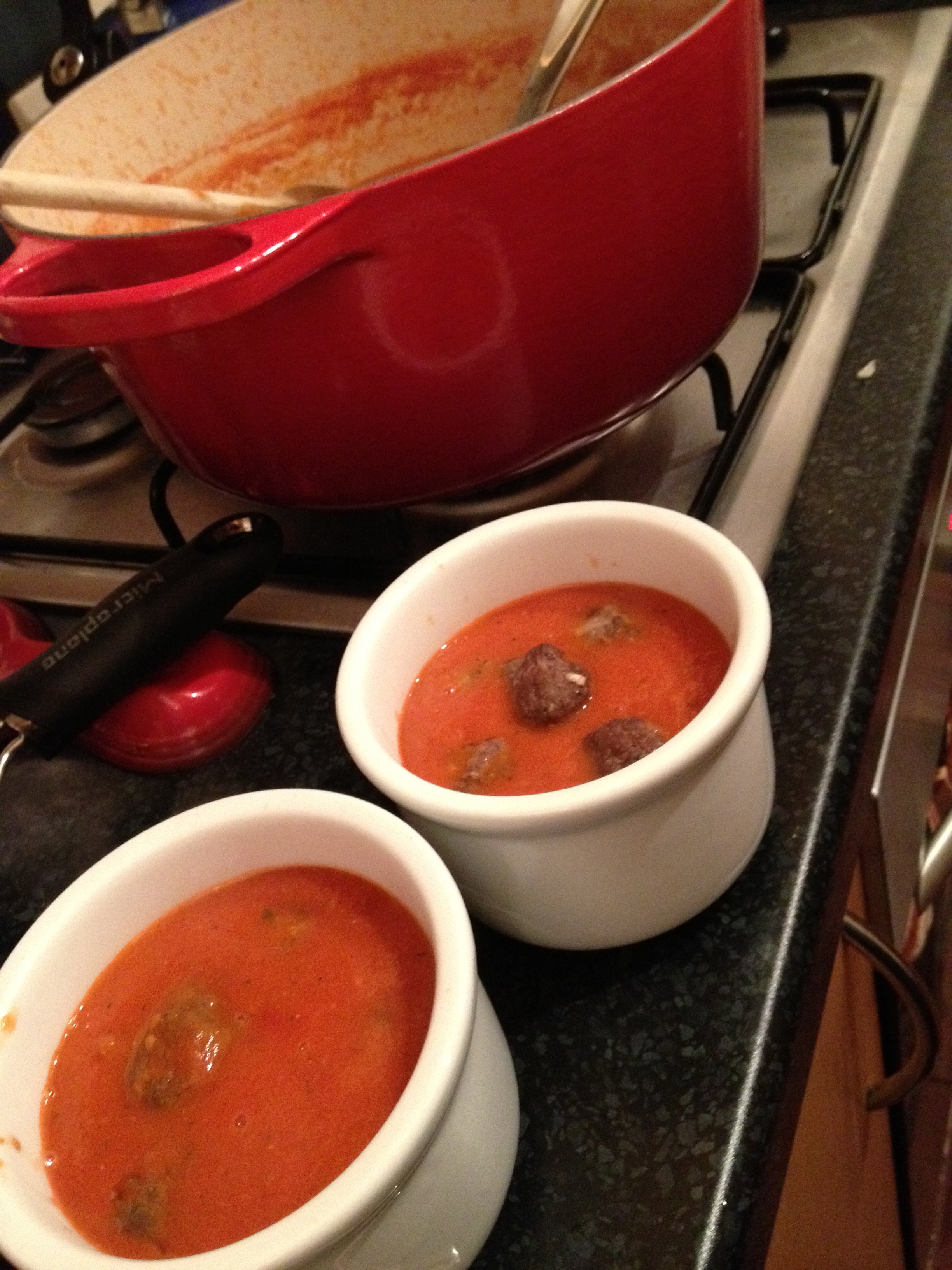 Fill some oven-safe bowls with the soup and meatballs (about 6 per bowl). You could easily mix the meatballs directly into the whole pot, but I was thinking I might freeze my leftover tomato soup so I kept them separate.