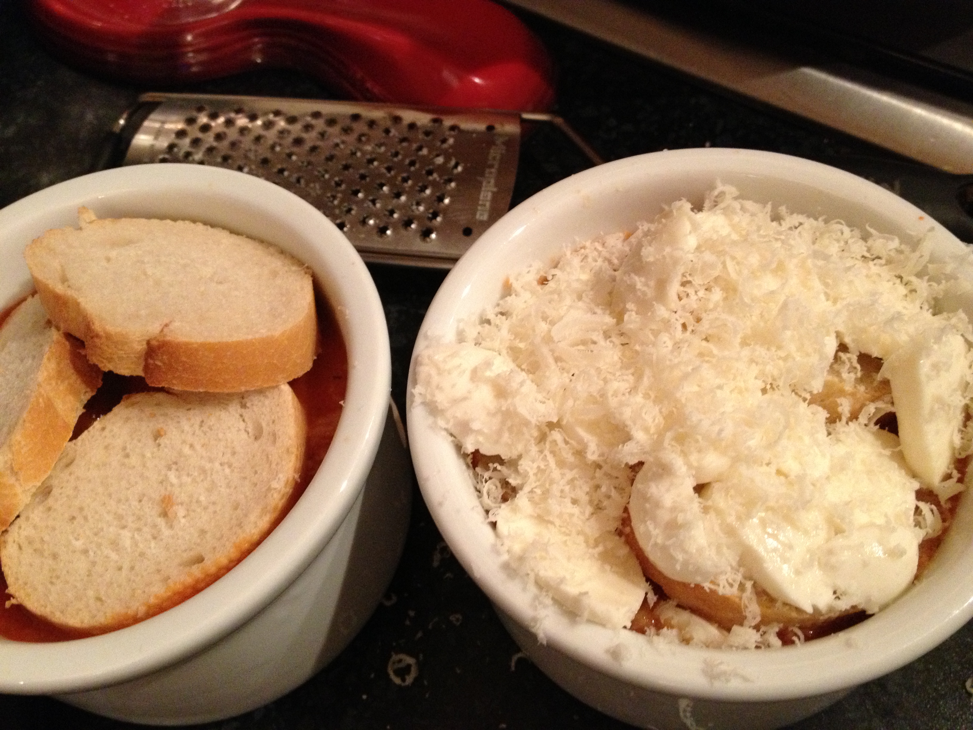 Top with French bread and the cheeses – fresh mozzarella and parmesan – in the same way you would top a French onion soup.