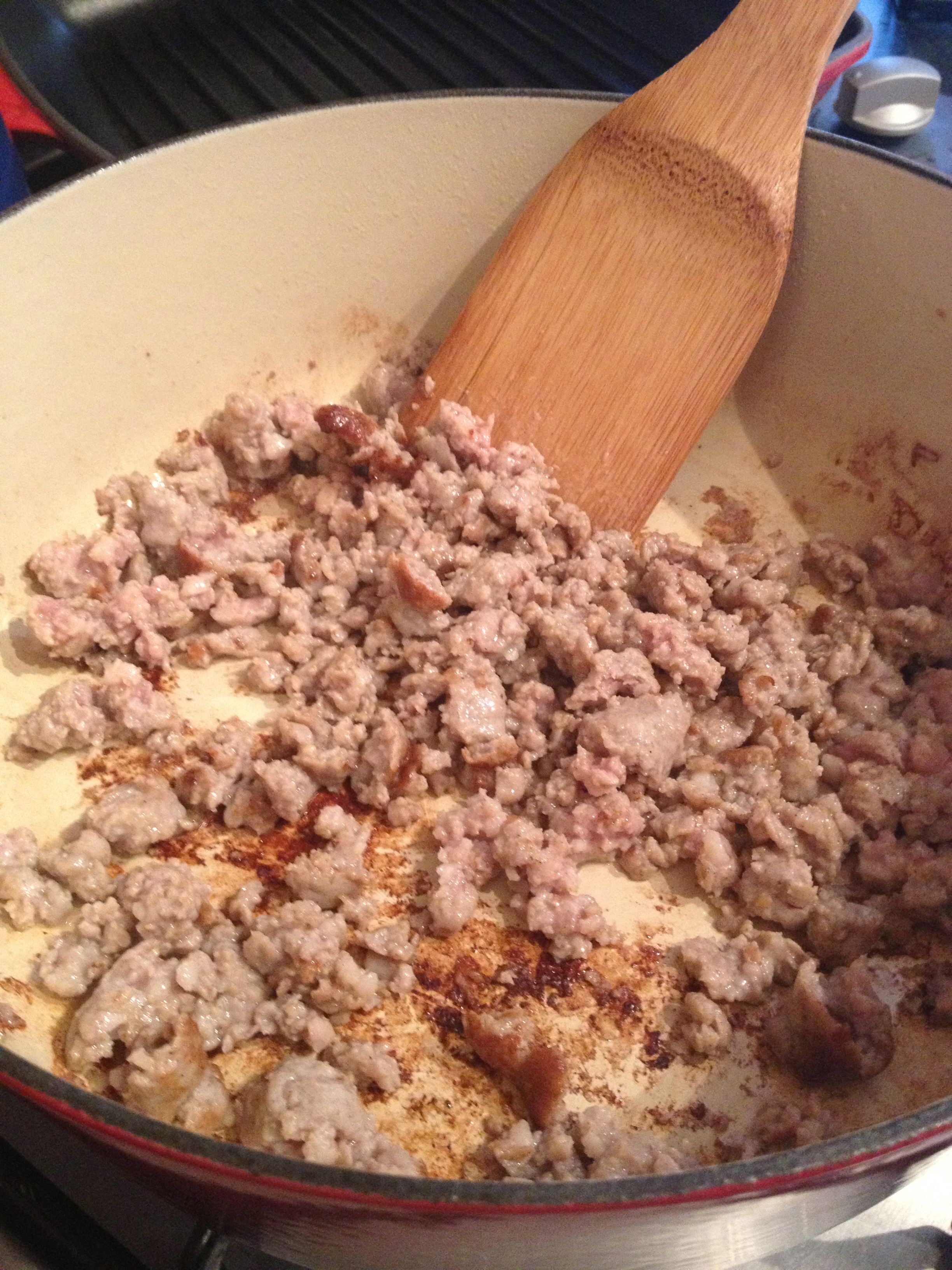 Heat 1 tsp of olive oil in a Dutch oven over medium heat. Remove sausage from casing and add to the pot. Crumble as it cooks through, about 5 minutes. Remove and reserve.