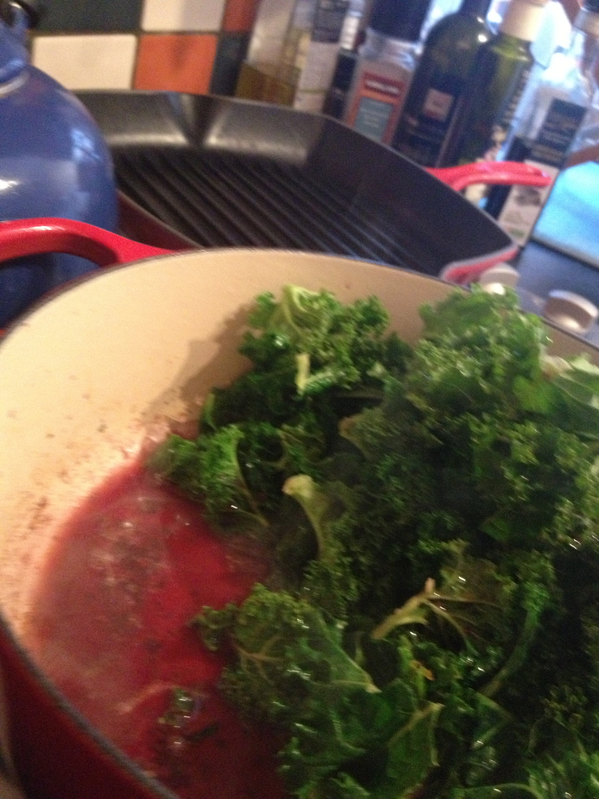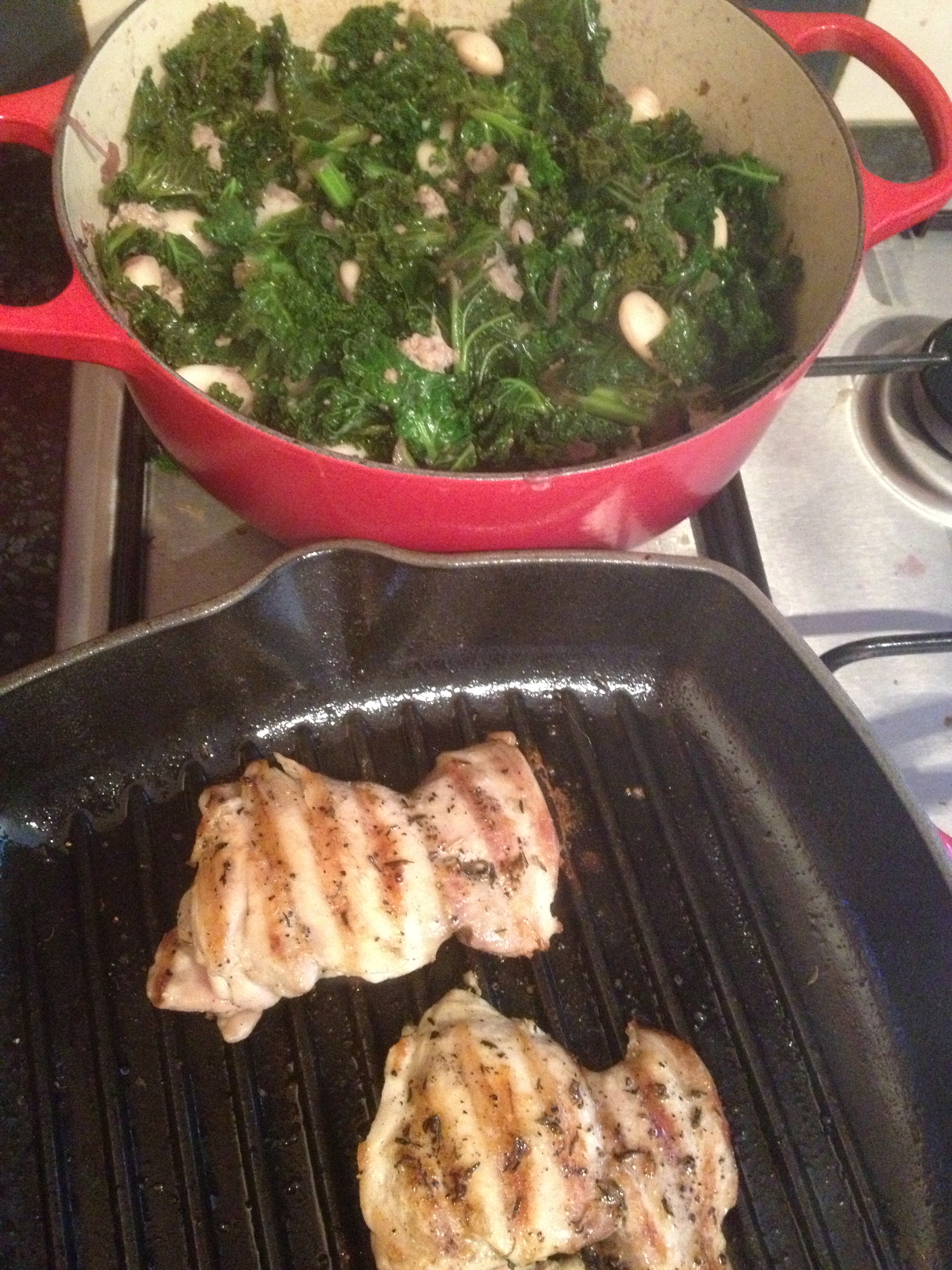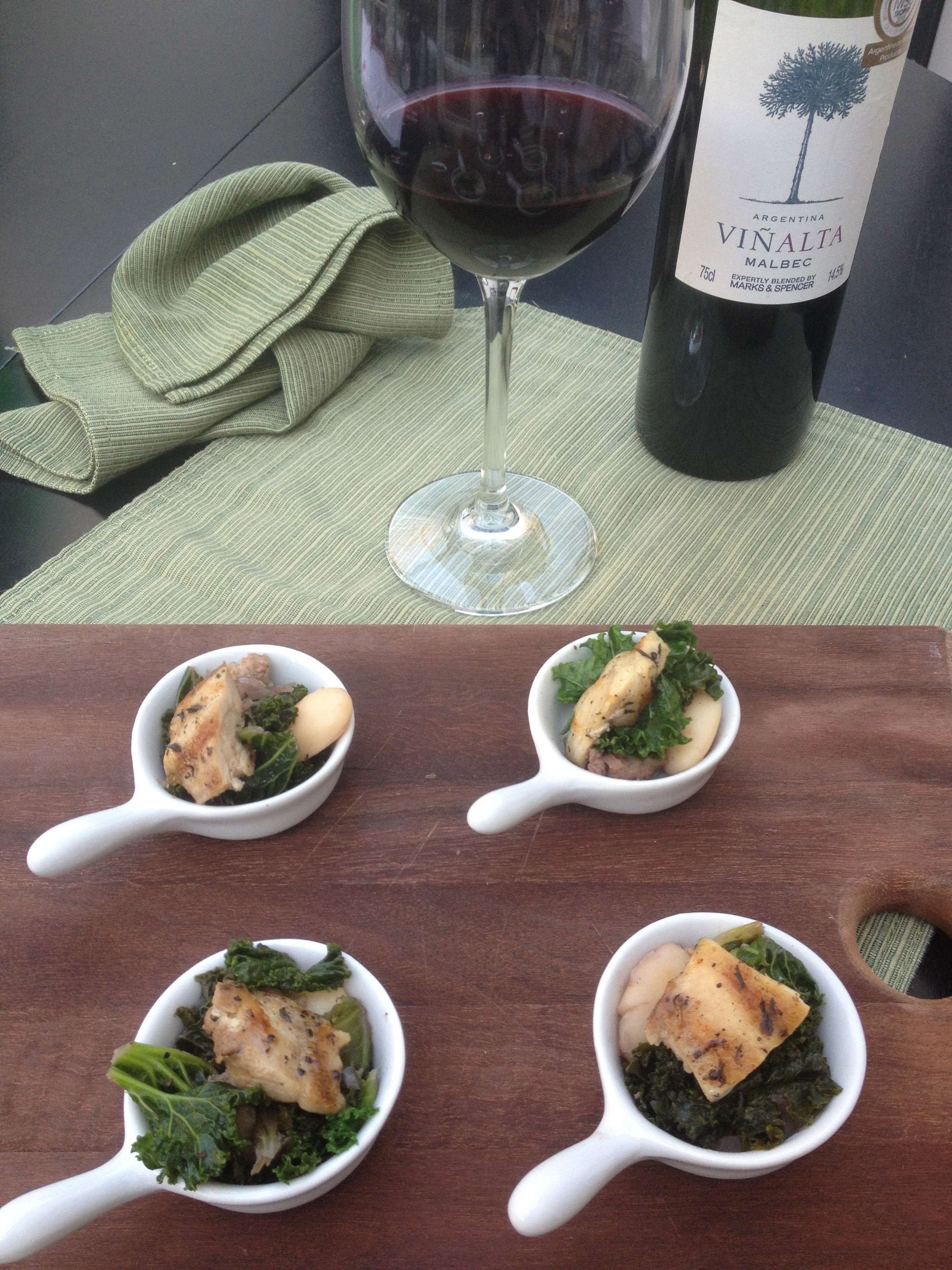 So I give to you a little taste to go with a little sip: Red wine braised kale and white beans with grilled chicken thighs.