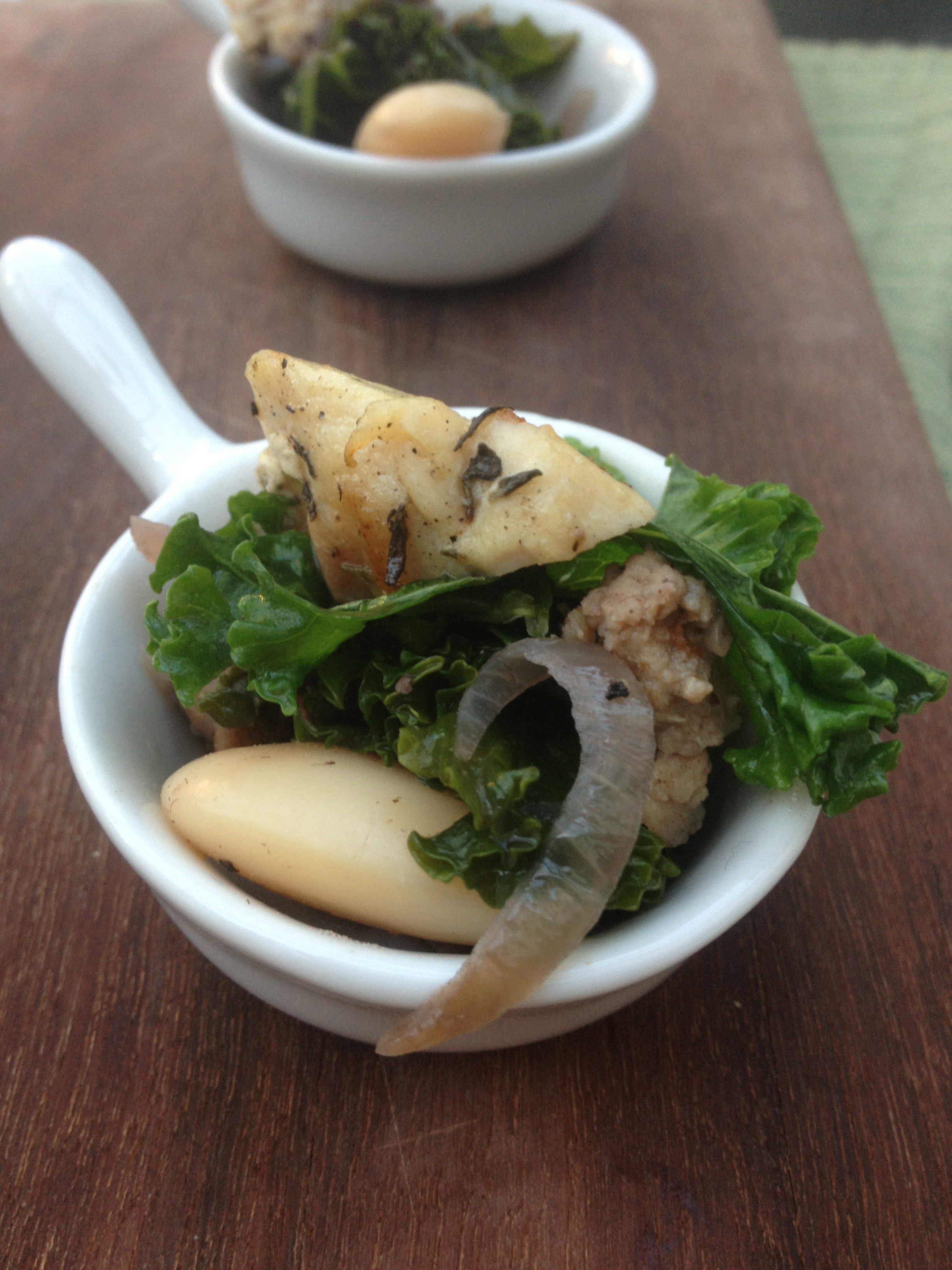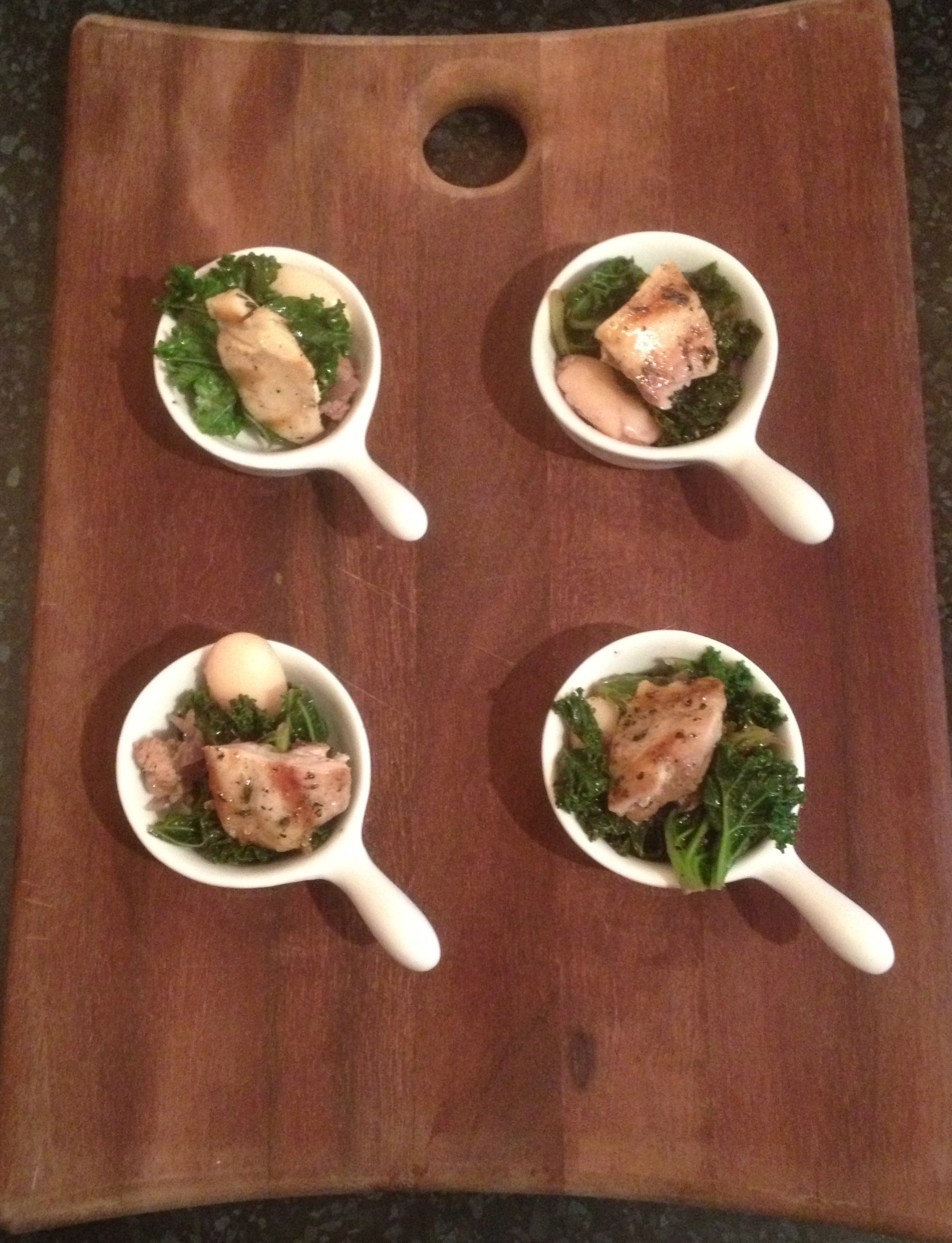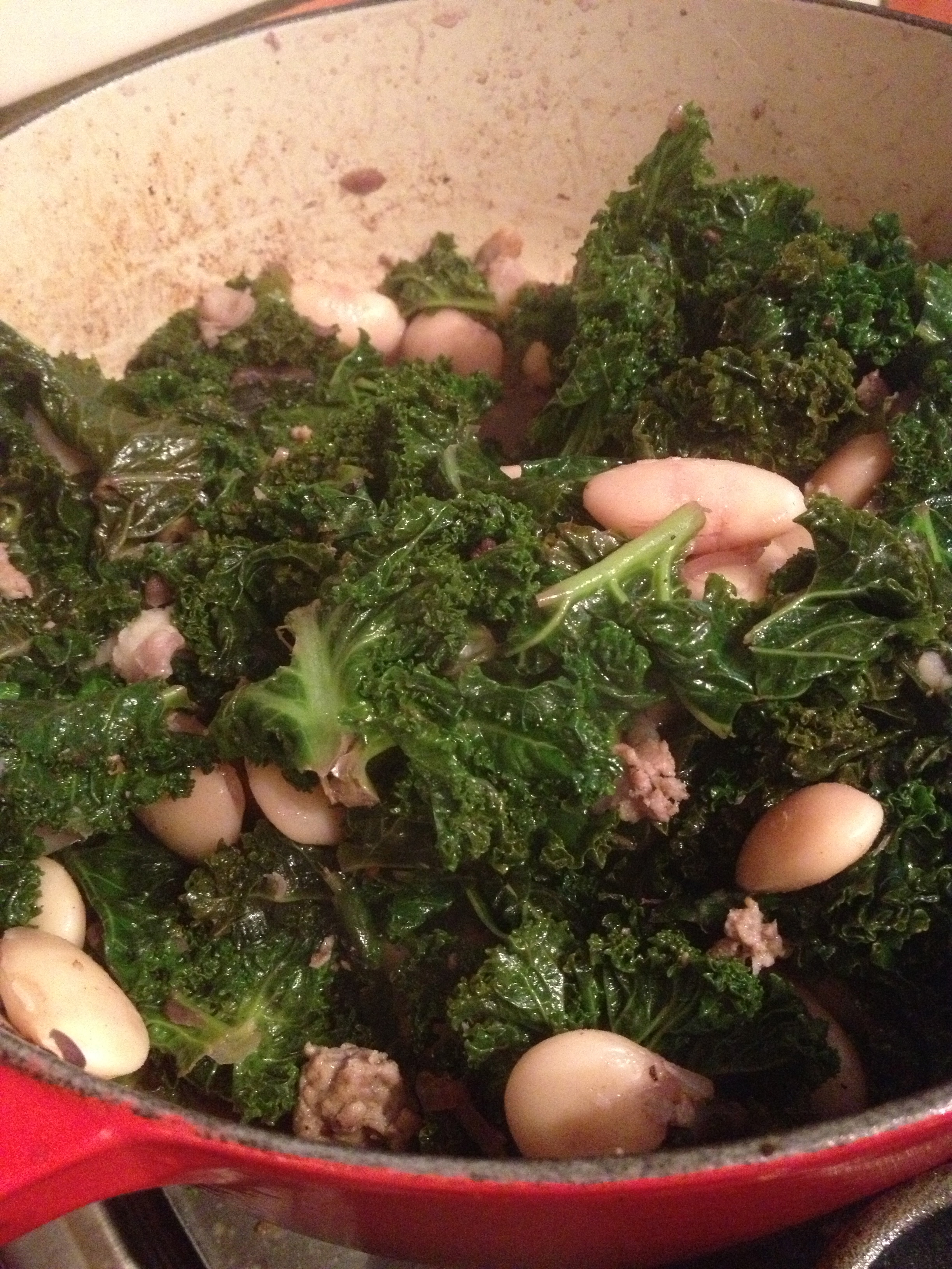 So I give to you a little taste to go with a little sip: Red wine braised kale and white beans with grilled chicken thighs.