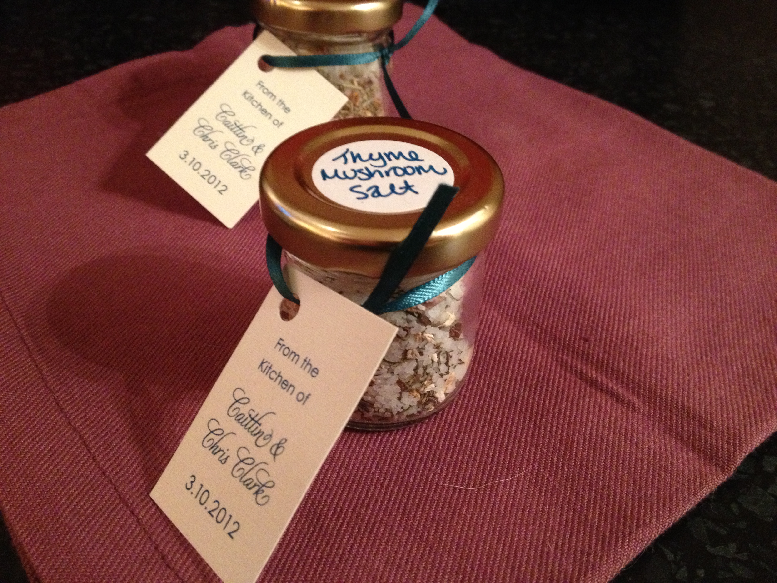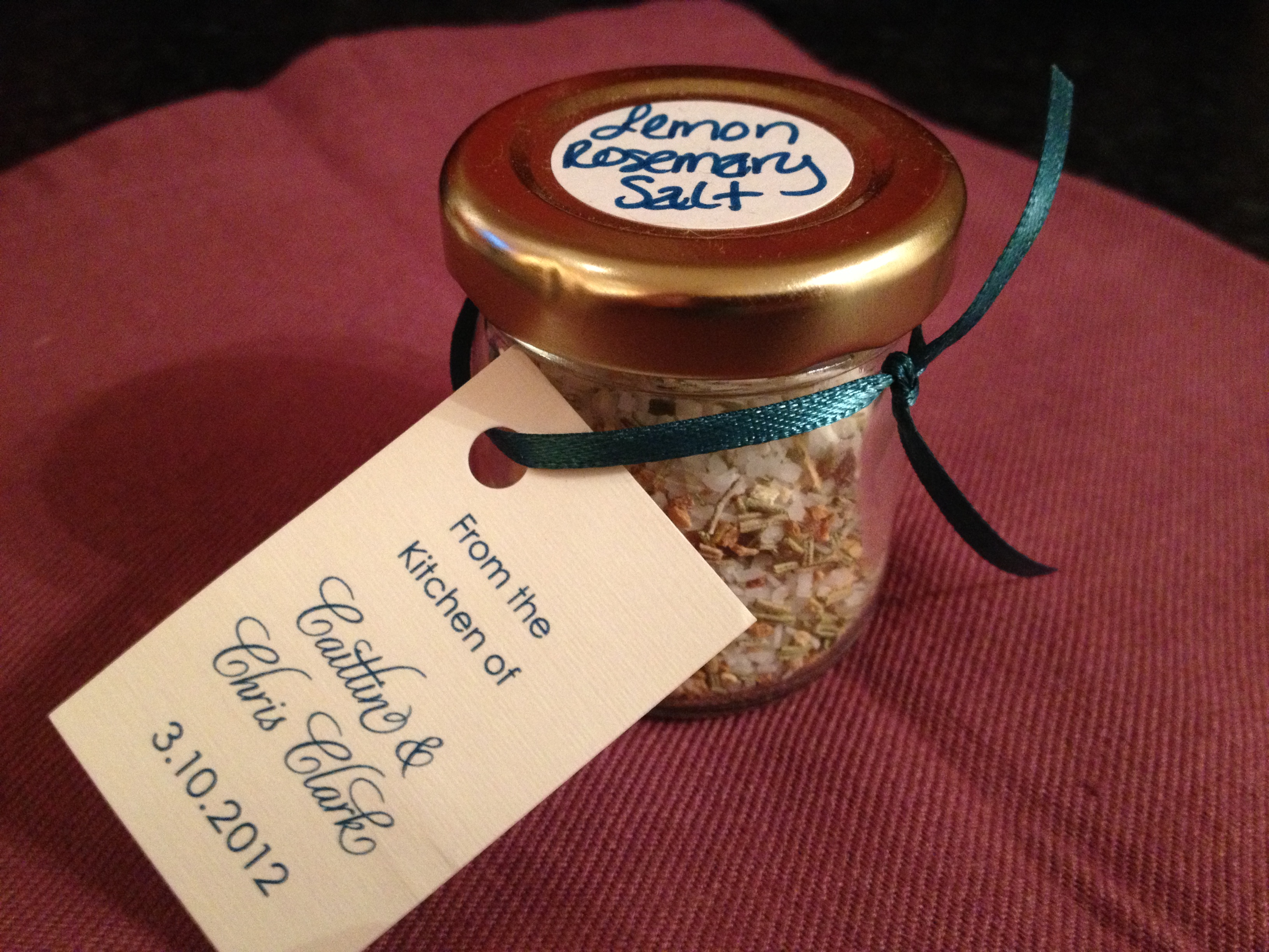 To add more personal touches I let my craftiness continue, making gold and peacock blue Mr. & Mrs. chair signs and our “guestbook” which was a canvas for the guests to sign embossed in gold with our names and the date. But my pièce de résistance was definitely my handmade favors: seasoned salts.