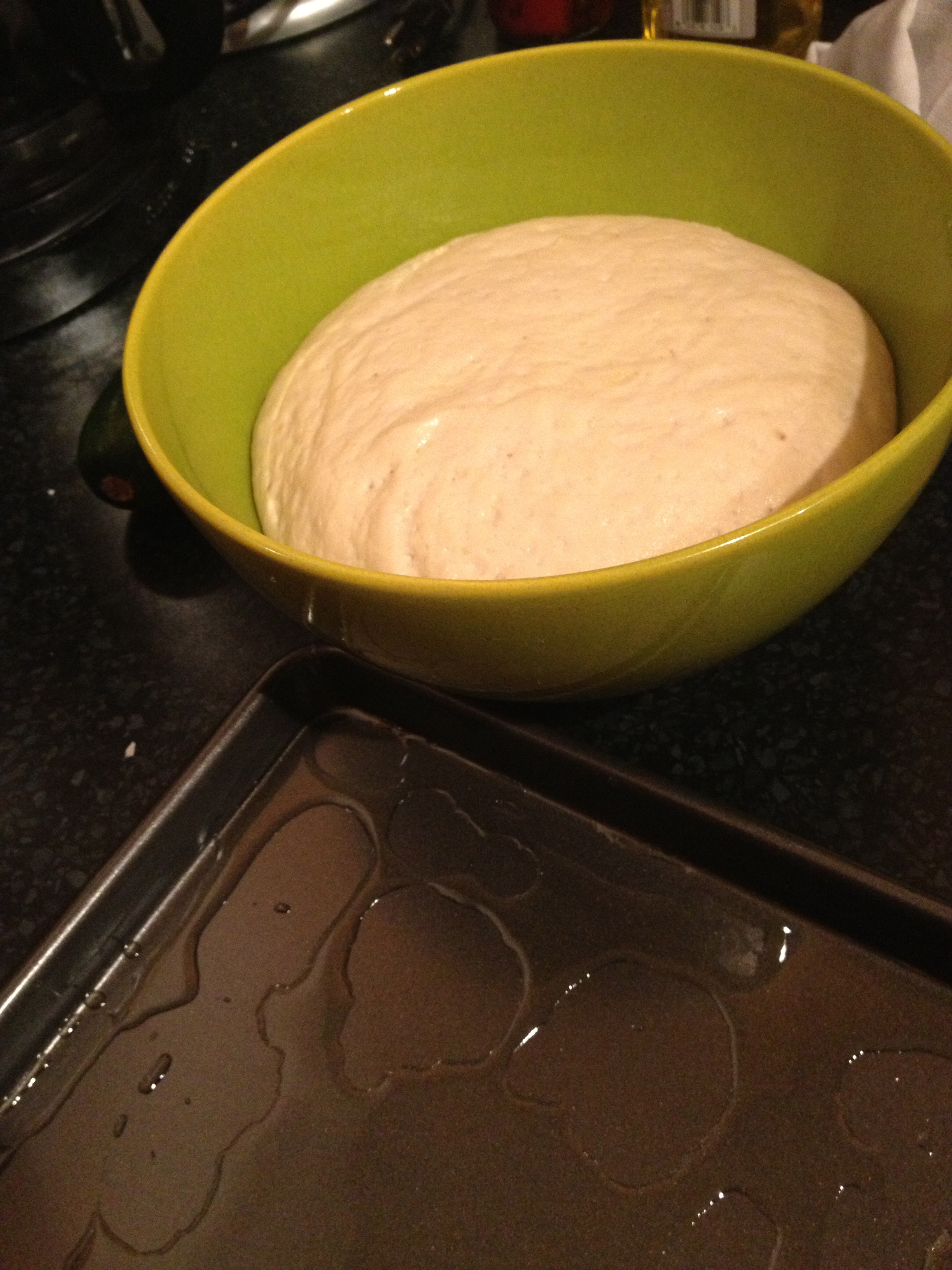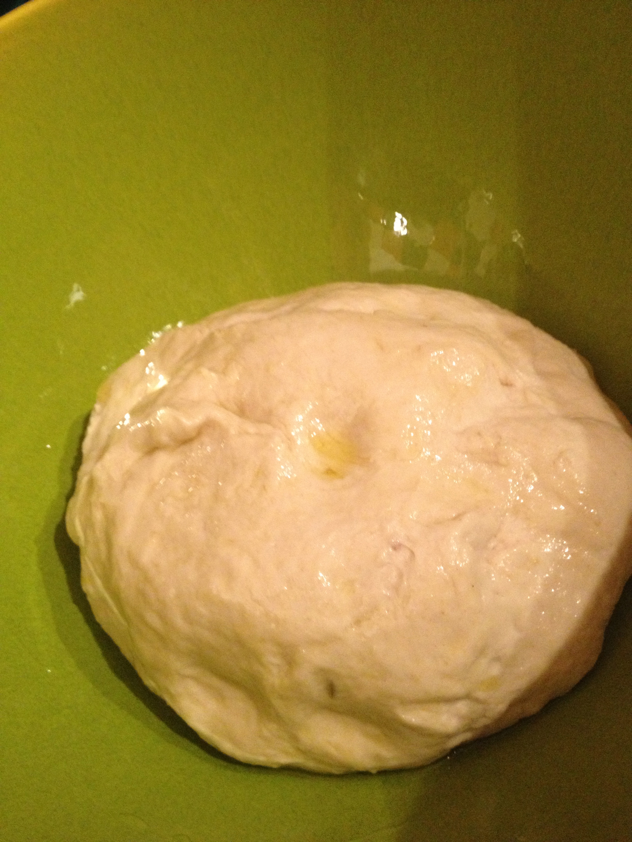 Place the dough in a large bowl, greased with olive oil. Cover with a clean dishtowel and put the bowl in a warm place to rise until doubled in size, for about 1 hour.