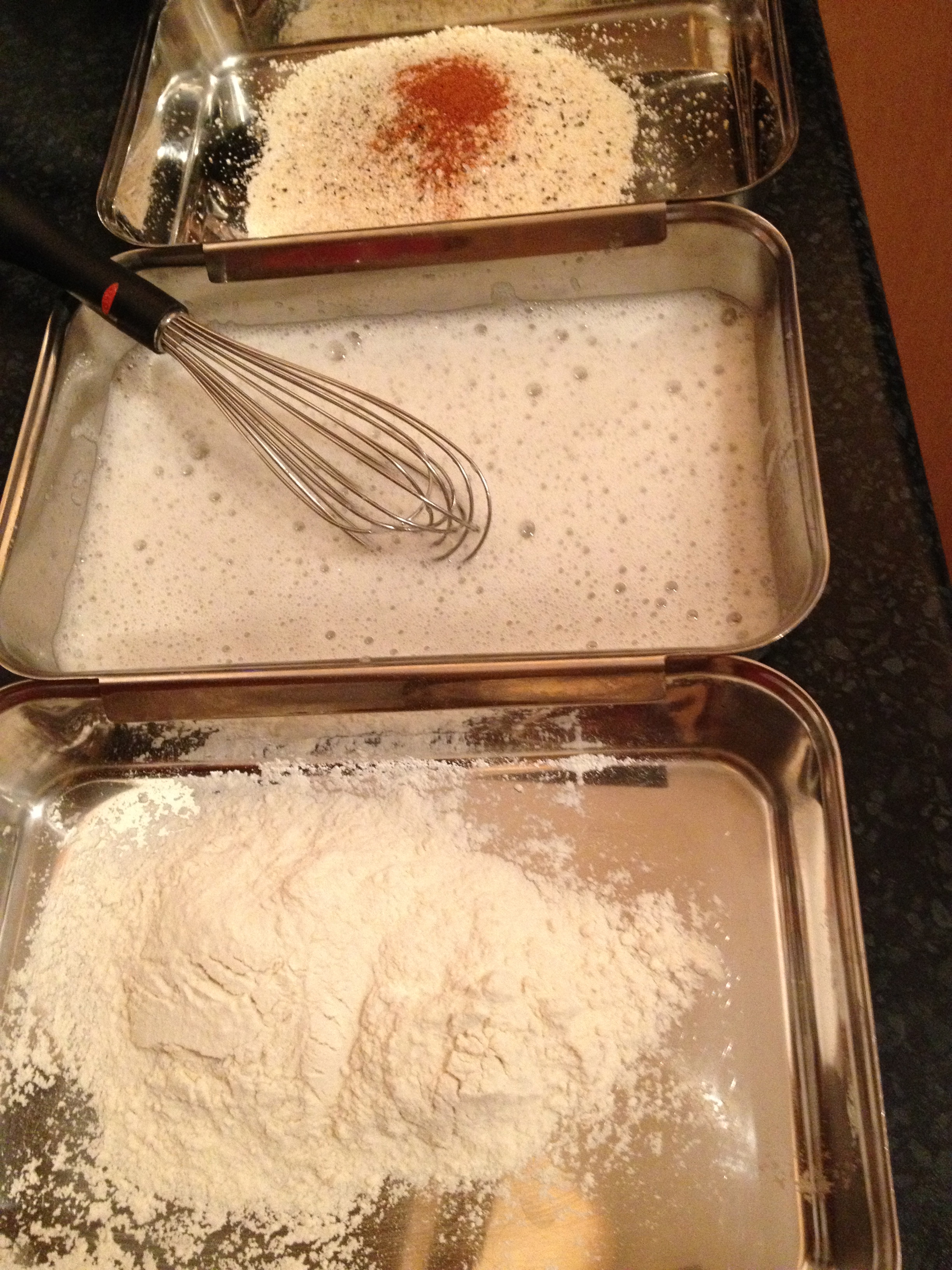 Start by making a breading station with shallow dishes filled with flour, egg, and spicy breadcrumbs.