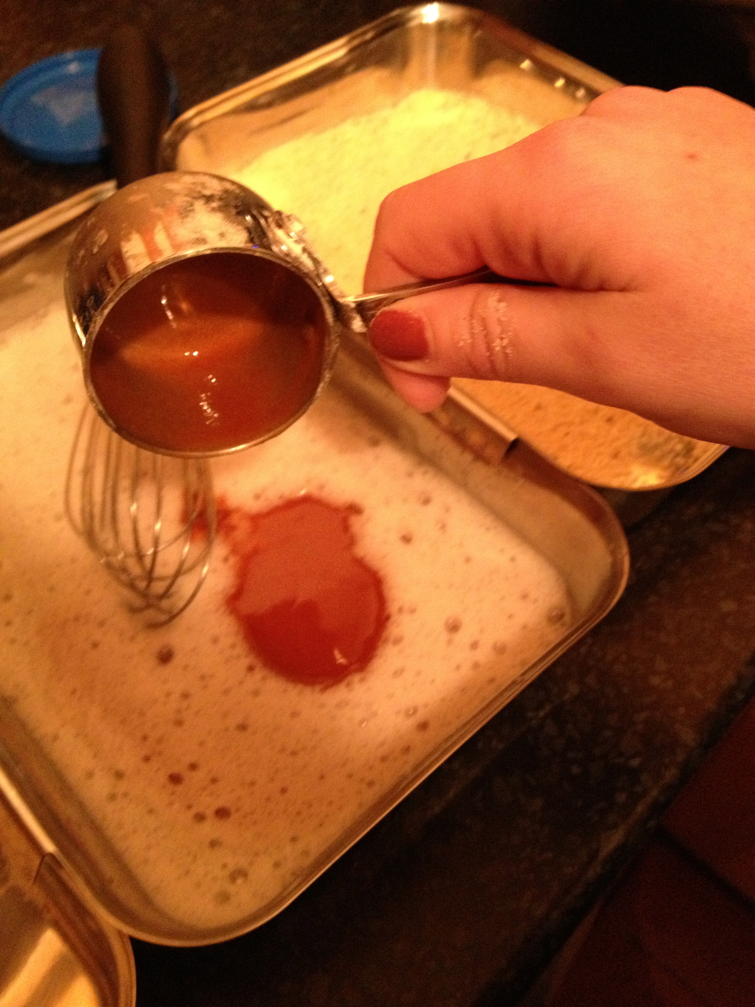 The key step here is to whip your egg whites to a good foamy froth so that they will adhere to the onion rings. Then add your hot sauce into the egg whites. Now we’re talking! Bring on the heat!
