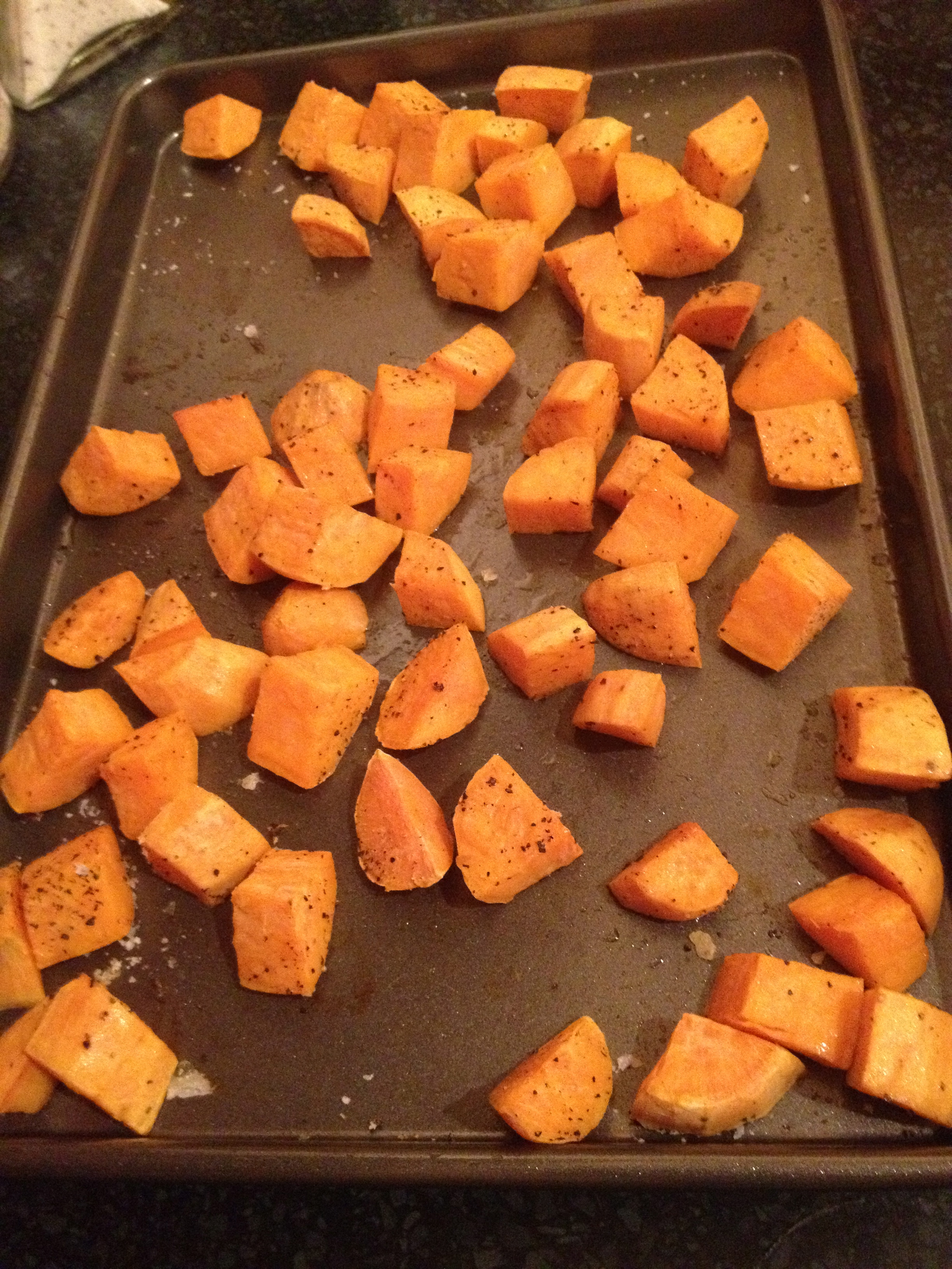 Toss the sweet potatoes in 1/2 Tbs of olive oil and season with salt and pepper. Spread onto a baking sheet and bake for 15 minutes.