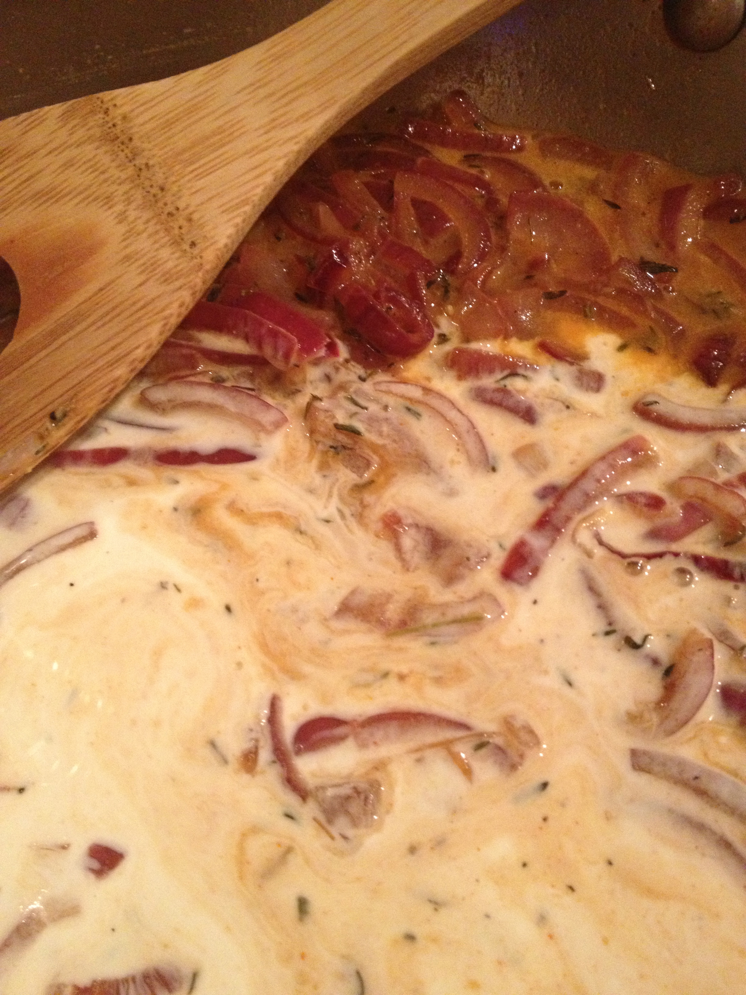 Lower the heat to medium and add the sliced onions to the skillet. Cook for 8 minutes until soft. Add the paprika, thyme, soup starter, and Dijon. Once incorporated, add the wine to deglaze the pan. Turn the heat to low and add the cream.
