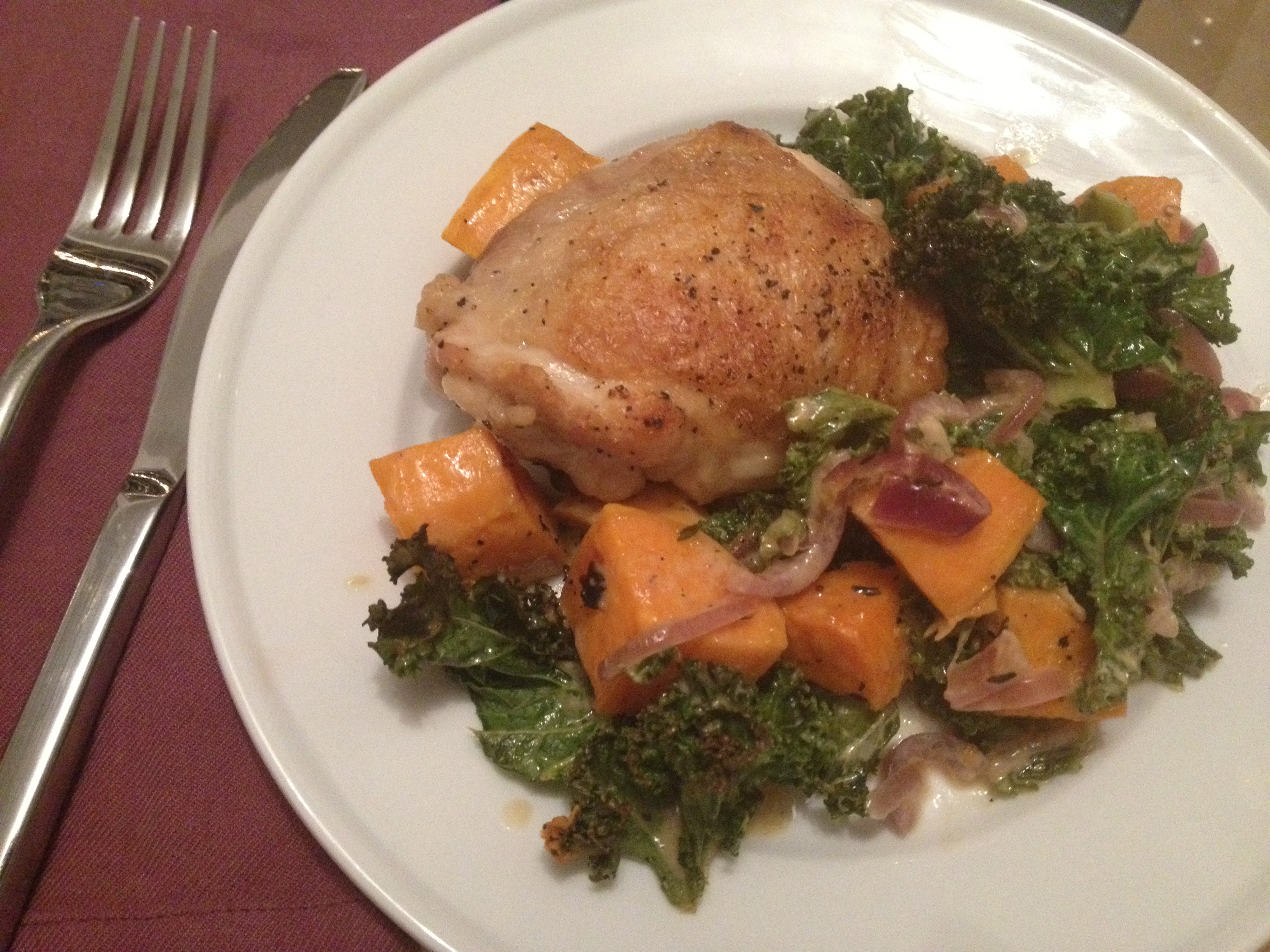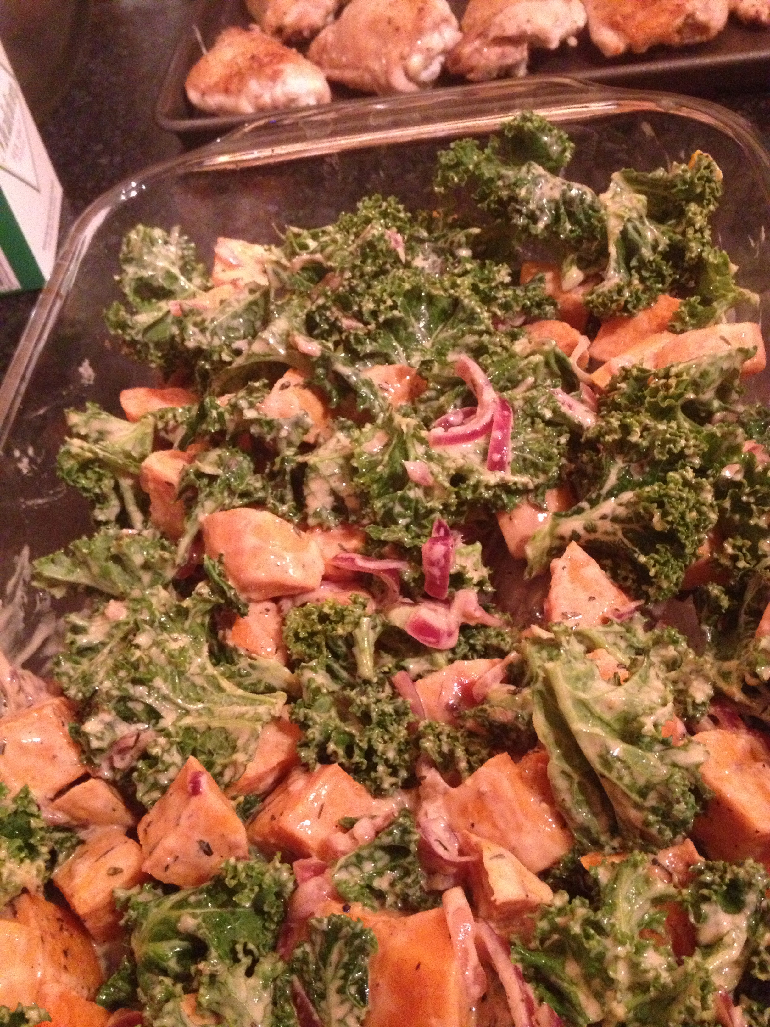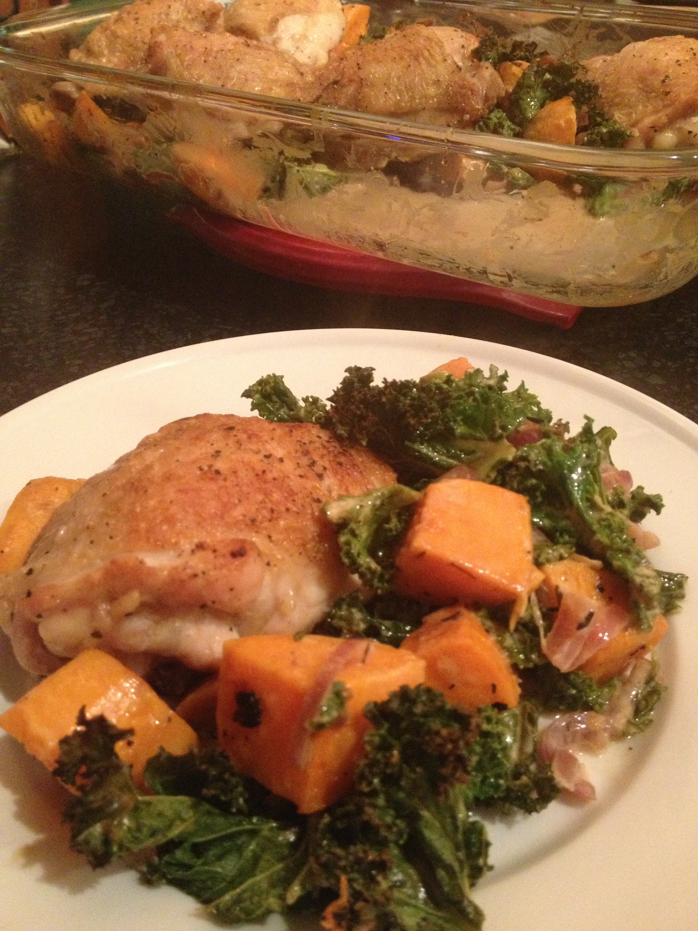 Pour the kale and sweet potatoes into a 9×12″ casserole dish, making a bed for the chicken.