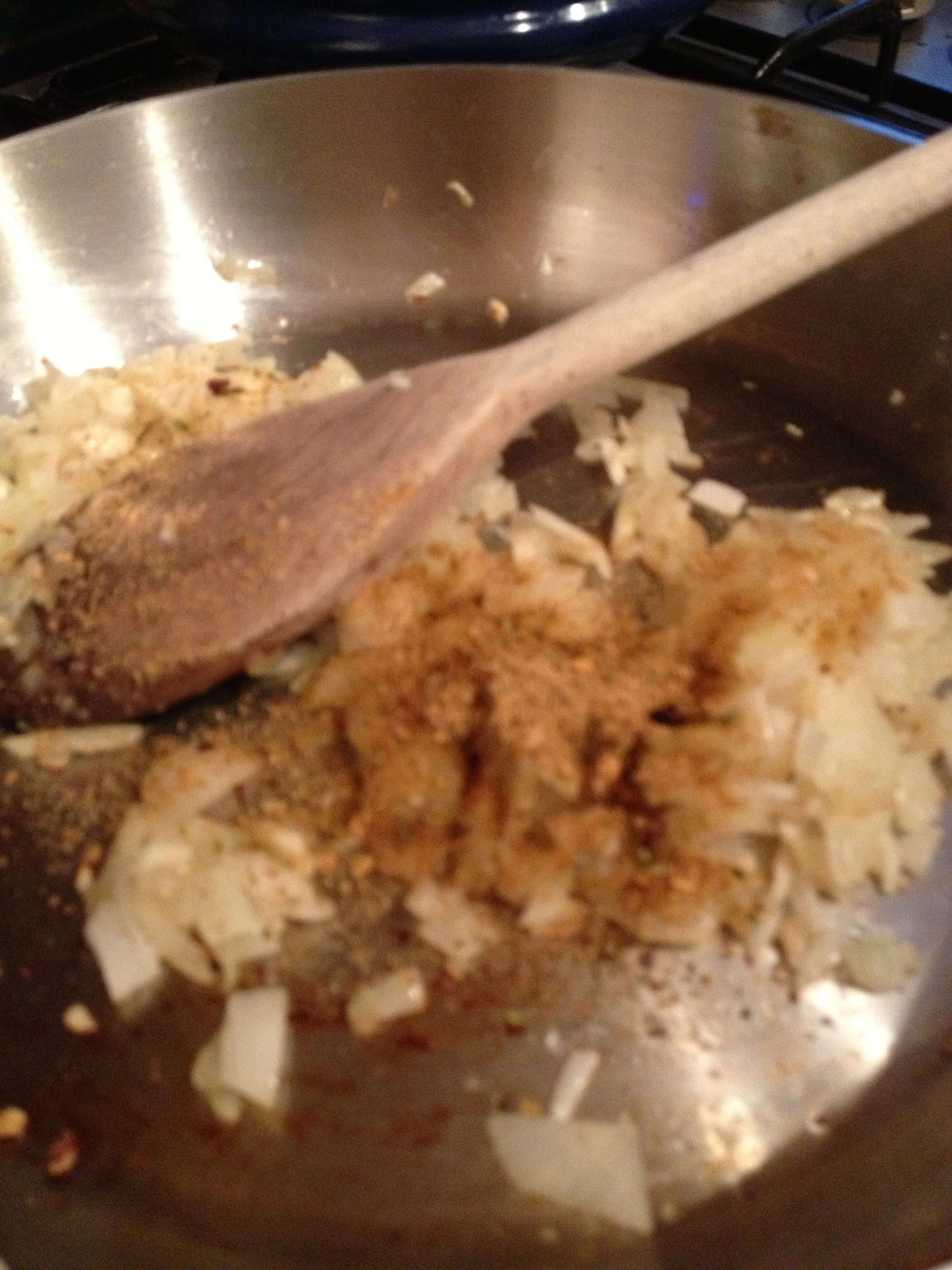 Start by sautéing onions, then adding taco seasoning and garlic.