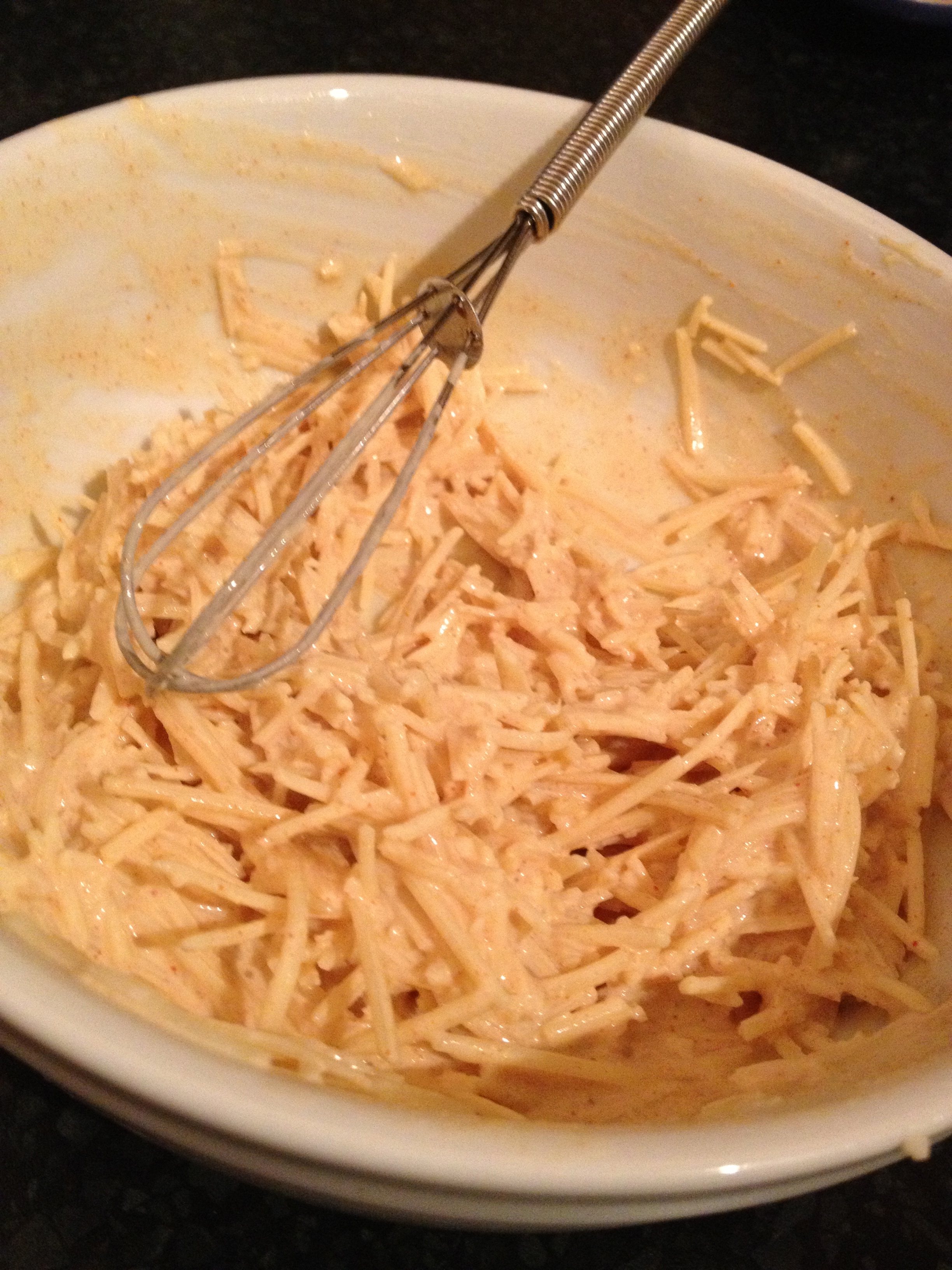 Mix the cheese, mustard, cream, paprika, and wine in a small bowl. Set aside.