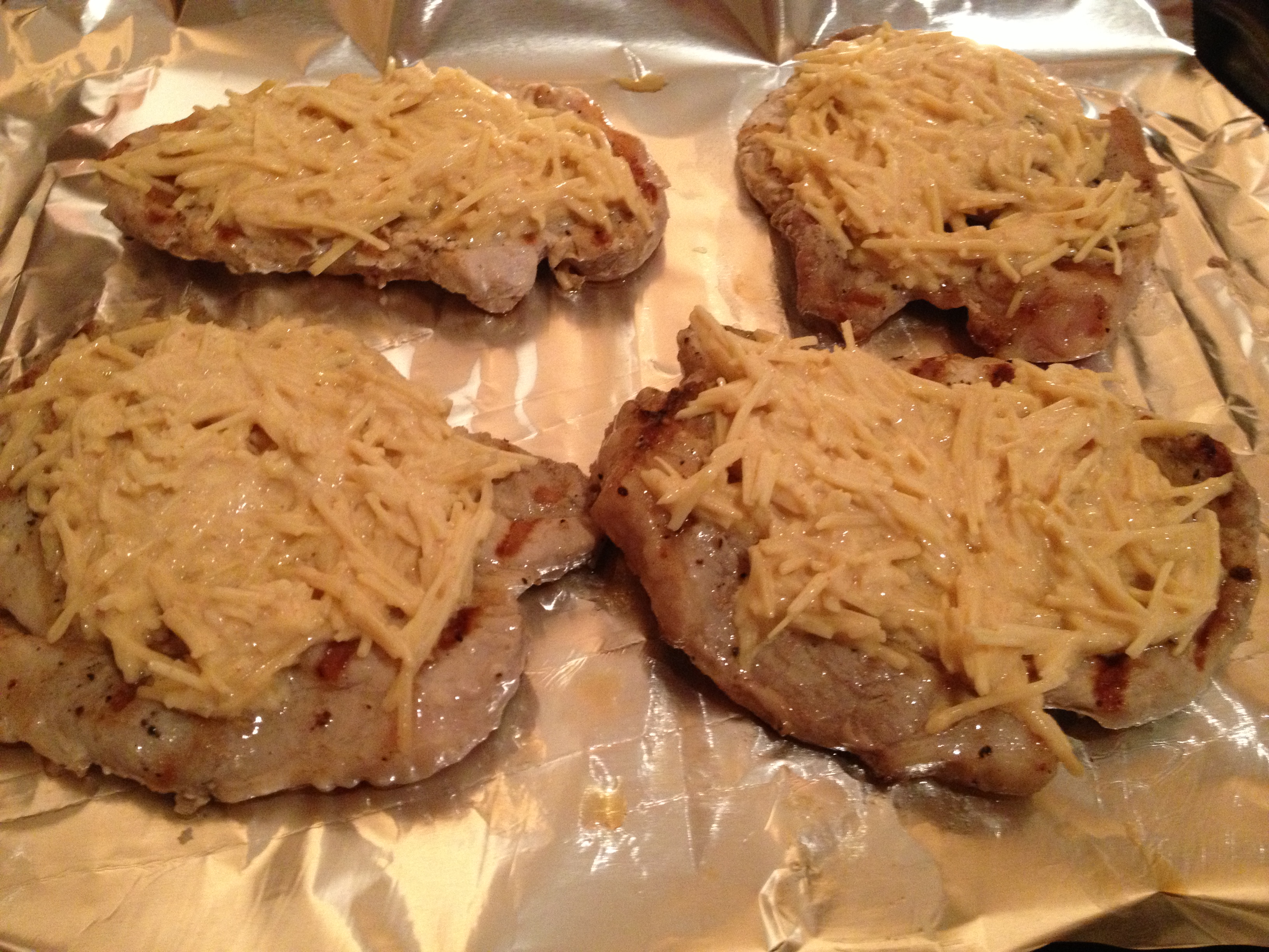 Salt and pepper the pork chops and grill for 3 minutes on the first side, turn and grill an additional 2 minutes. Spread the cheese mixture over the chops and place in an oven safe pan under the broiler, for about 2 minutes, until the cheese is bubbly.