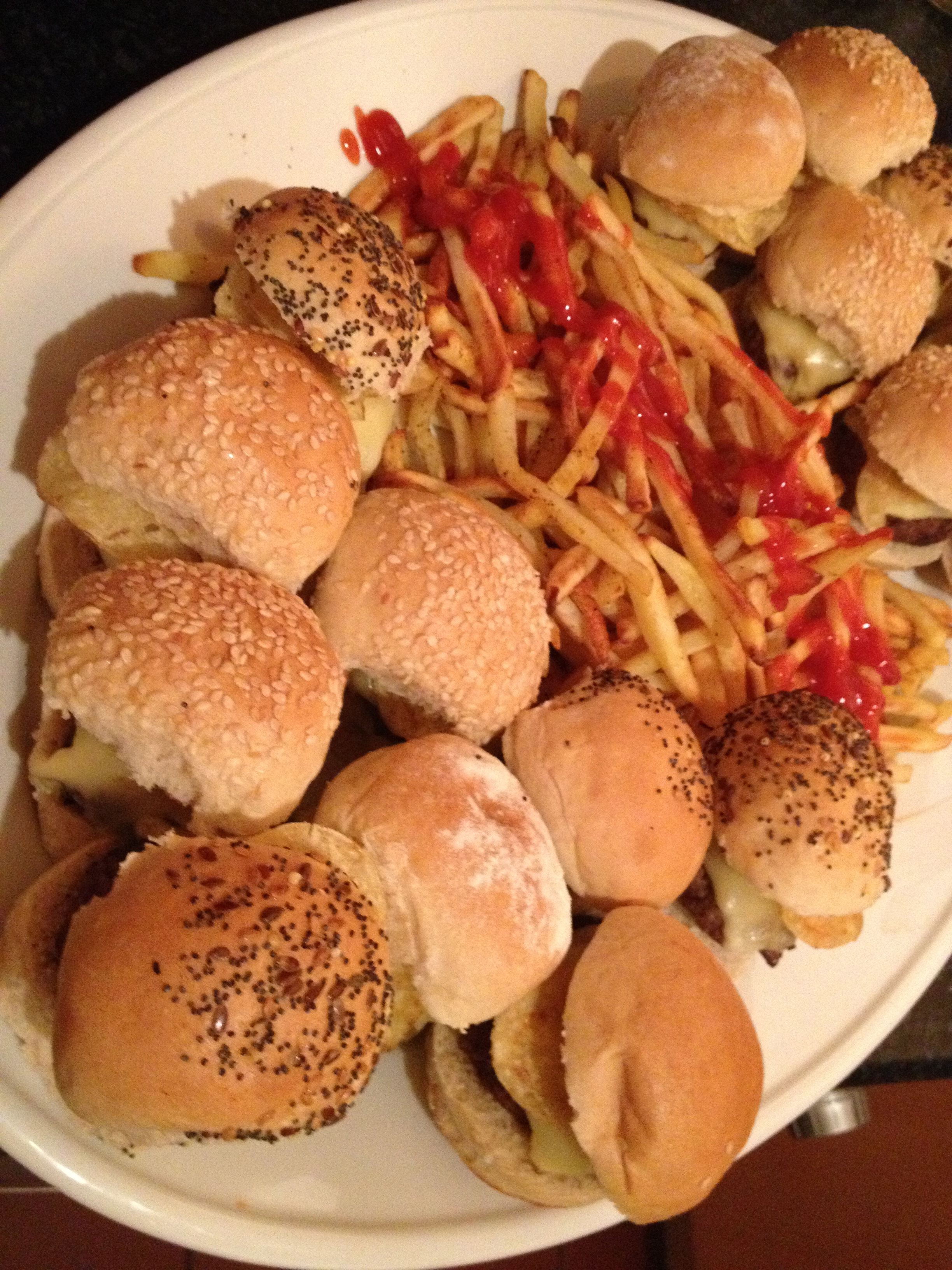 If you are feeling more ambitious than I am and are not planning on sitting around reading all weekend, here are a few more tasty bites from our festivities last weekend. First of all, a really great way to make entertaining simple is putting out a platter of mini burgers with oven roasted fries. You can prep your patties in advance and then grill them up in a matter of minutes when your guests are ready to grub! This platter of burgers is inspired by Bobby Flay who coined the term “crunchified” at his Bobby’s Burger Palaces throughout the east coast (and apparently Ohio). His classic burger is simply perfection with potato chips and lots of American cheese. Of course, not being in America, I substituted Edam, which is a very mild melty cheese.
