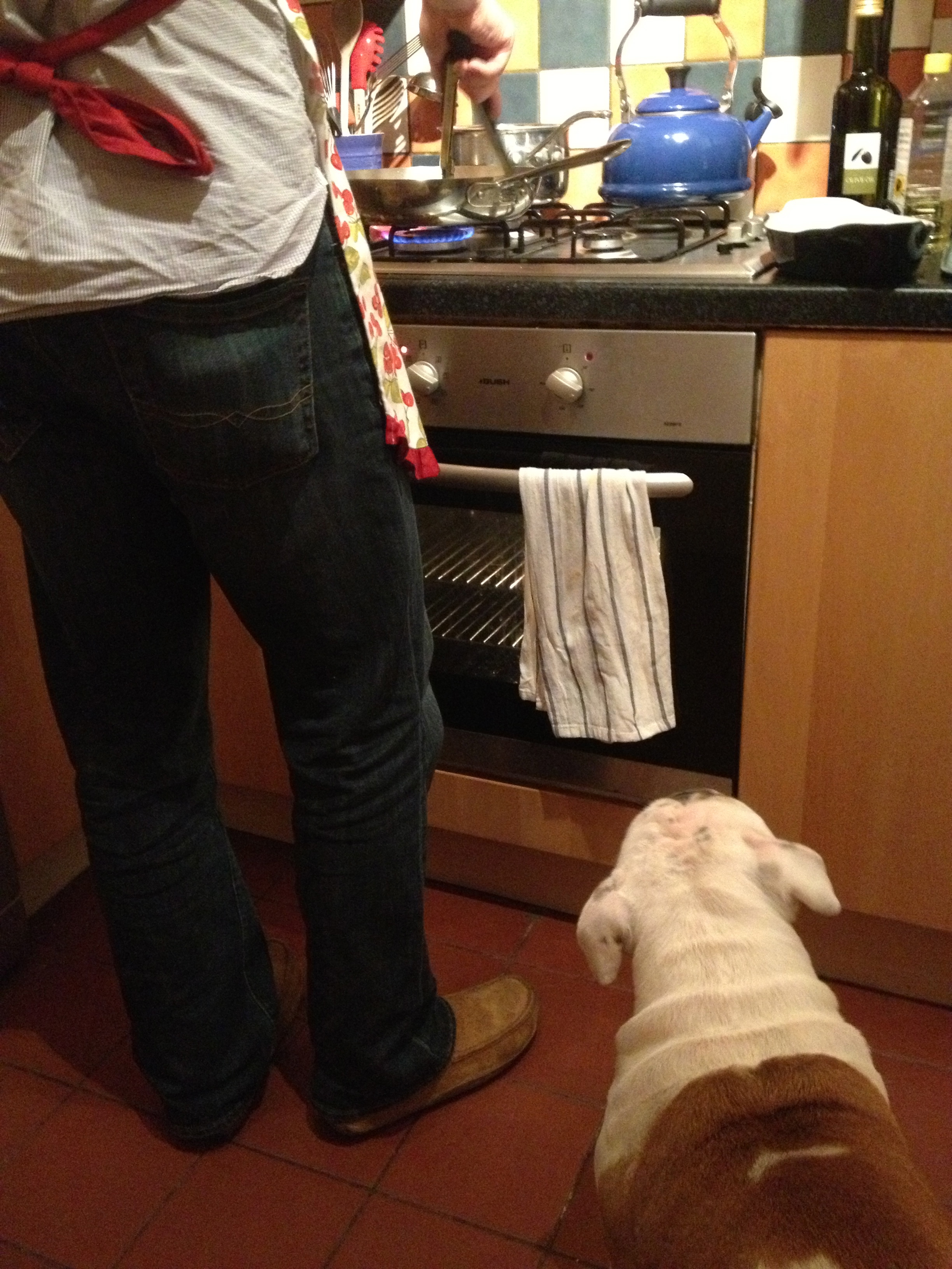 Grease started flying so Chris aproned-up, and I think his little helper might have thought she was going to get lucky with some scraps, don’t you?