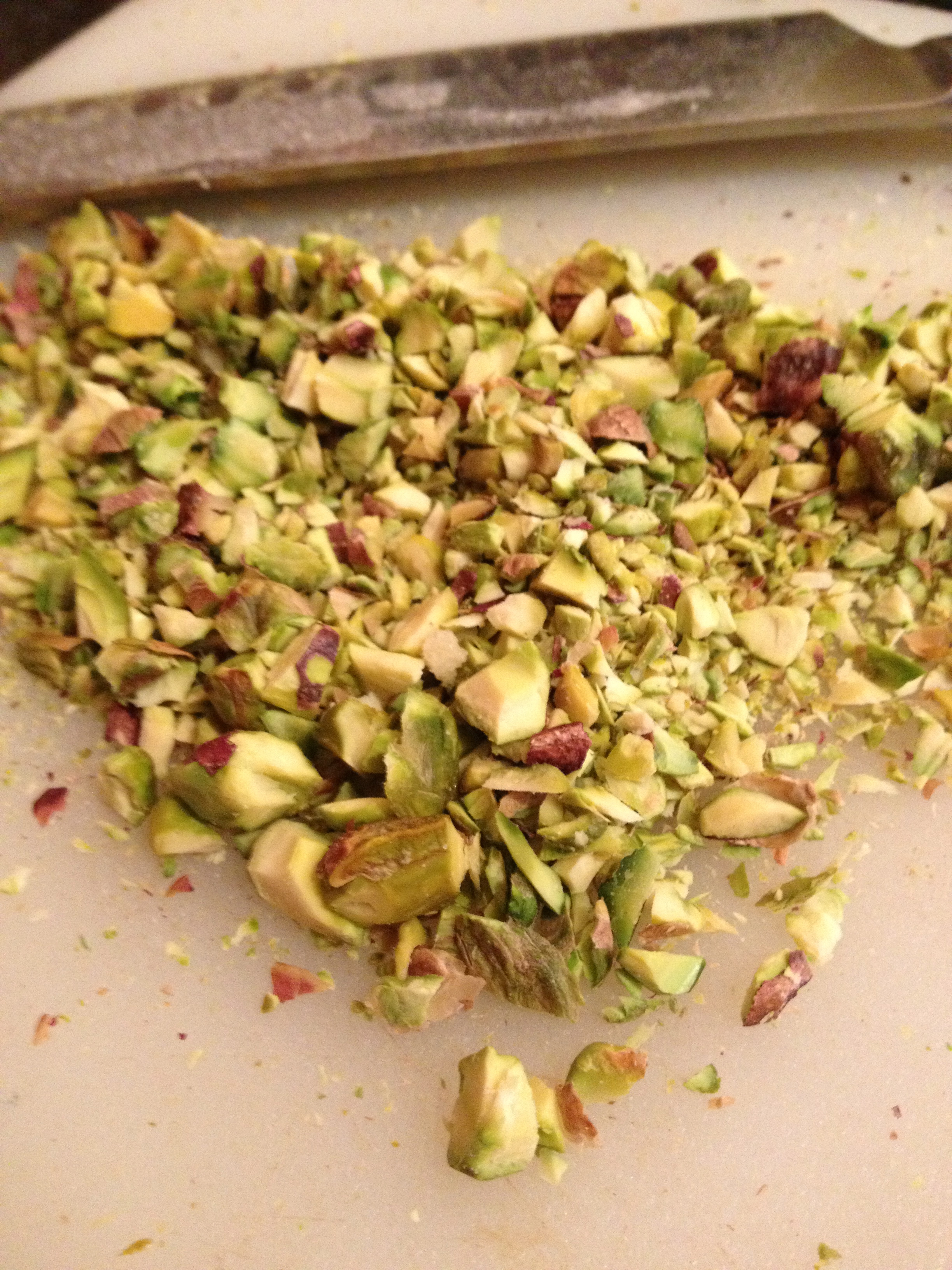 Make sure that some of your pistachios are very finely chopped, so that the flavor combines with the flour throughout the cookies. Then the other half of the nuts should be fairly rough to add texture.