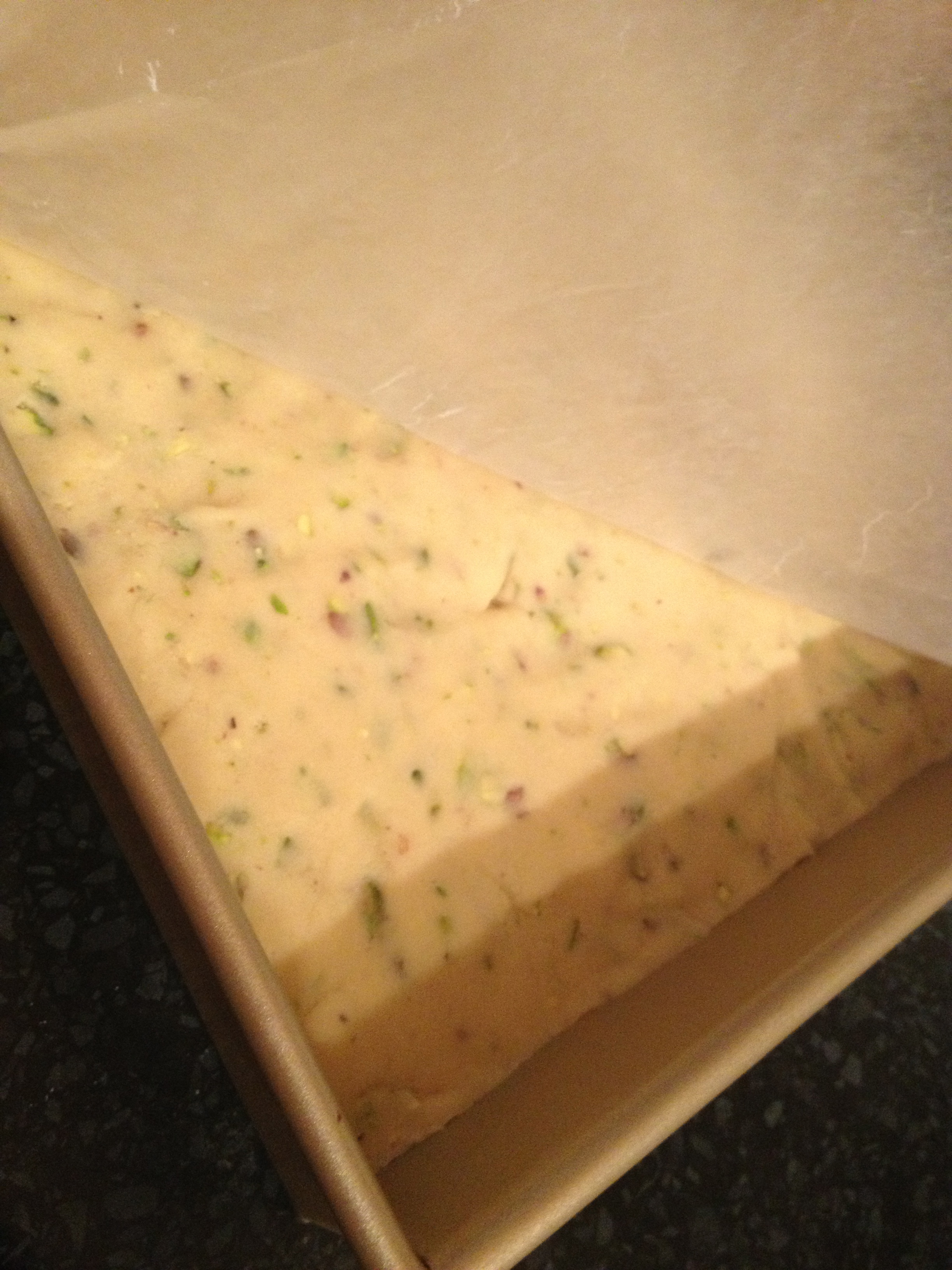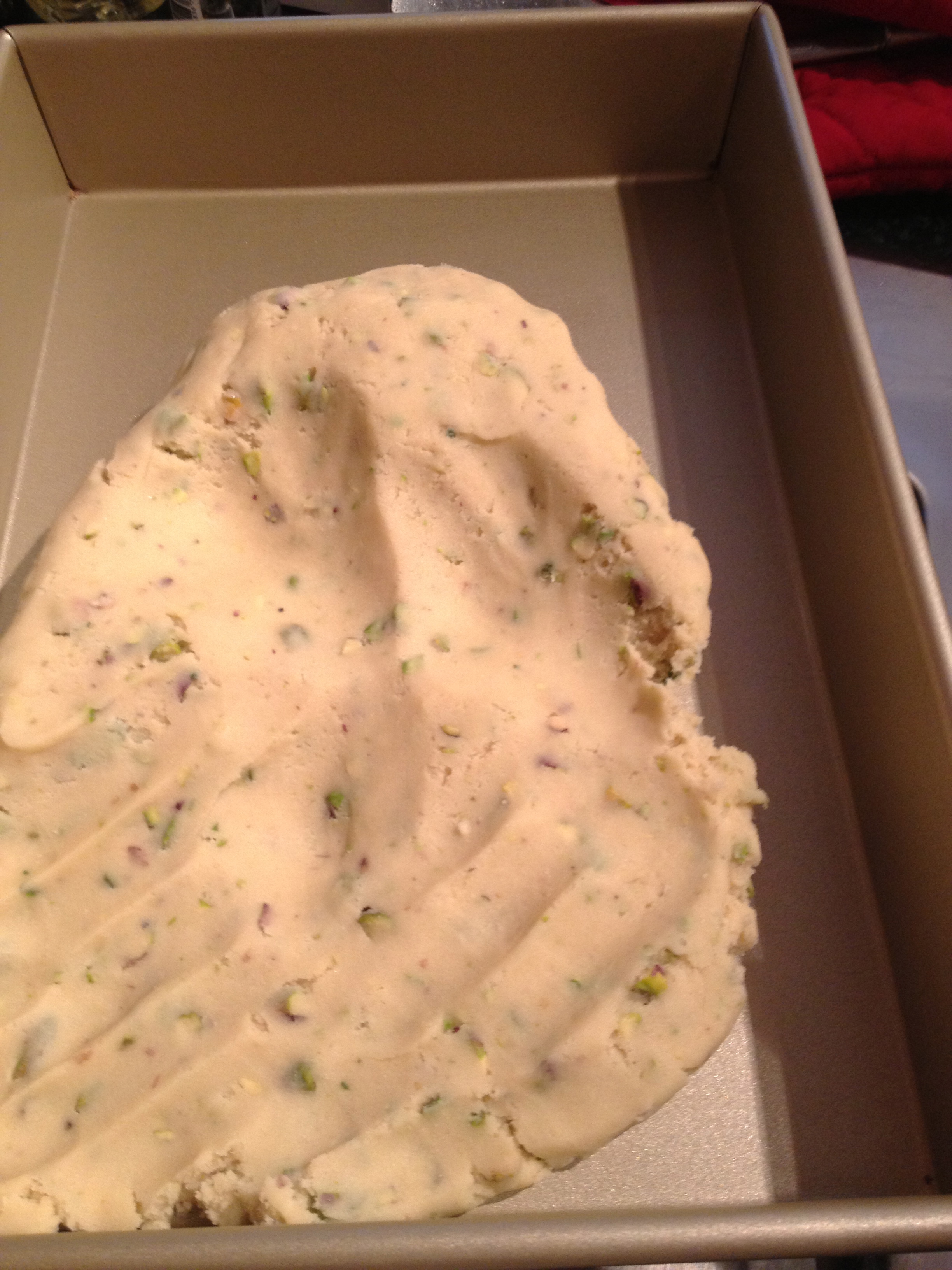 Cream the butter until smooth, using a handheld or standing mixer. Add the sugar, 1 ½ cups of flour, salt, and the finely chopped pistachios. Mix completely.