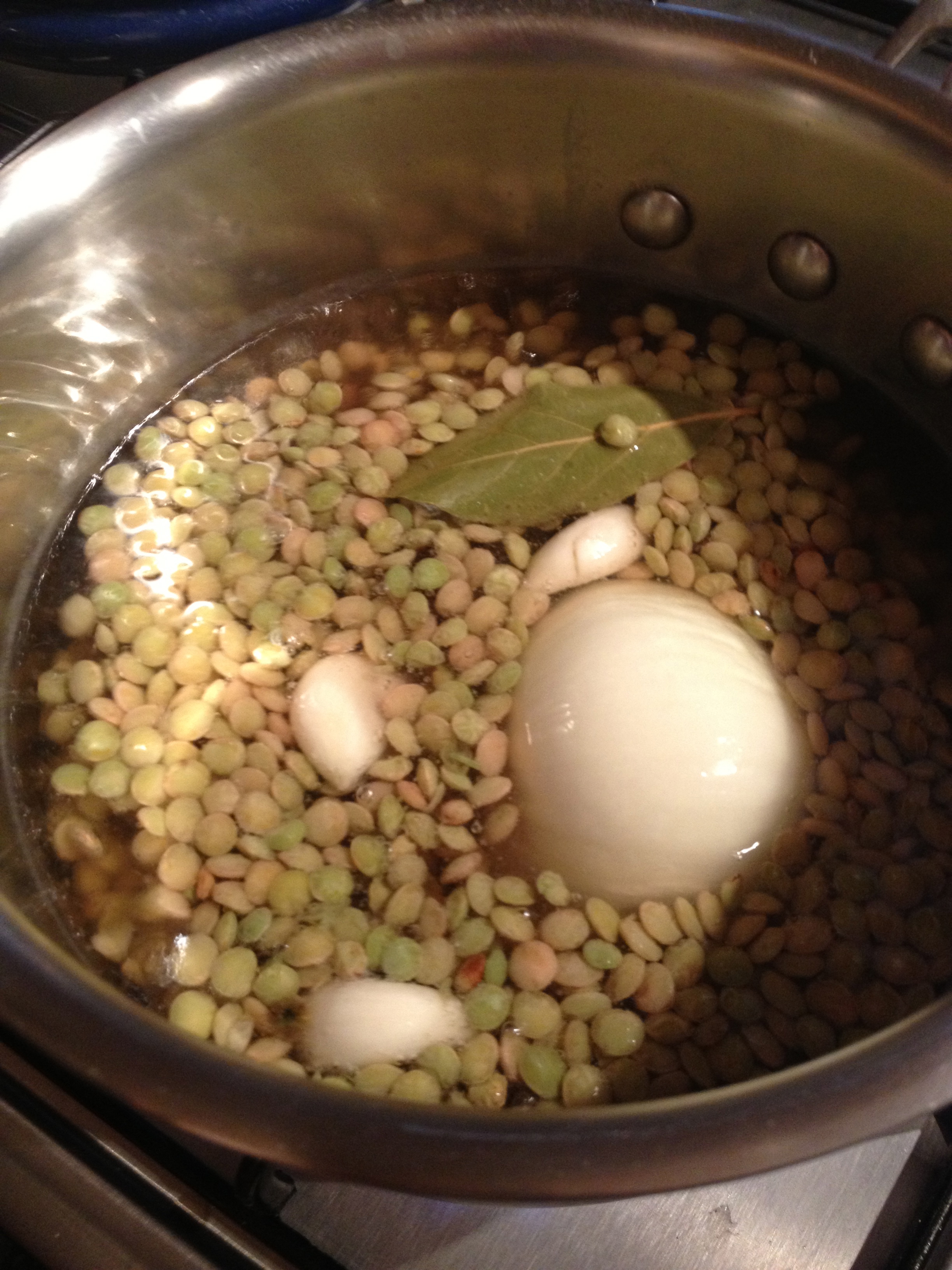 In a medium pot, bring 4 cups of water to a boil. Add the lentils, the entire half onion, the garlic, and the bay leaf. Reduce to a simmer and cook for 20 minutes.