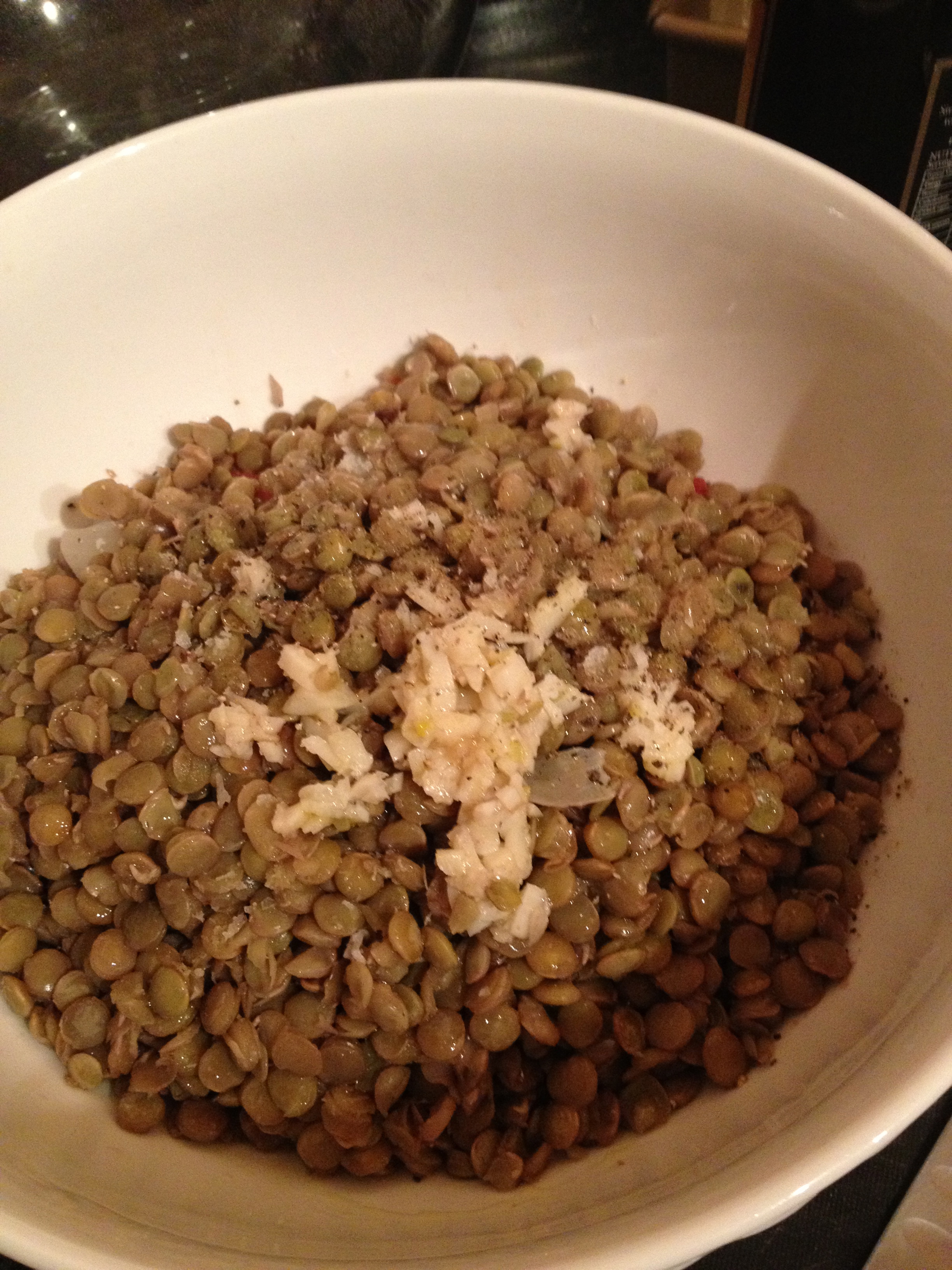 One trick from the cookbook was to simmer the lentils with a half onion, garlic cloves, and bay leaf. After cooking, I discarded the onion and bay leaf, but chopped the garlic and added it back to the salad.