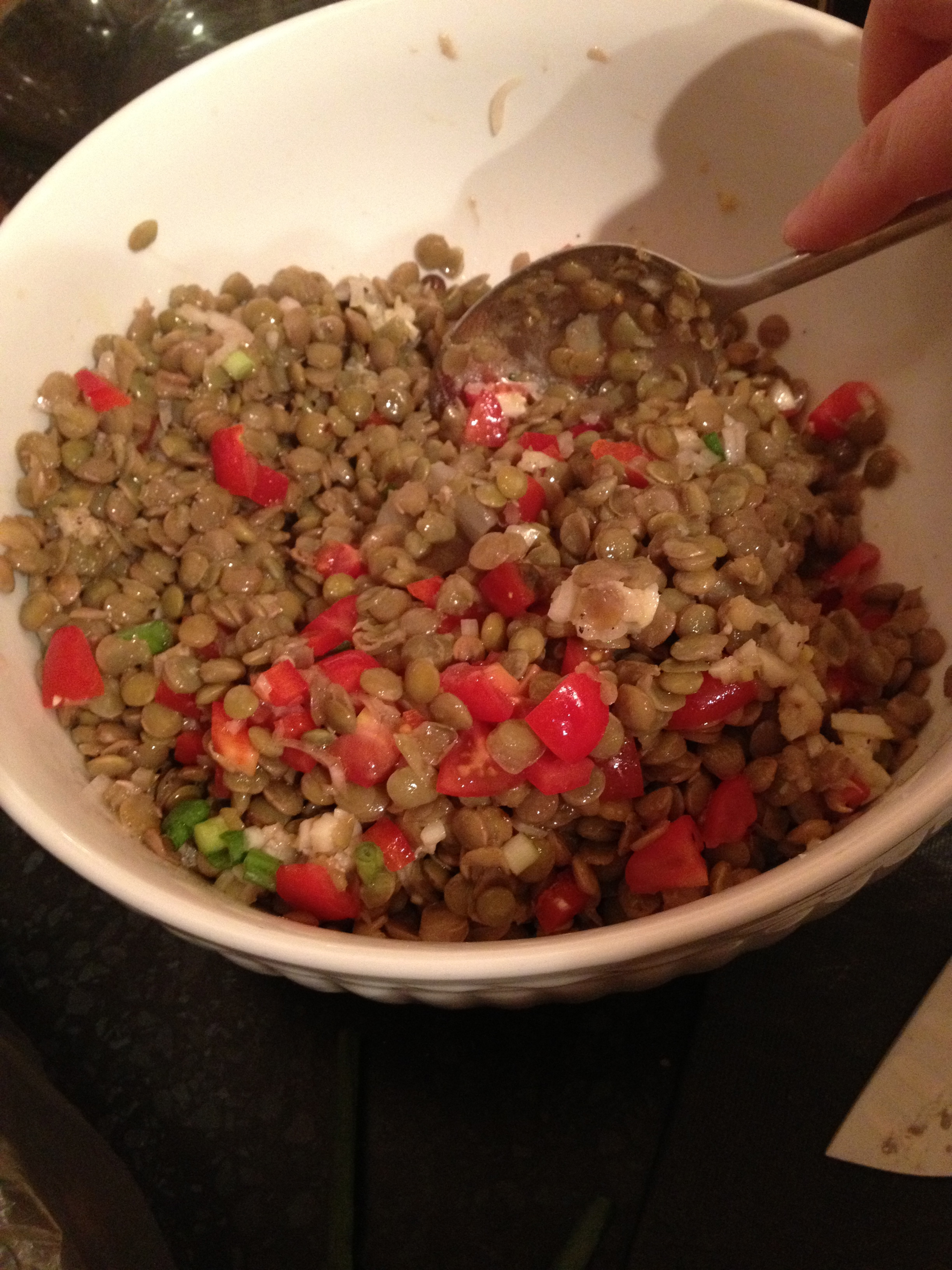 Drain the lentils. Remove the onion, garlic, and bay leaf, reserving the garlic. Chop the garlic cloves and add to a mixing bowl with the red pepper, tomato, shallot, and green onion. Add the lentils and mix.