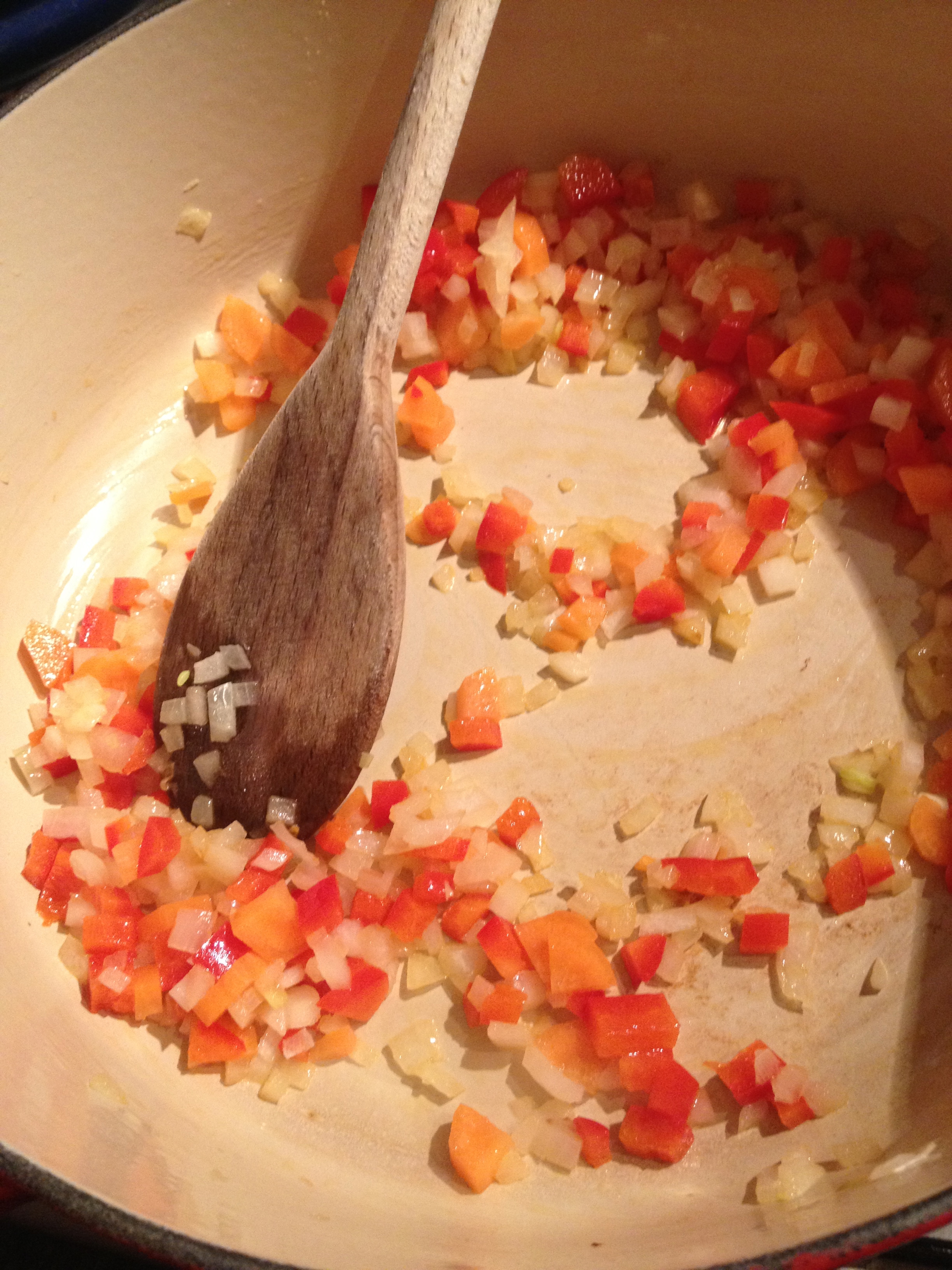 Start by sautéing onion, carrot, and red bell pepper. You could also add celery if you had it on hand. I just hate buying the whole bunch when all I need is one stalk. I know few people who actually like plain celery. Okay, I know one person: my cousin, Nick. He can happily eat an entire head of celery (are they called heads, bunches, hearts?) in one sitting.
