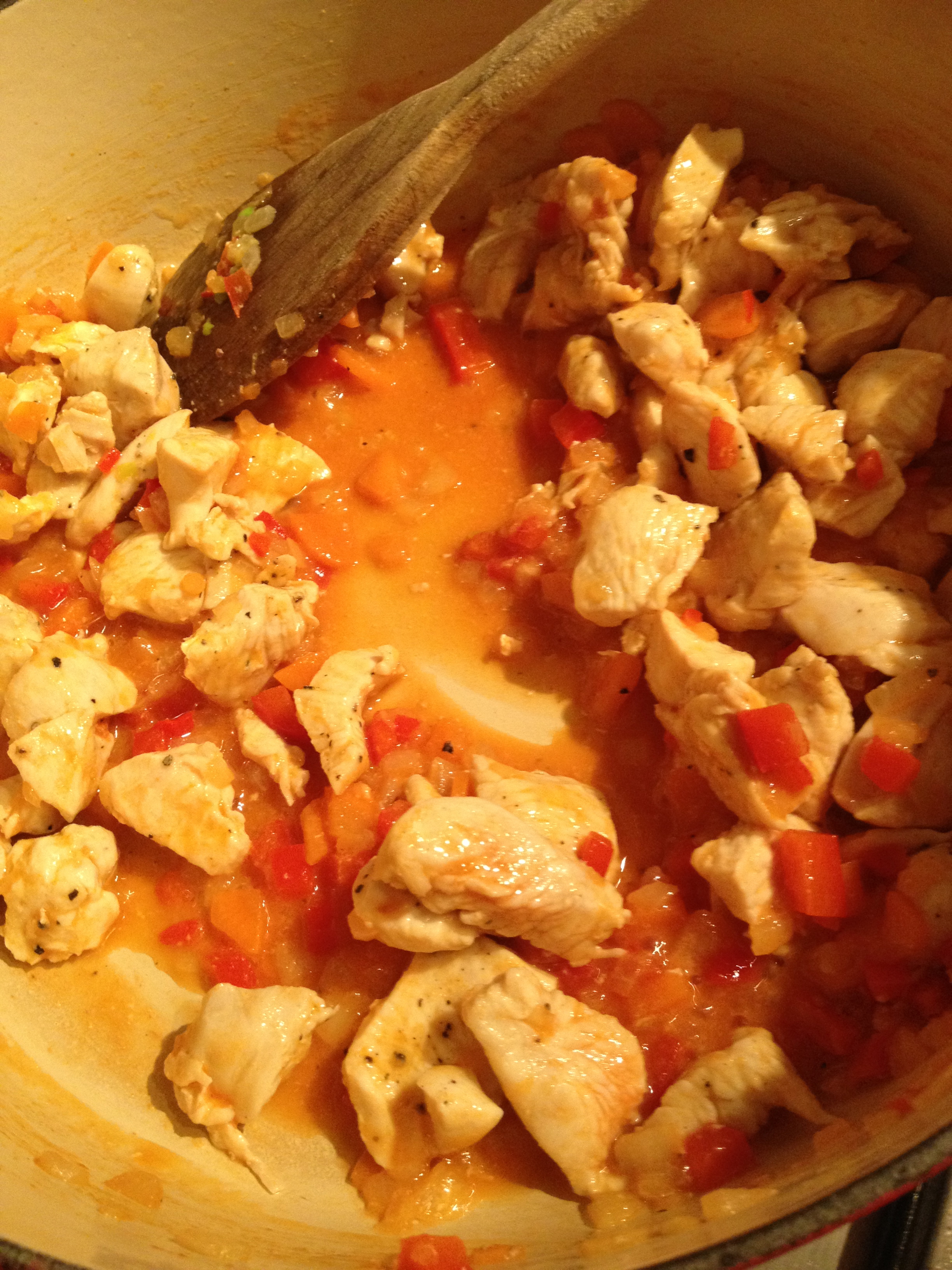 In a dutch oven, heat the olive oil over medium heat and sauté the onion and carrot. After 3 minutes, add the red pepper. Cook for an additional 2 minutes, then salt and pepper the chicken and add to the pot. Cook for 5 minutes. Then add the tomato paste and deglaze with the white wine. Add the chicken broth and simmer for 10 minutes.