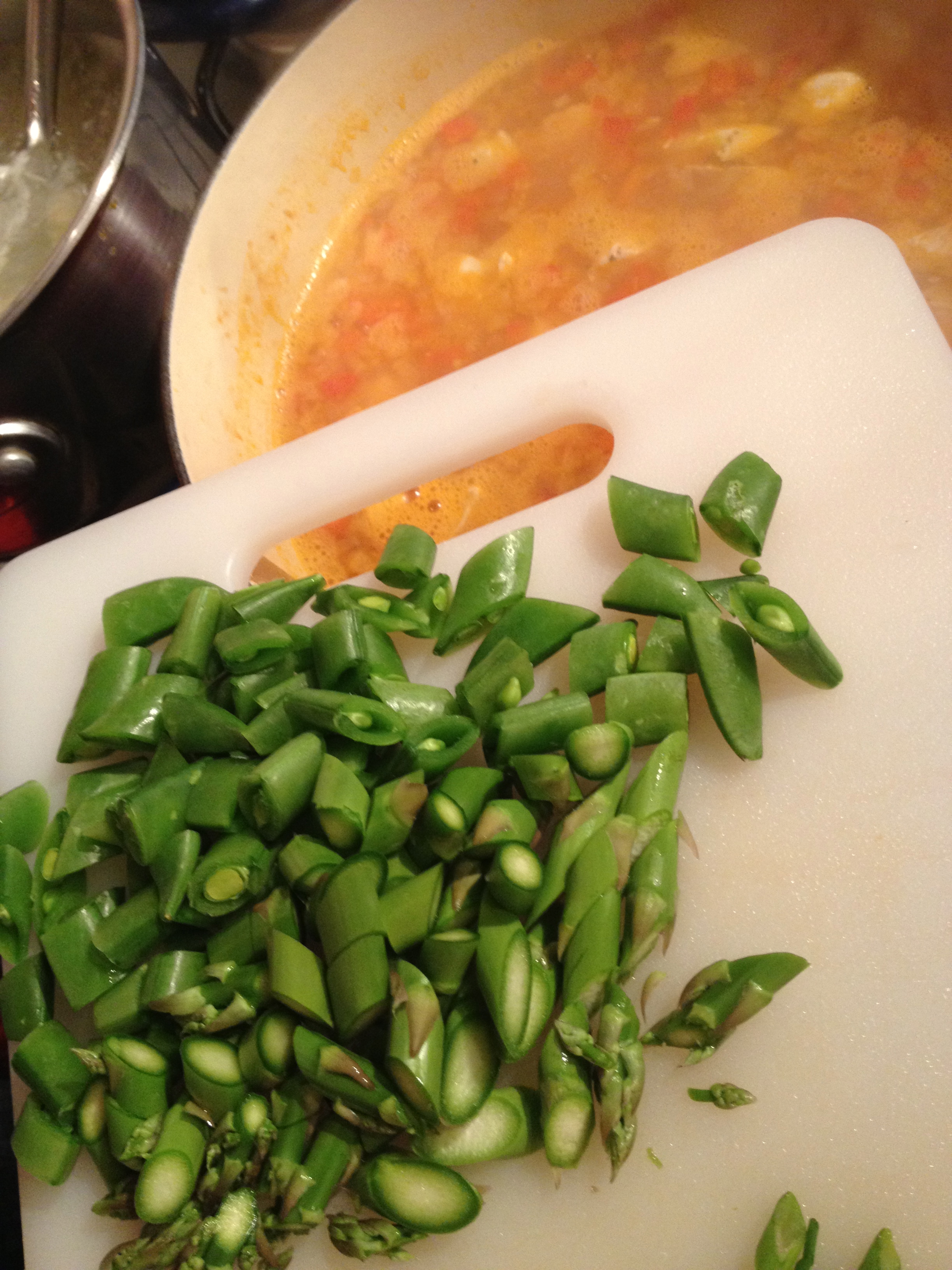 I’m not going to lie, the last canned chicken noodle soup I bought had the consistency of snot and pieces of corn floating in it. I am not willing to take the risk again. So yesterday, before any real illness struck, I set off to the store to buy chicken and noodles. Then I remembered that I had some asparagus that I should use up. And red pepper. And spring onions. So the next thing I knew I was breaking my own rule and making a fancier version of this comfort classic.